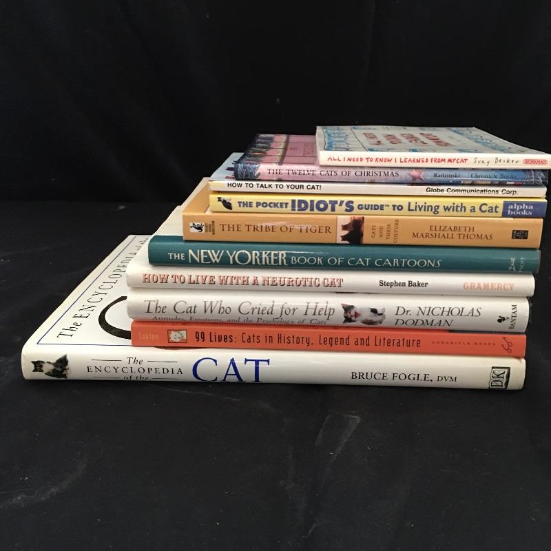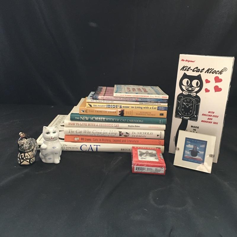 Cat lovers collection. Lot includes two small cats, cards, Kit Kat Klock and a nice selection of books about cats.