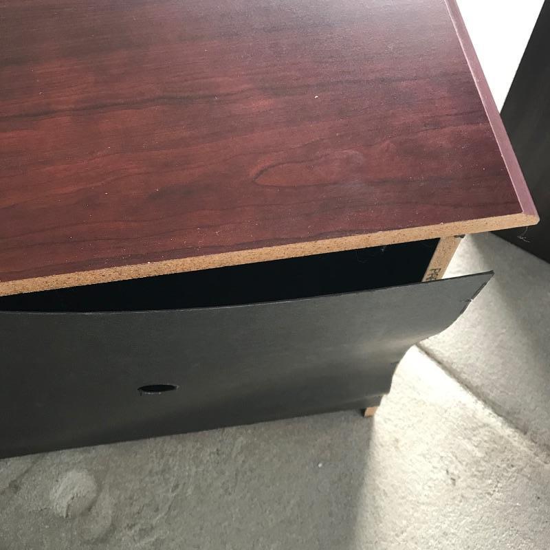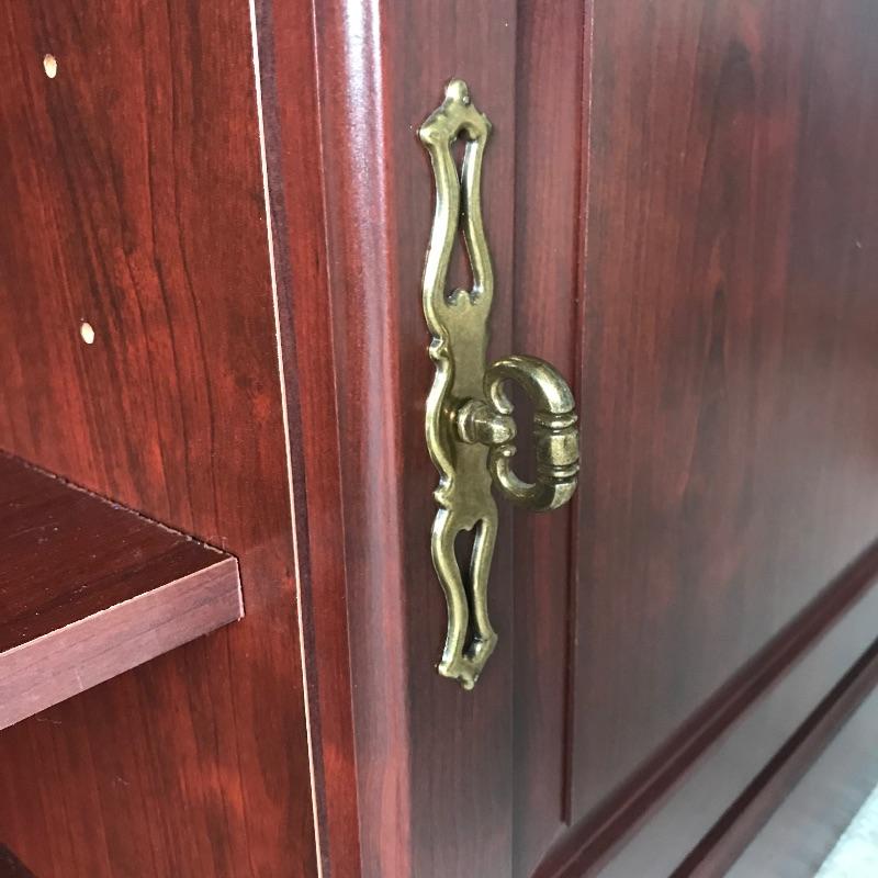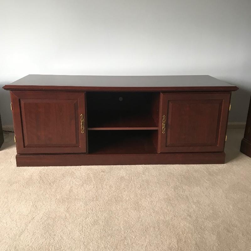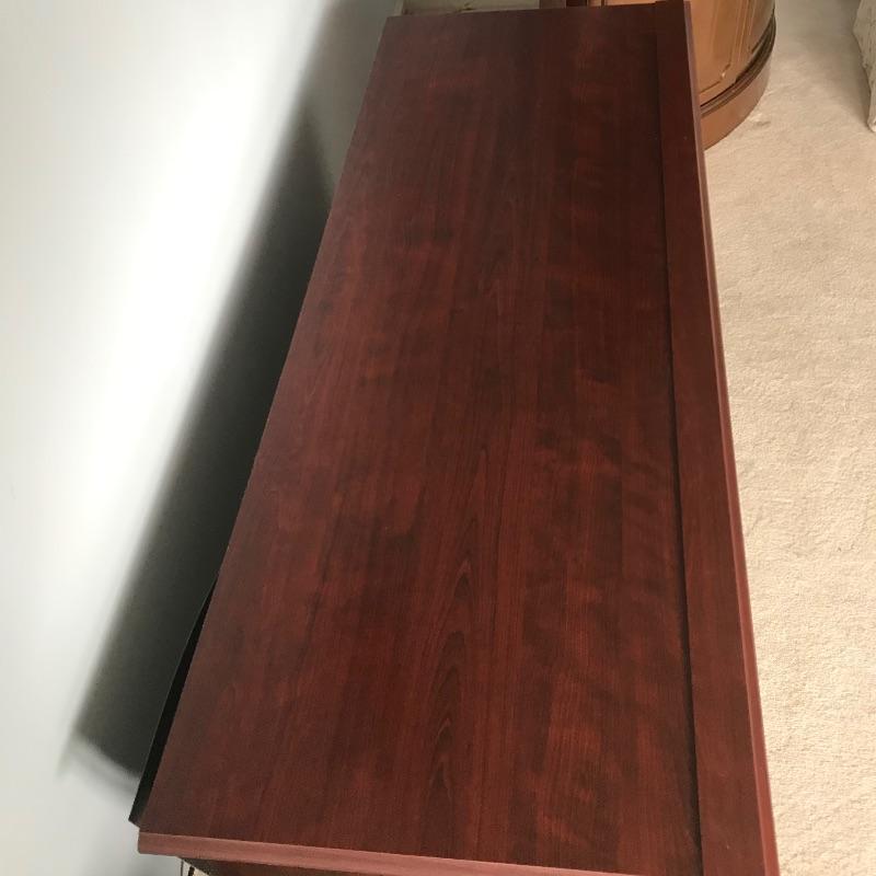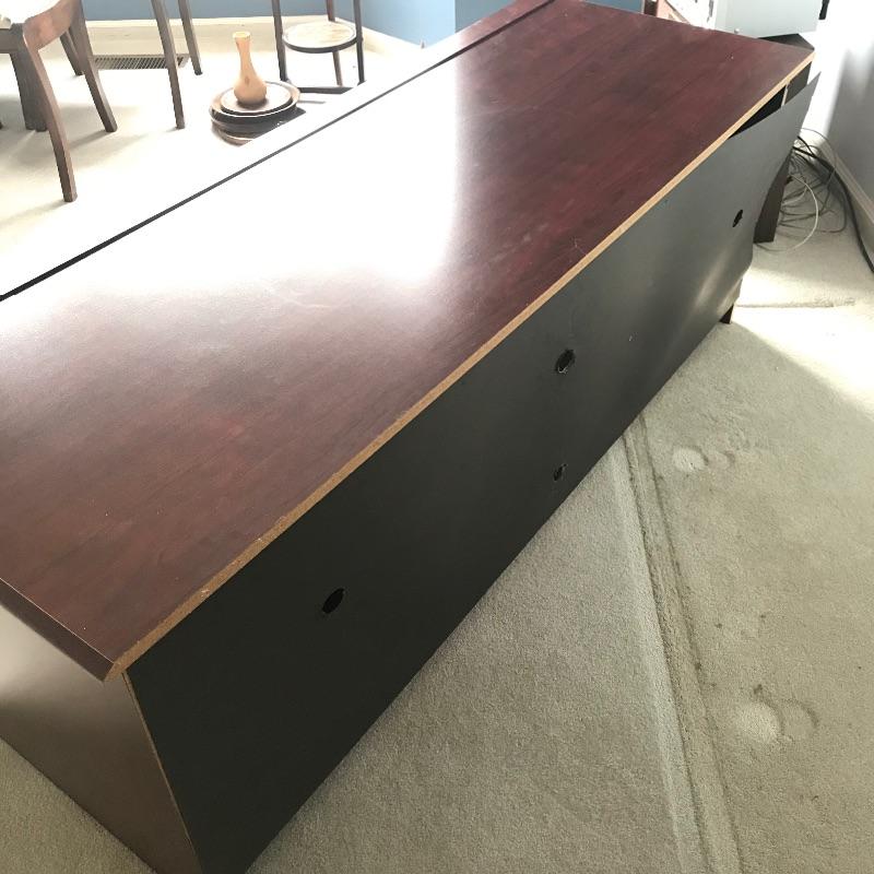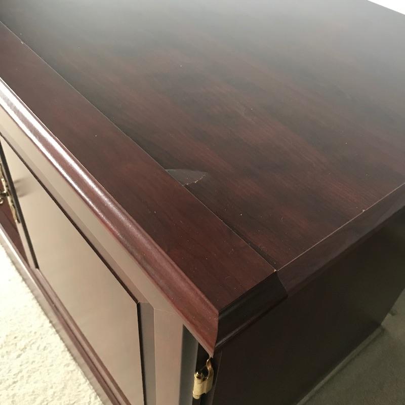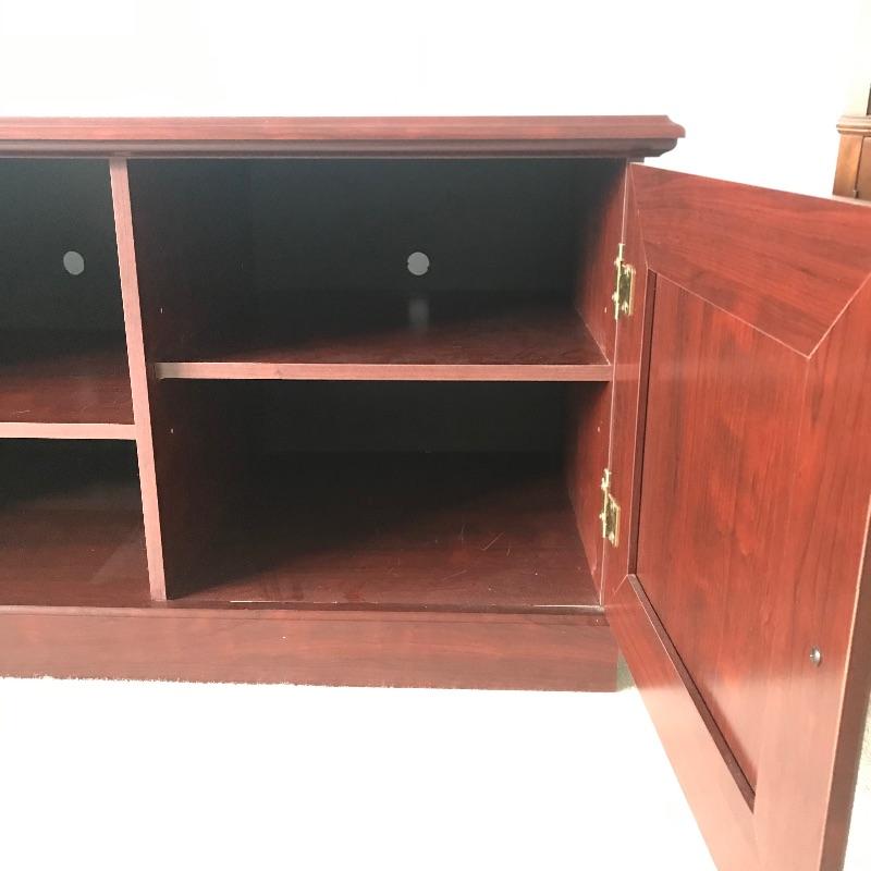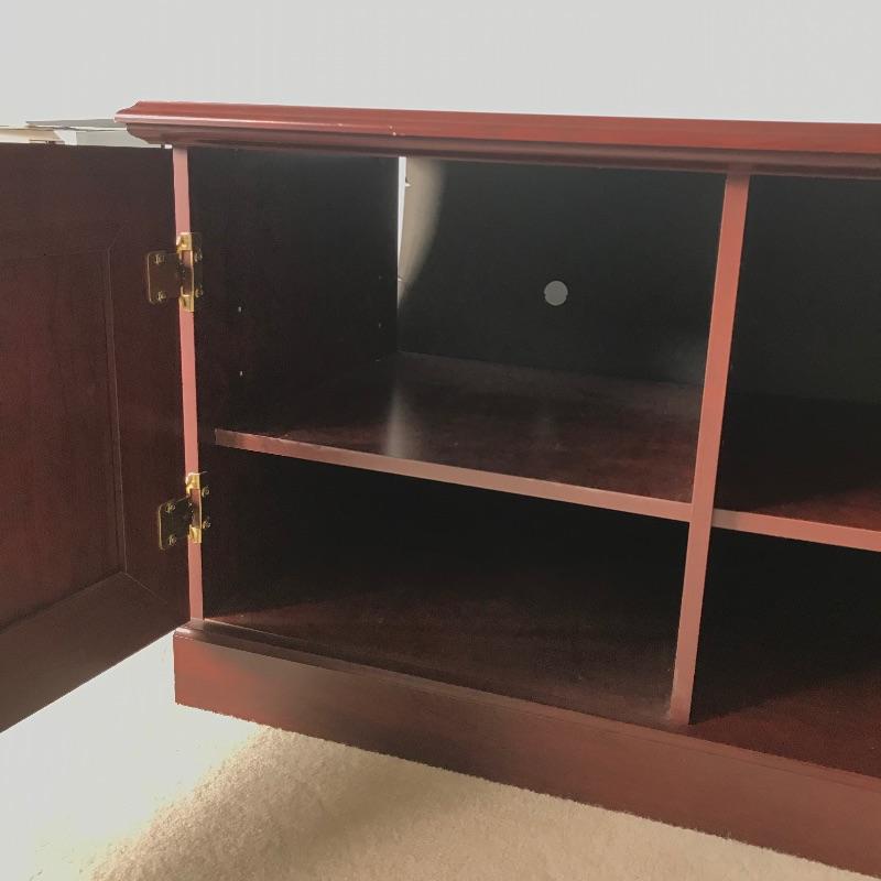 Nicely red hued TV console table with two cabinets and a shelf for your entertainment needs. All shelves are height adjustable. Piece appears to be mostly particle board and hardwares appears to be brass. The back board has come apart on one corner and there is a slight bulge near the front top frame noticeable only when up close, see photos. Piece measures approximately 59.5” x 22” x 23”. No shipping.