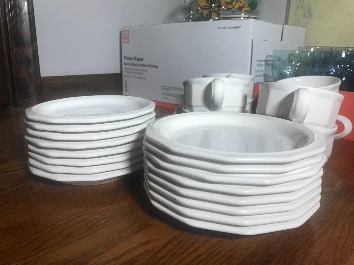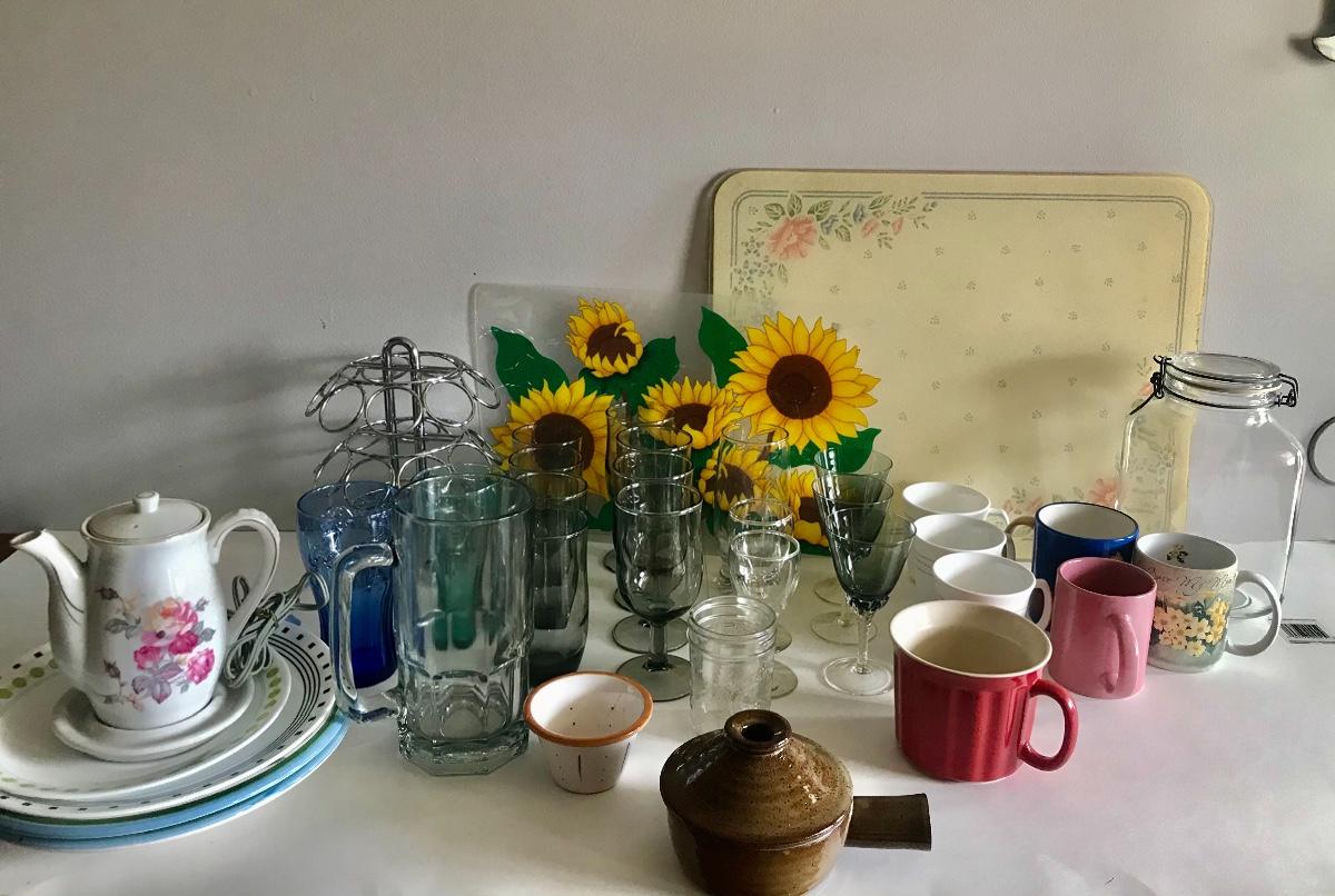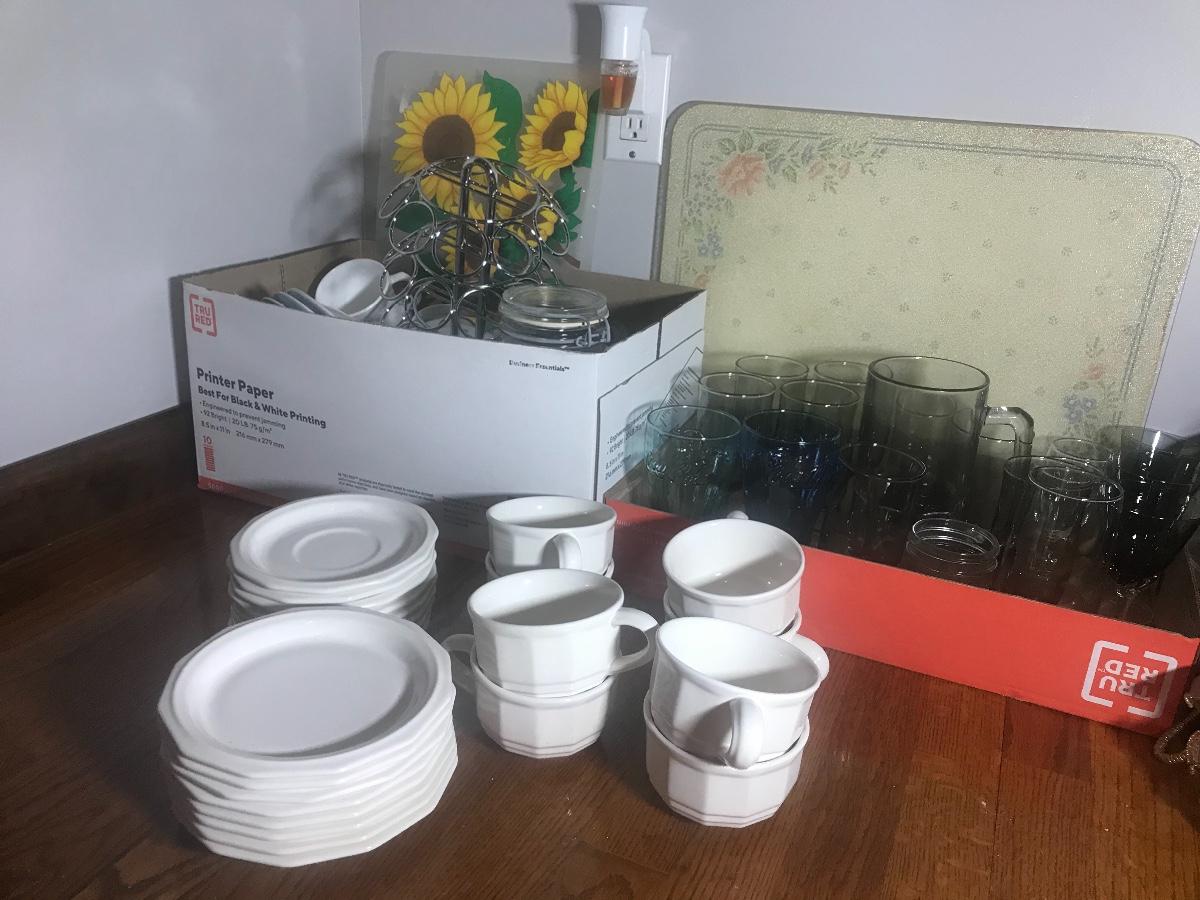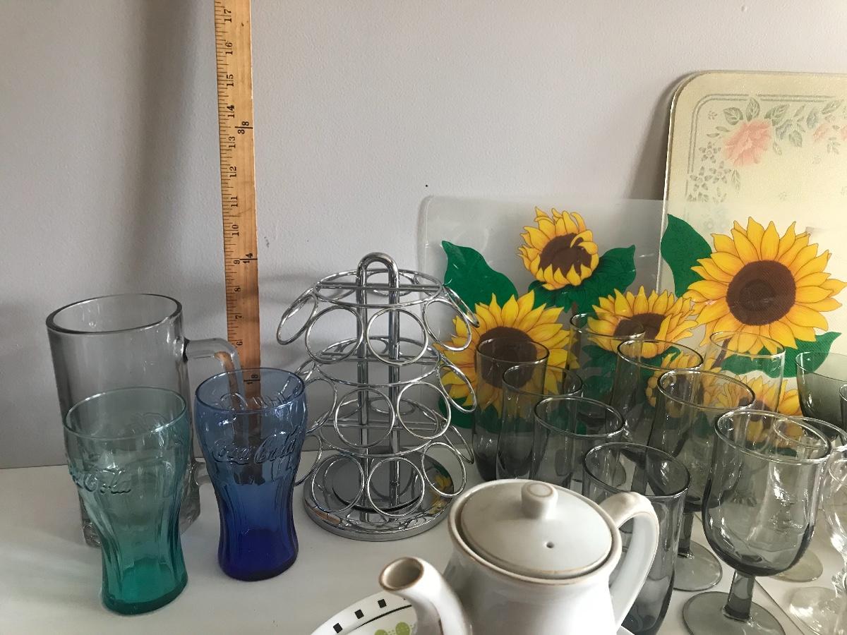 Crystal stemware, glass counter board, replacement plates, Pfaltzgraff cups, saucers, and salad plates, glasses, including one blue and one green Coke glasses, glass Fidenza jar made in Italy, and more. Located in basement. Please see all pictures for content of the lot, condition of the lot, and measurements if taken. Pictures are the best representation of the items listed and items are untested unless indicated in description. Thank you for looking and have fun bidding!
