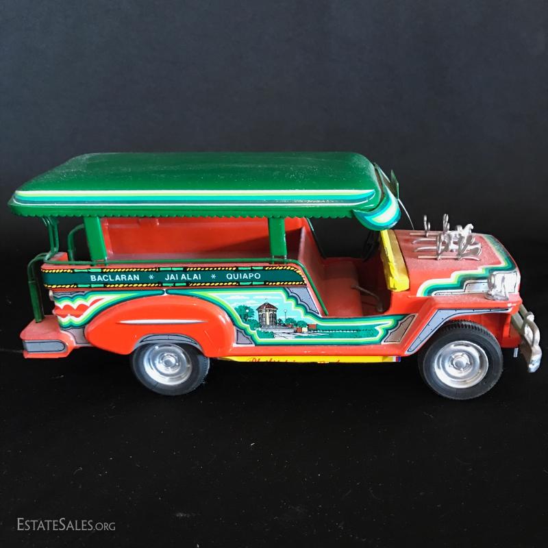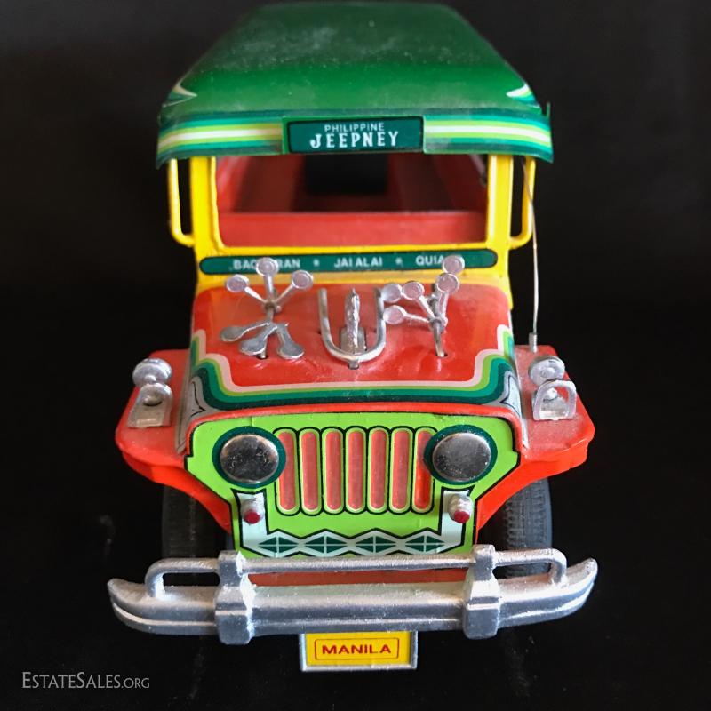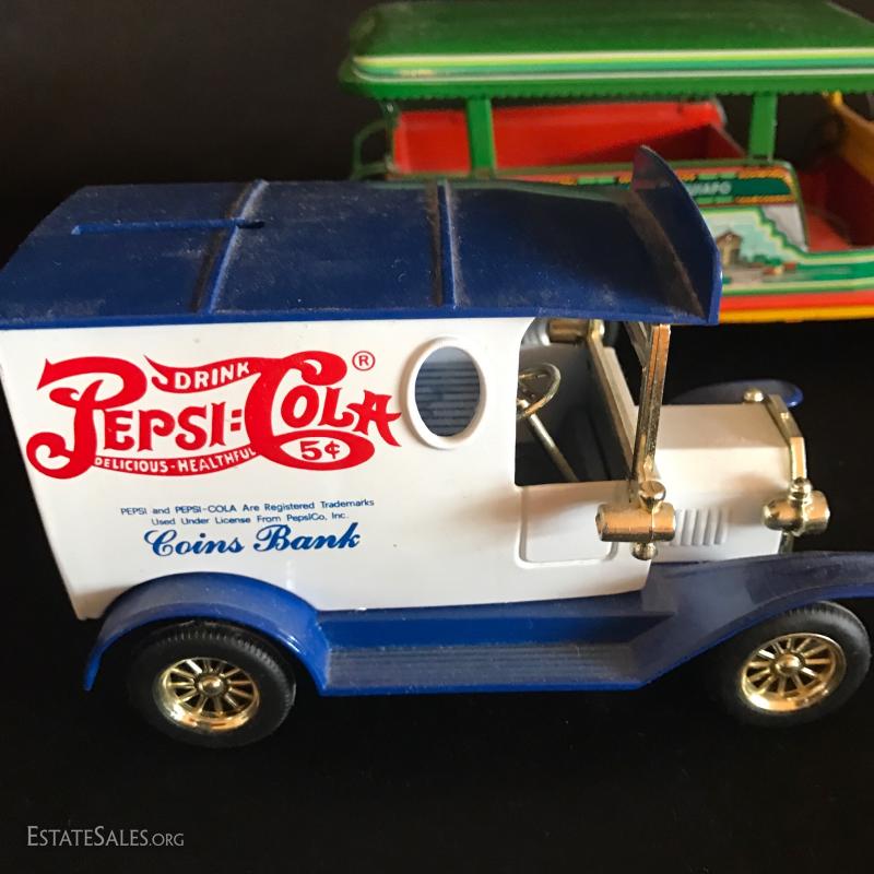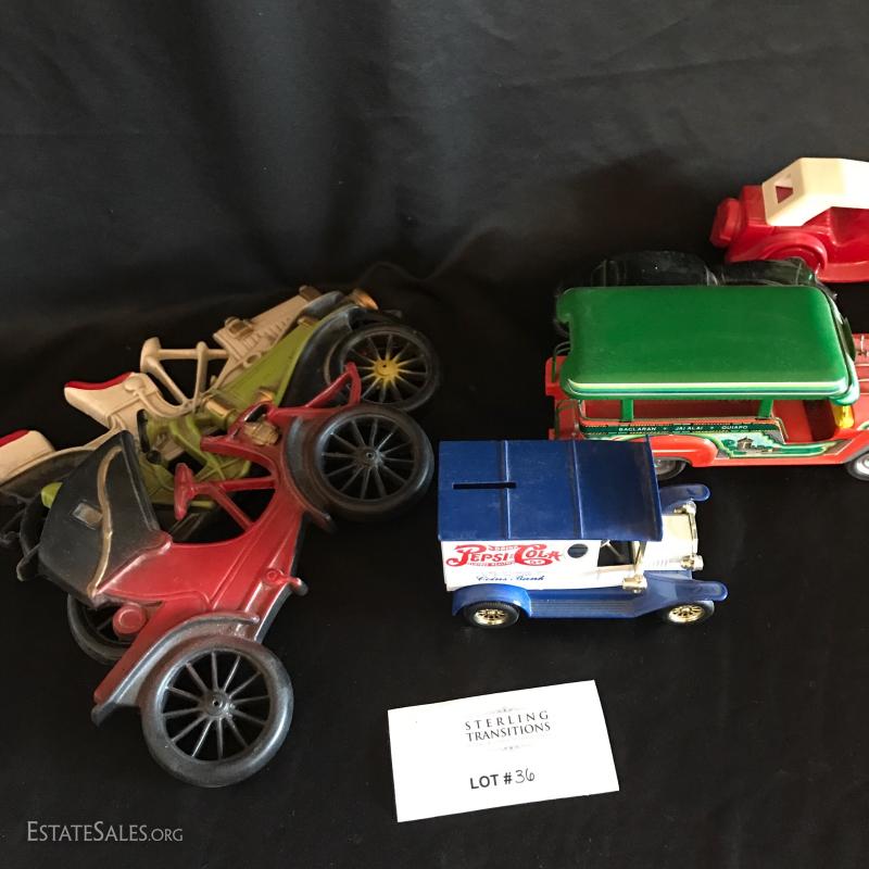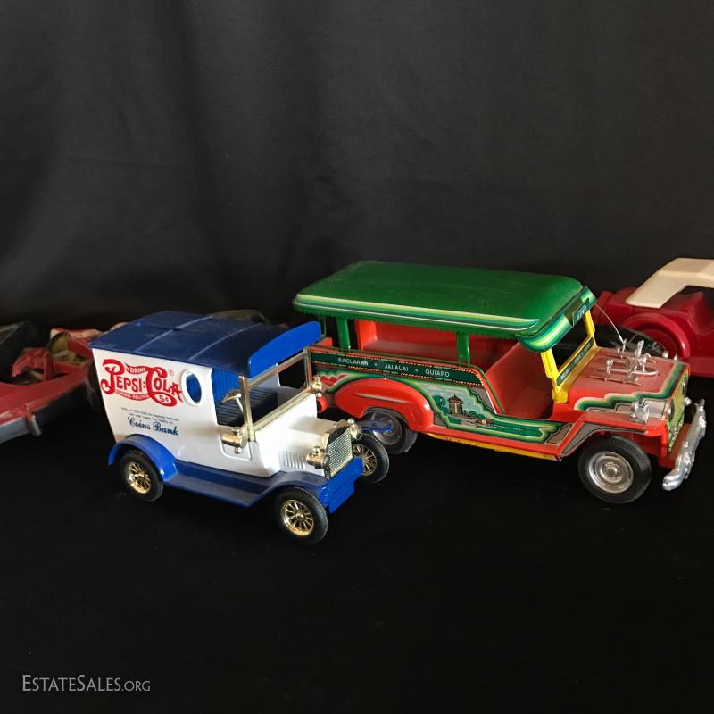 Metal and Plastic Philippine Jeepney Model Taxi, Ceramic 1936 MG Avon Tai Winds Aftershave Container, Plastic and Metal Pepsi Cola Delivery