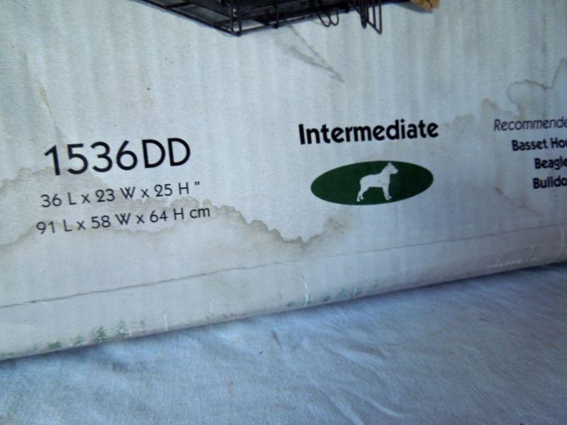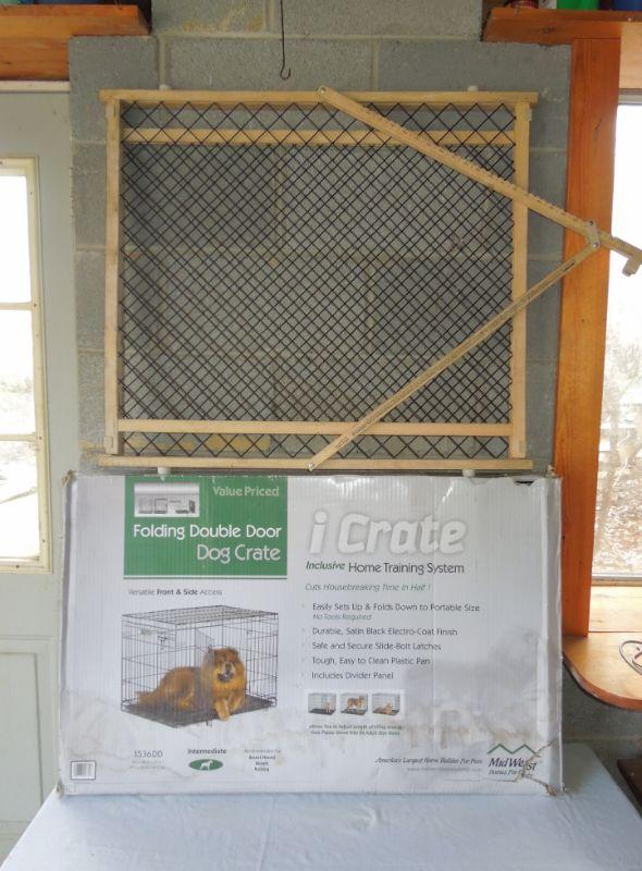 Folding double door iCrate model 1536DD 36" x 23" x 25"; an adjustable wood dog gate; and a balck metal tube adjustable dog barrier for car (not pictured).