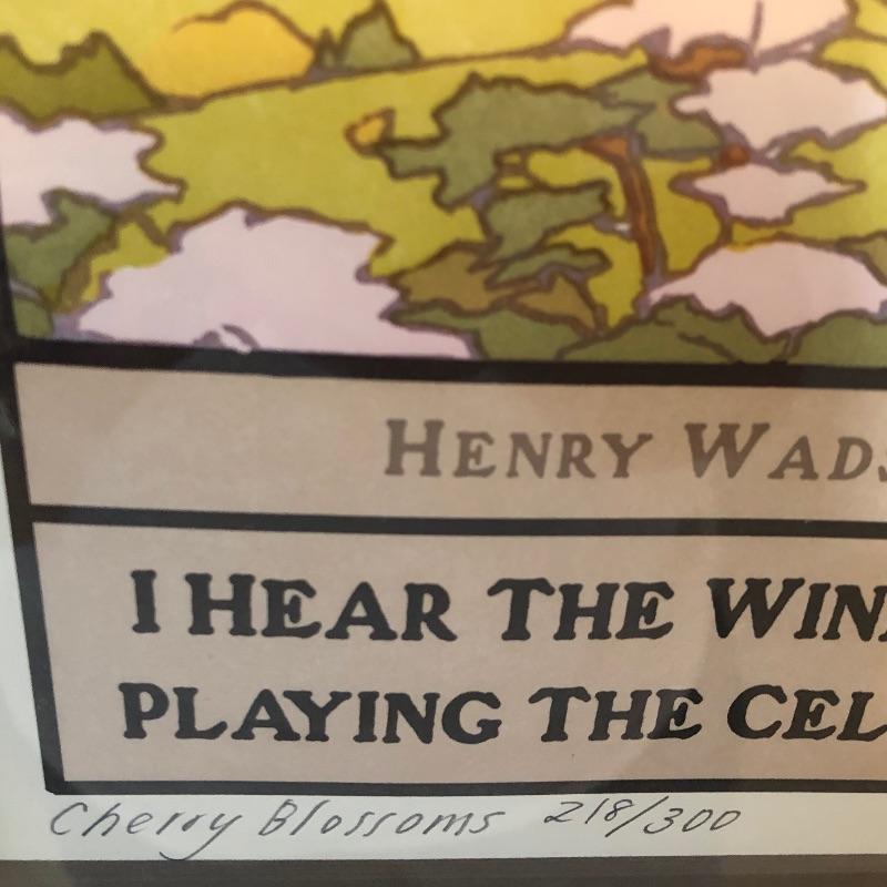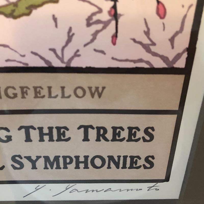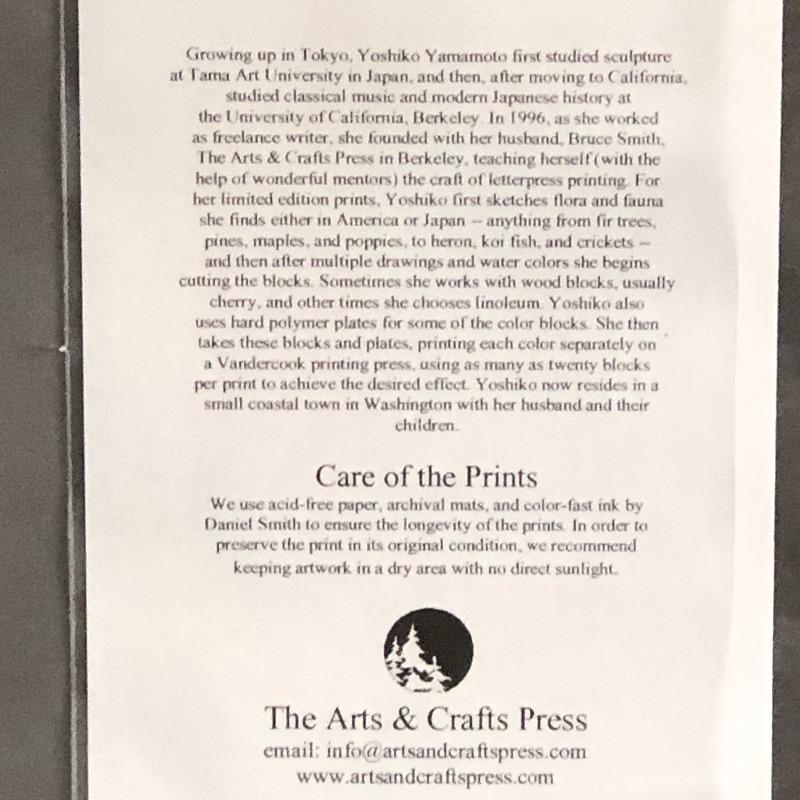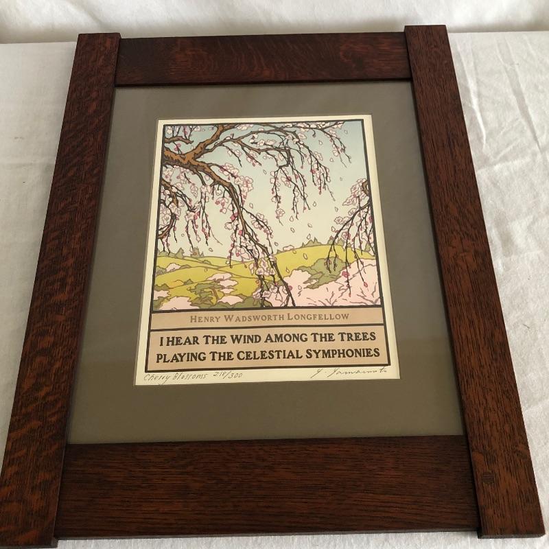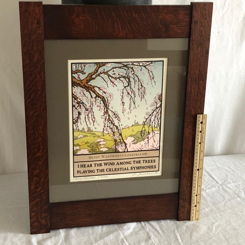This signed print is # 218 of 300 “˜Cherry Blossoms’ by Yoshiko Yamamoto Arts & Crafts Press. The solid arts & crafts style frame compliments her beautiful work.