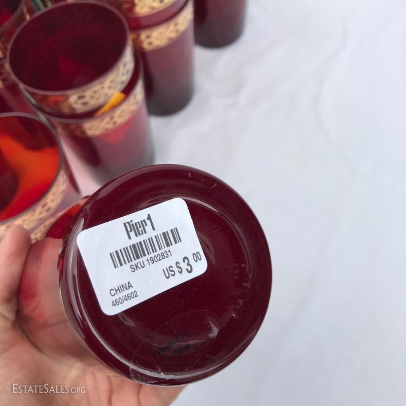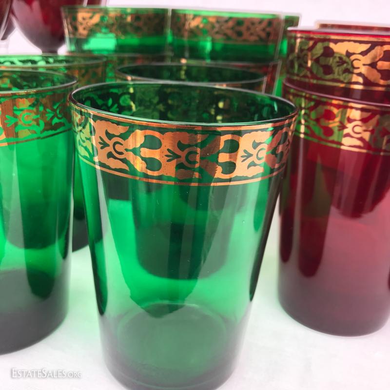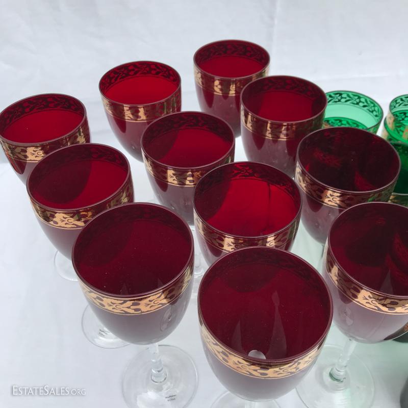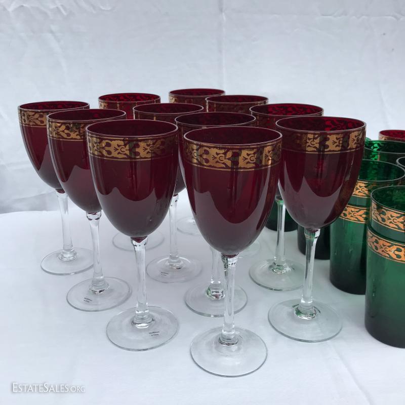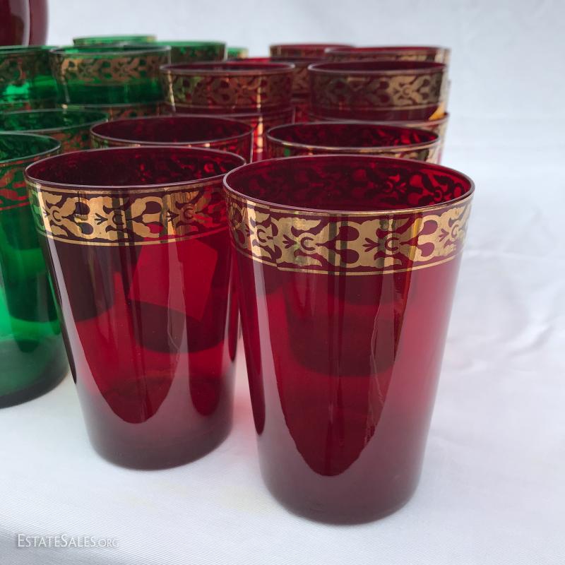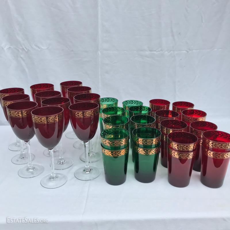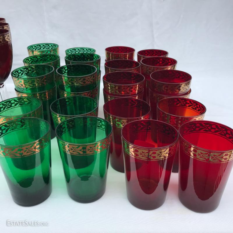 Spice up the Christmas party with this red and green glassware. Cute gold trim on each glass. Purchased at Pier One. 16 red tumblers, 16 green tumblers, 11 wine glasses. No shipping. Local pick up only in Asheville, NC.