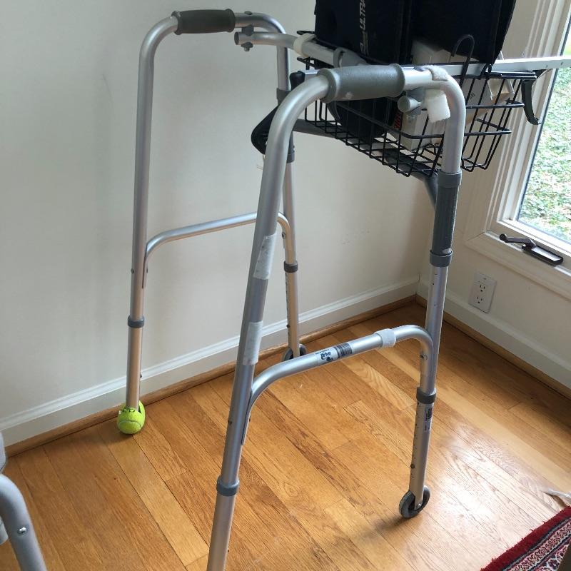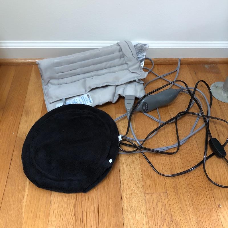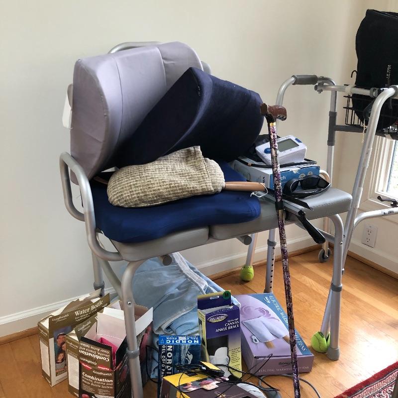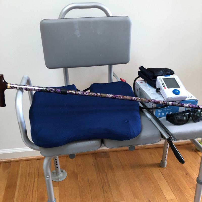 Make yourself comfortable with this collection of home health products. Lot includes shower chair, Walker, seat pads, heating pads, digital audio monitor, electric hand warmers, back pads, grabber, long shoehorn and more. All electric items powered on when tested.