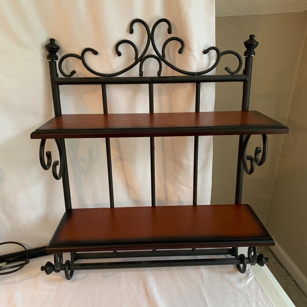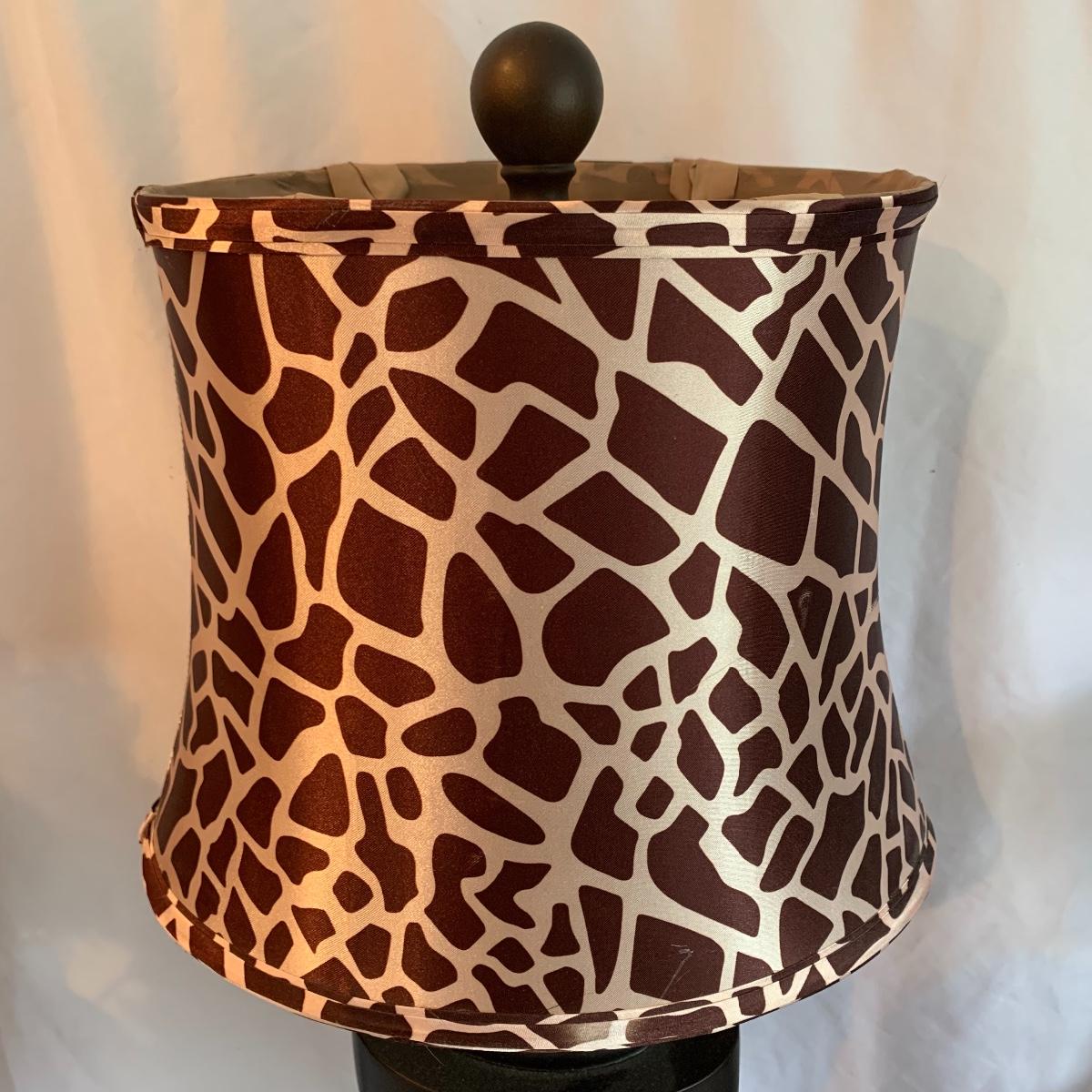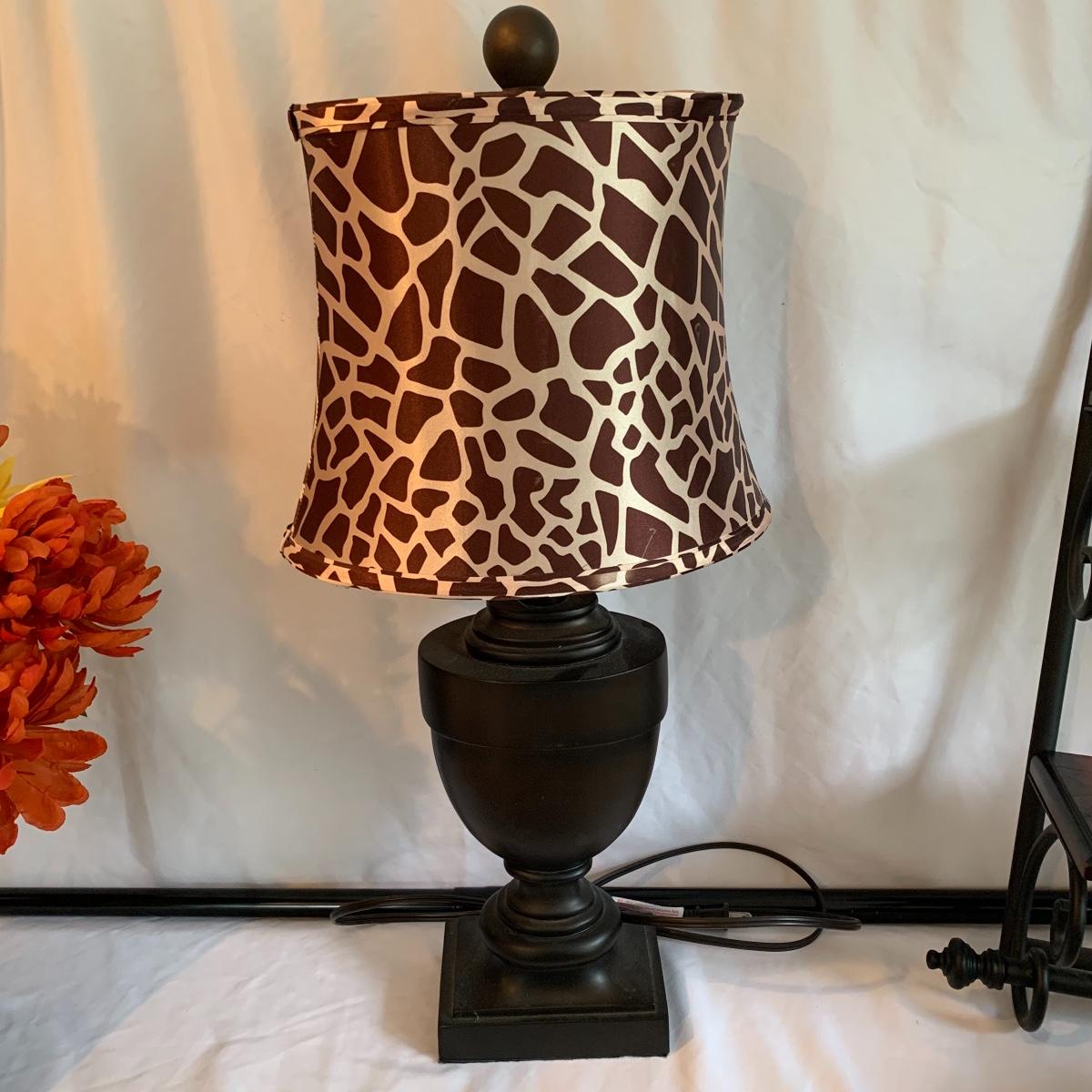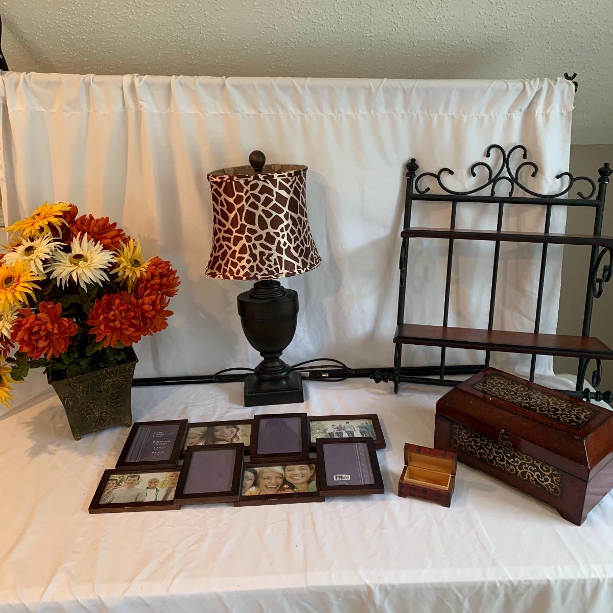 These items look great together. Lot 36 consisted of a lamp with a giraffe pattern on the shade, a new picture frame, a wall shelf with towel bar, a faux flower arrangement, and two boxes, one large (12.5' x 7" x 7") and one small. Local pickup only. Shelf measures 24"wide x 7' deep by 24" high