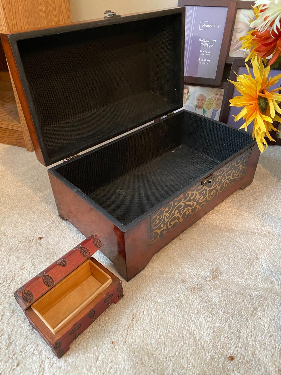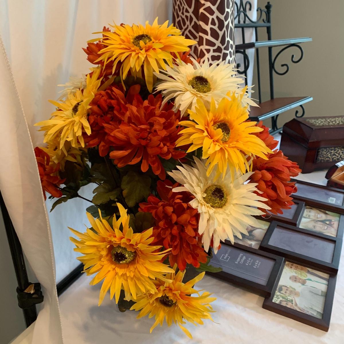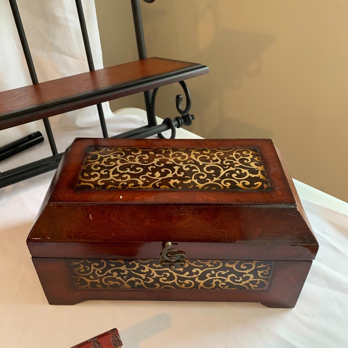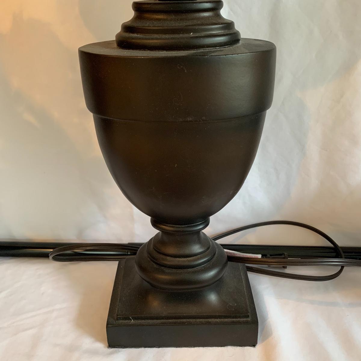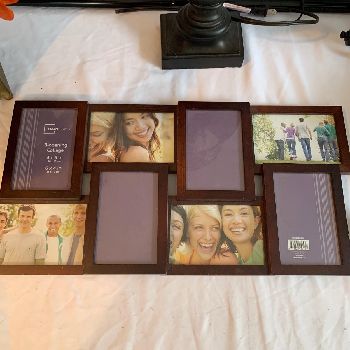 These items look great together. Lot 36 consisted of a lamp with a giraffe pattern on the shade, a new picture frame, a wall shelf with towel bar, a faux flower arrangement, and two boxes, one large (12.5' x 7" x 7") and one small. Local pickup only. Shelf measures 24"wide x 7' deep by 24" high