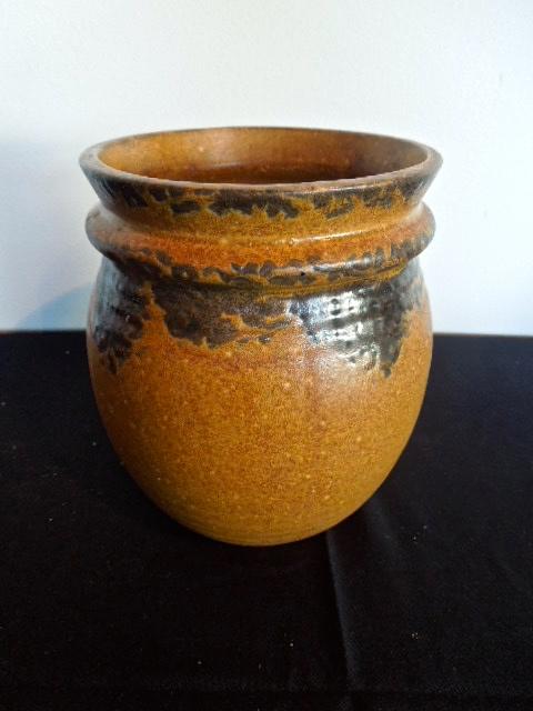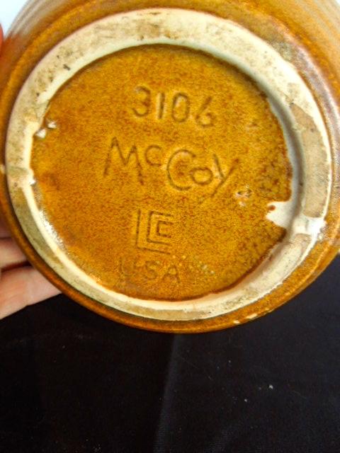 Marked "McCoy 3106 LCC". From the mid 1970's..Ceramic pottery vase with brown and tan mottled glaze. Measures 7" high. Can be used for kitchen utensils or planter.