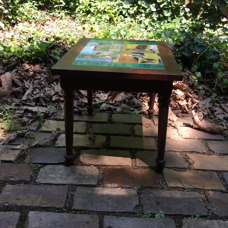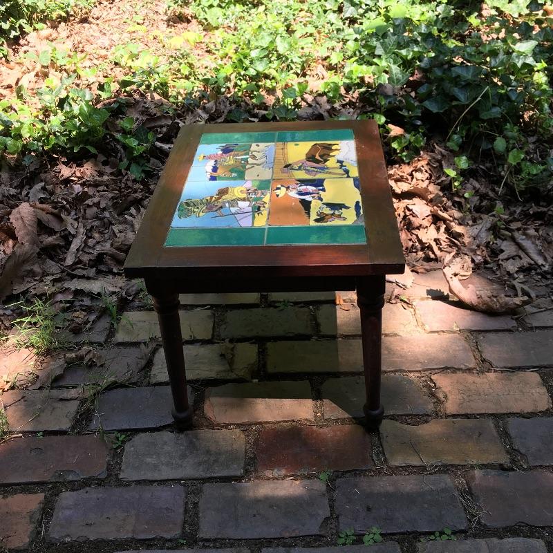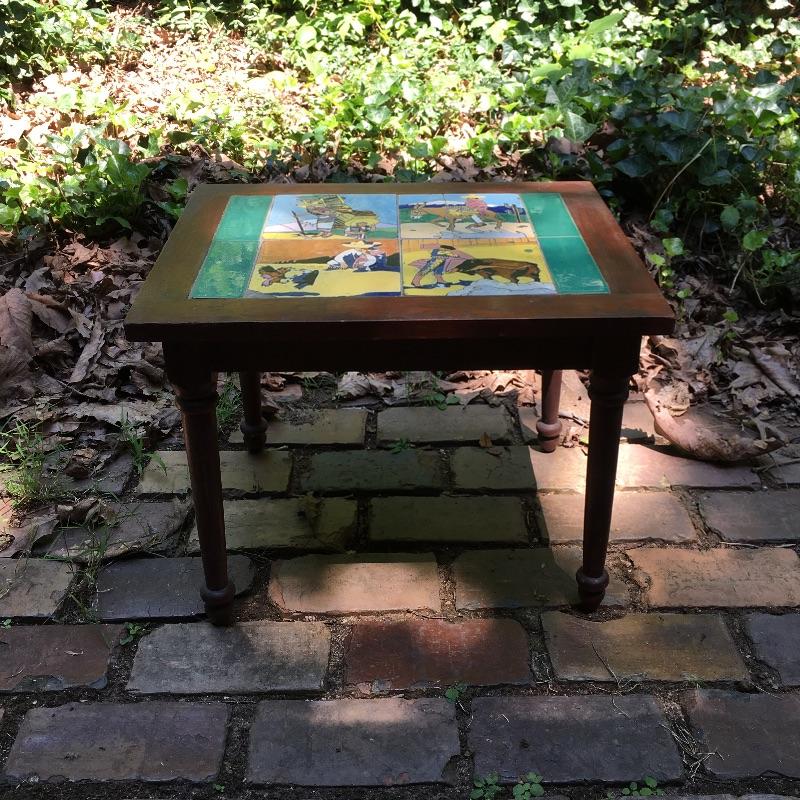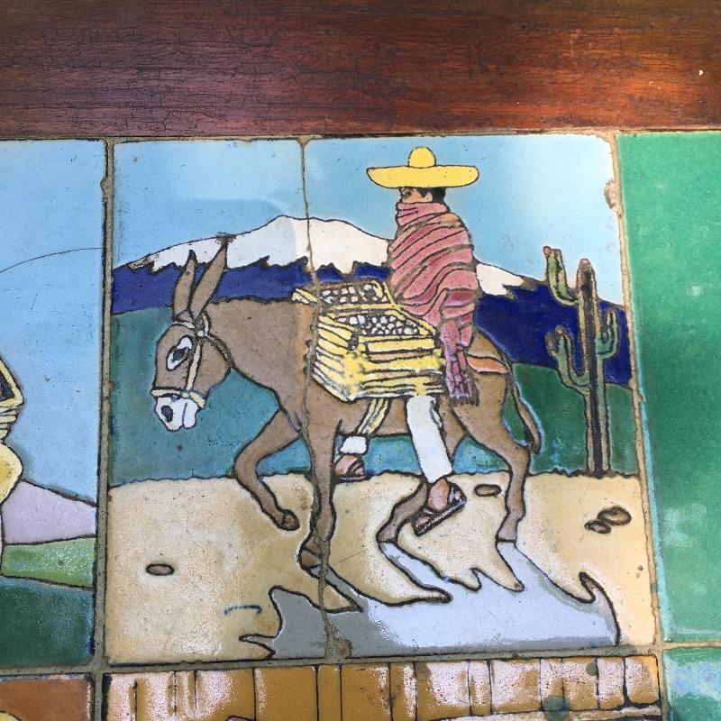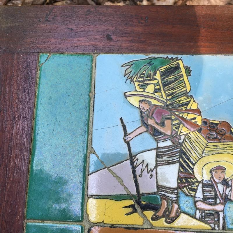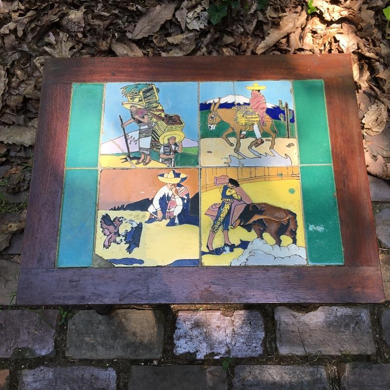 Arriba Arriba, take a look at this beautiful Mexican tile top table. Table is much heavier than it appears. This unique table comes with four different tiles depicting life in Mexico. Three tiles have cracks, see pictures. Table measures 16.5” x 20.5” x 16”.