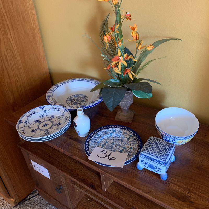LOT 36. PLATES, CERAMIC BOX, MISC HOME DECOR