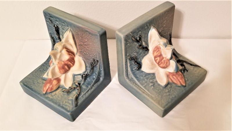 Pair of nice ROSEVILLE pottery bookends in the Magnolia pattern. Pattern introduced in 1943. Good condition. 5" tall, 4.5" long.