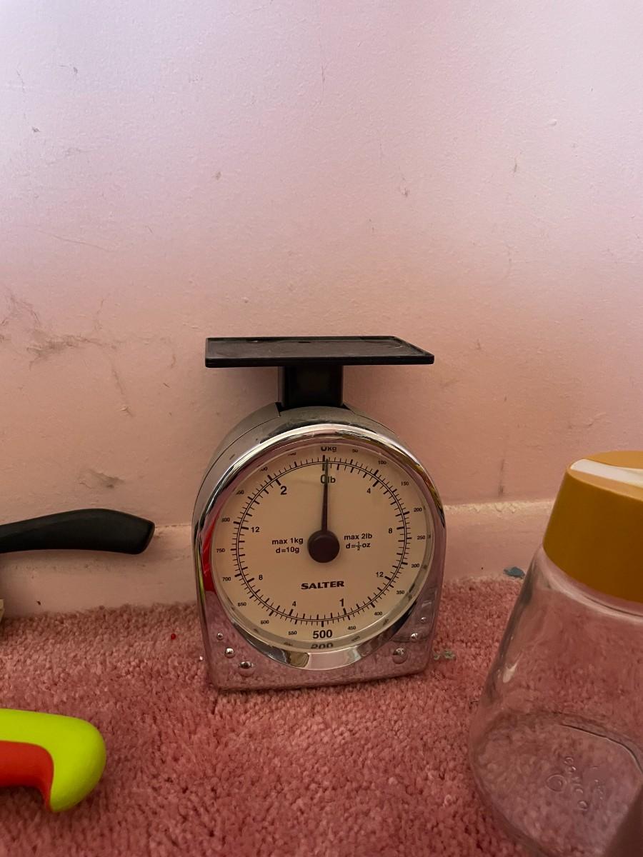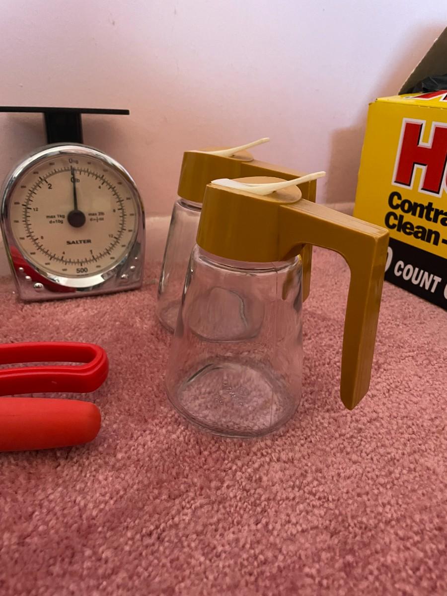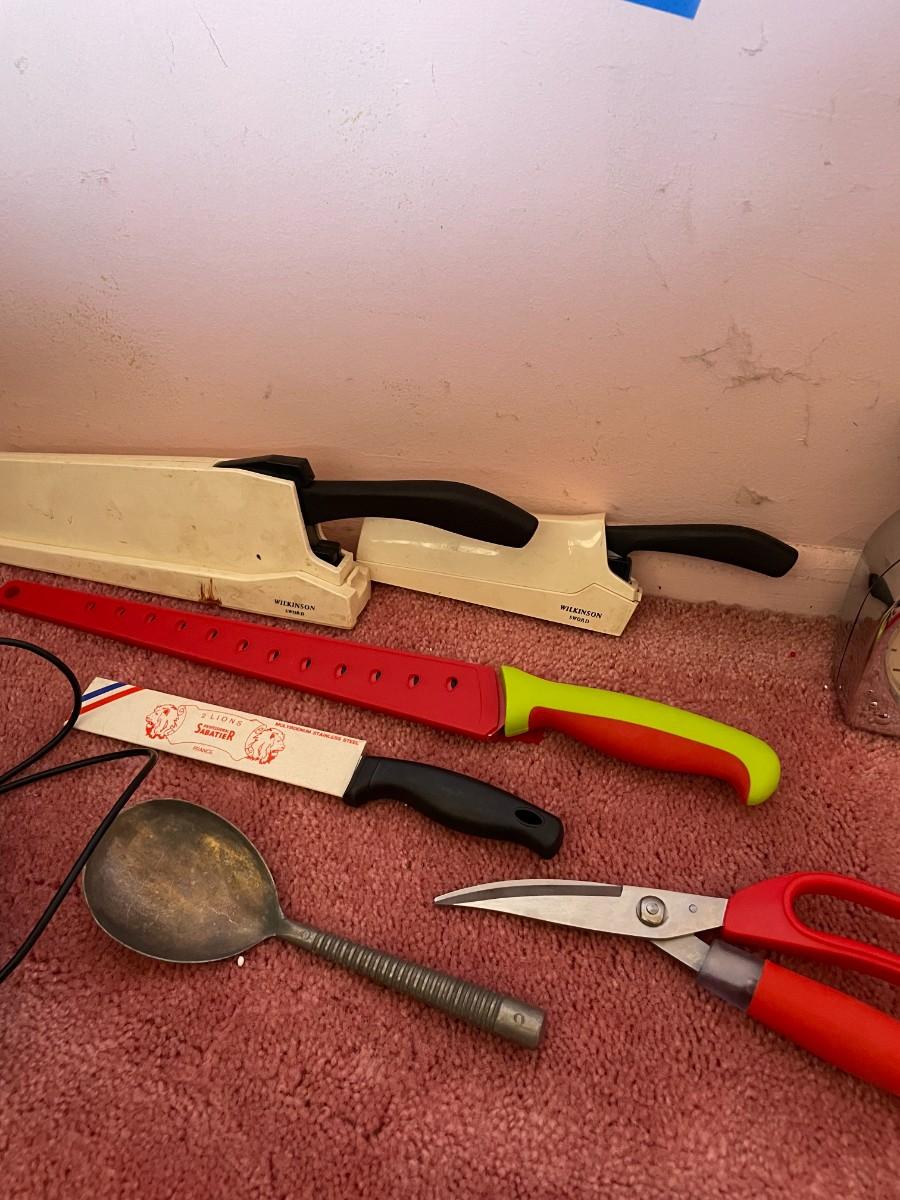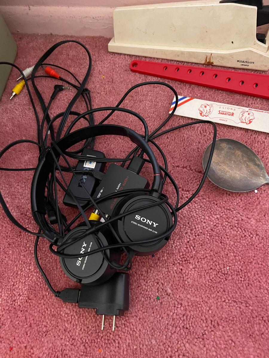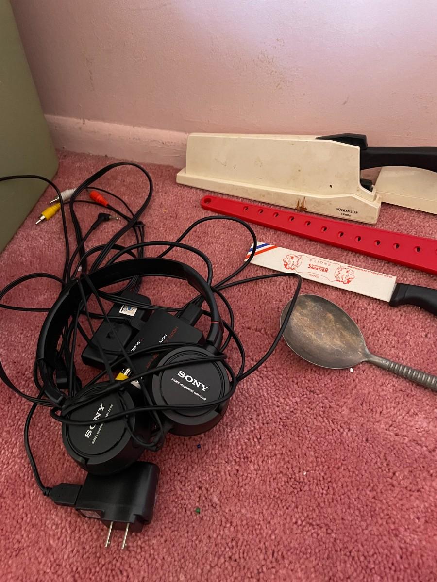 scale, (4) knives two come with sharpeners, scissors, (2) glass pitchers, sony headphones, spoon.