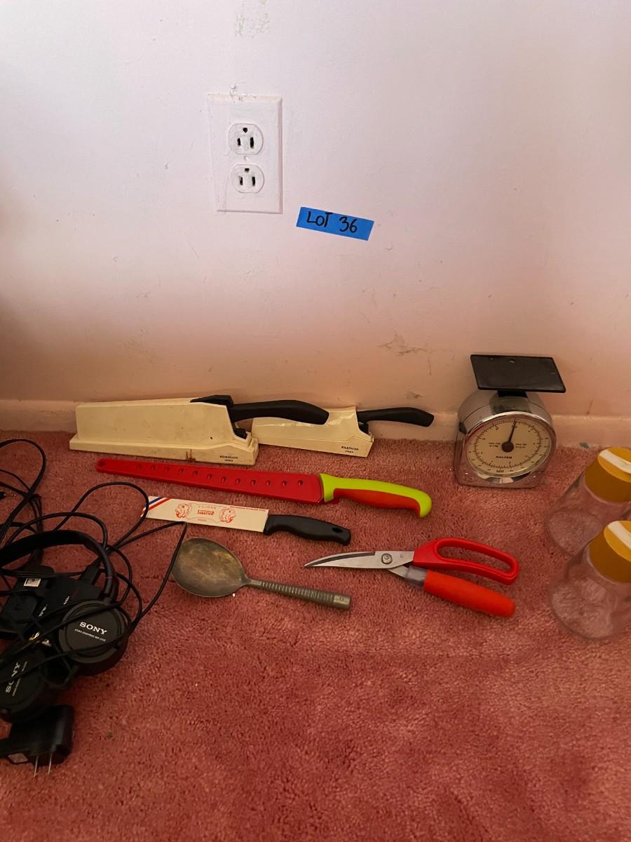 Lot 36- scale, (4) knives two come with sharpeners, scissors, (2) glass pitchers, sony headphones, spoon