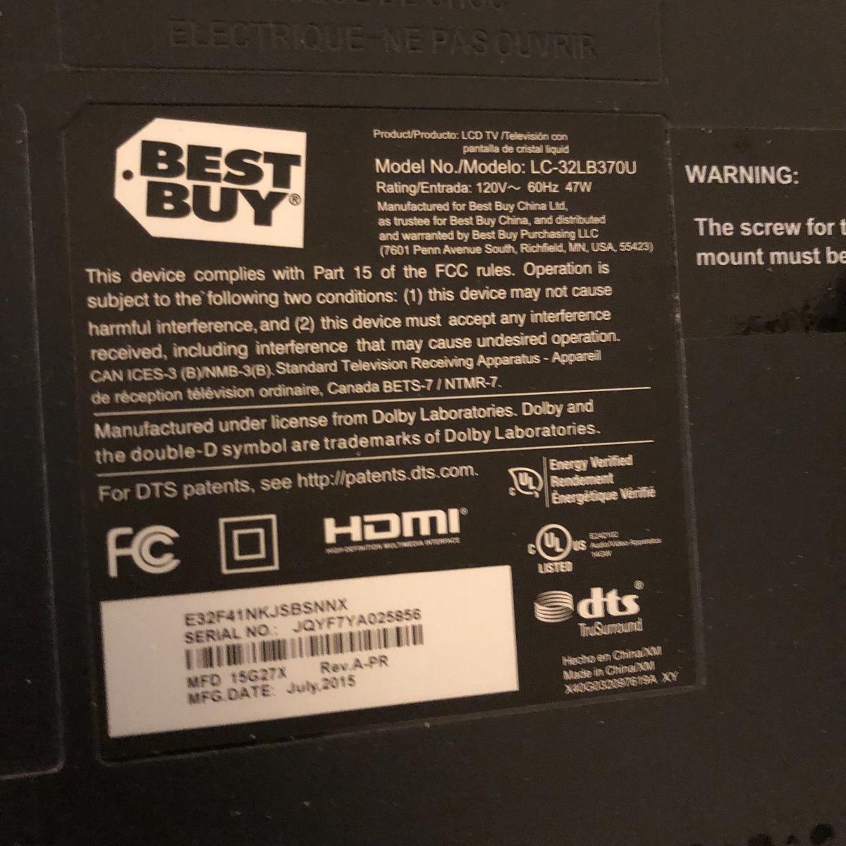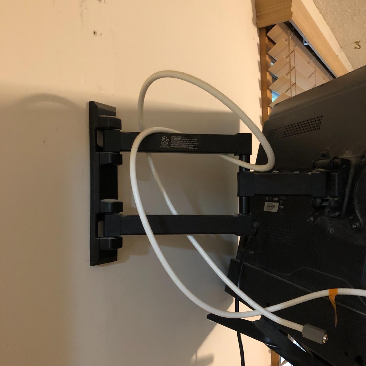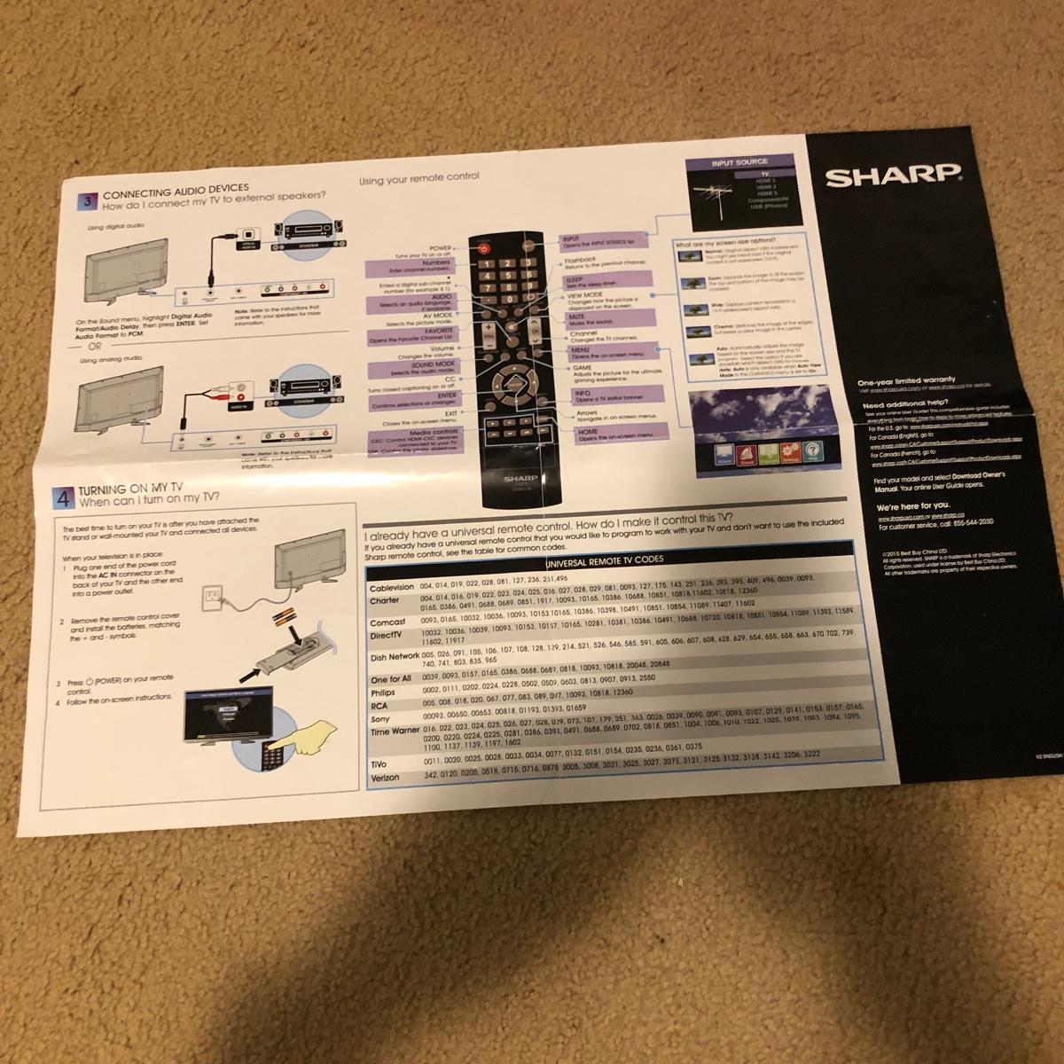 A great way to watch Your favorite show with this wall mounted Sharp 32” TV. Lot includes Sharp TV, remote, wall mount and owners manual. Winning bidder will need to take off wall mount.
