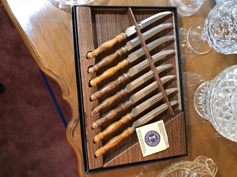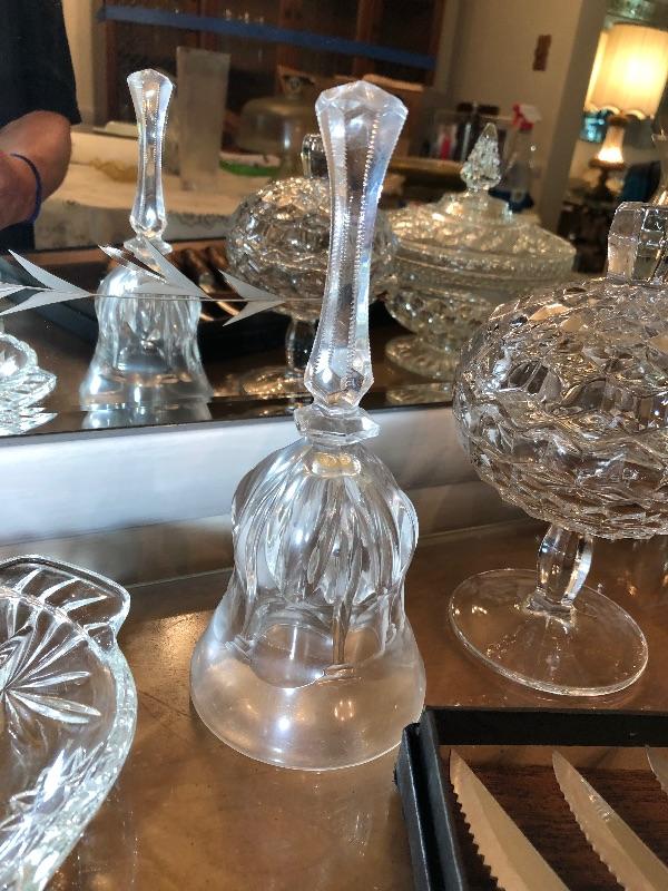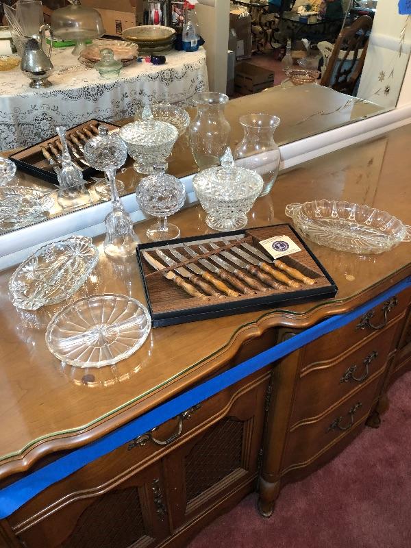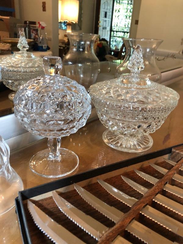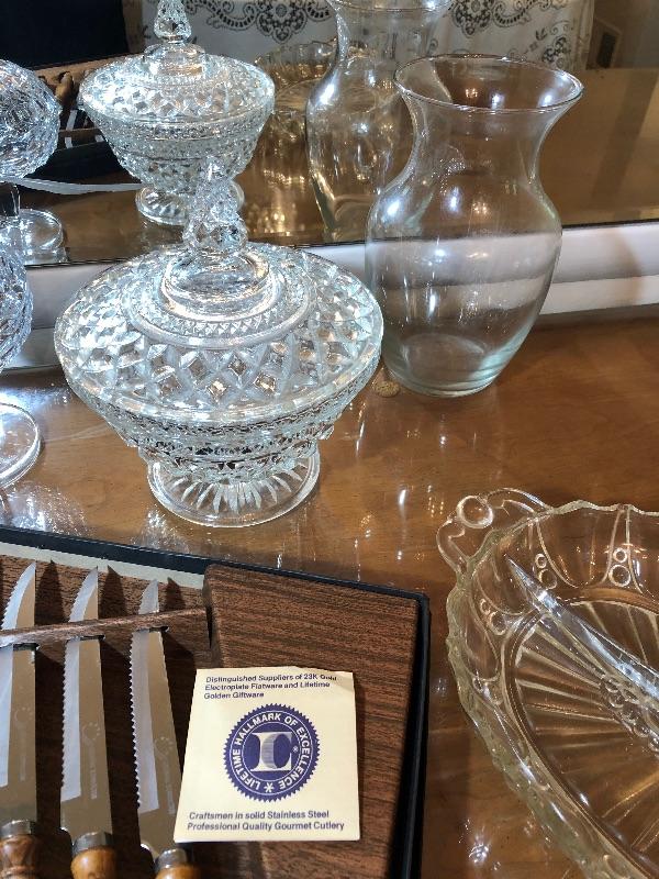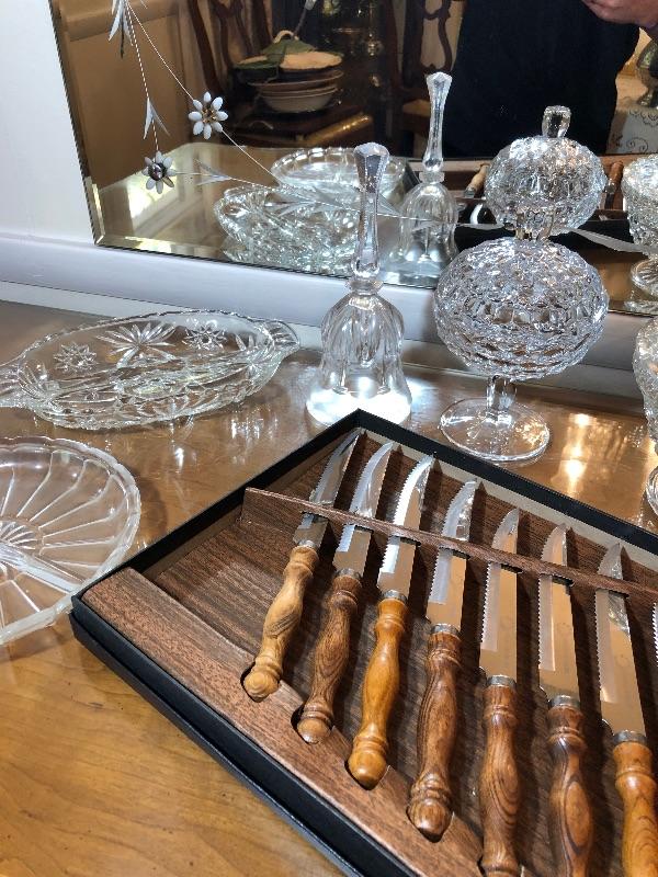 Steak Knife Set, 3 Pickle dishes, Vase, Candy Dishes with Lids, and Glass Dinner Bells