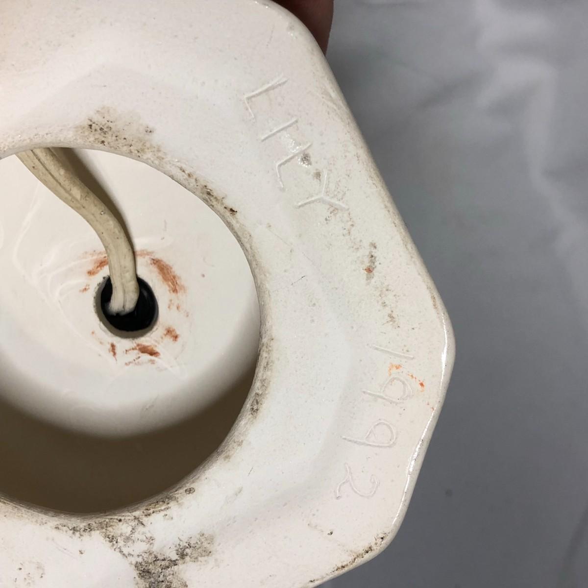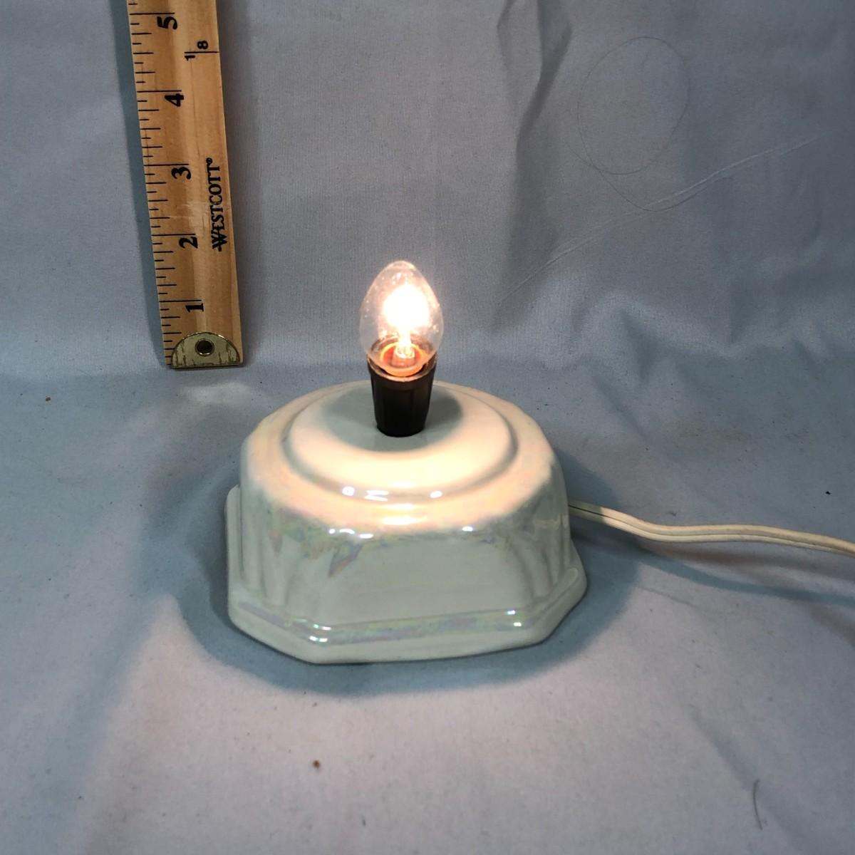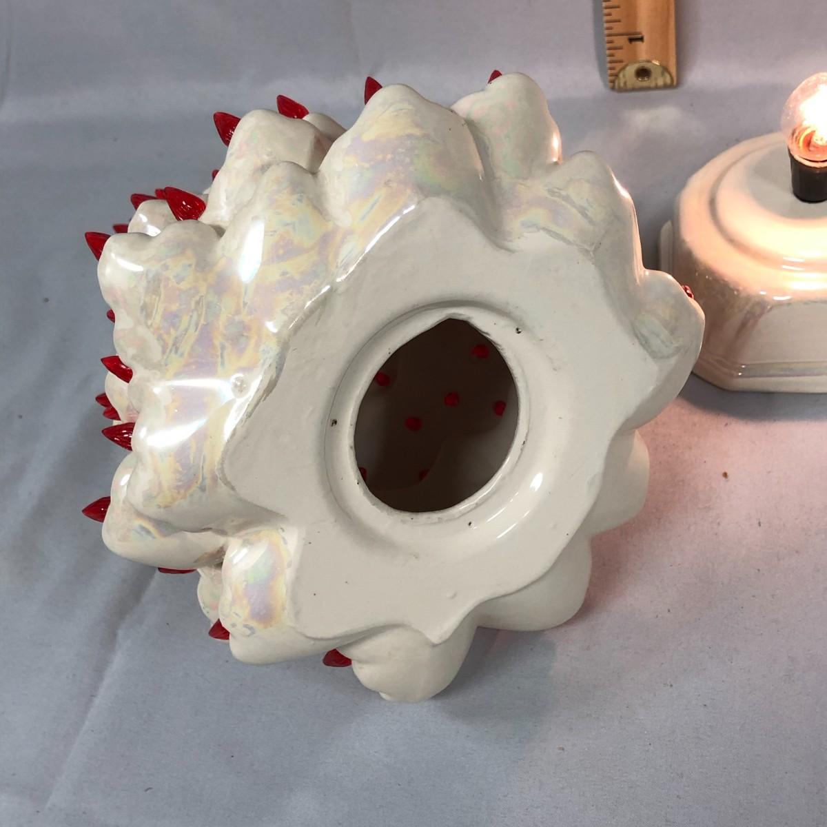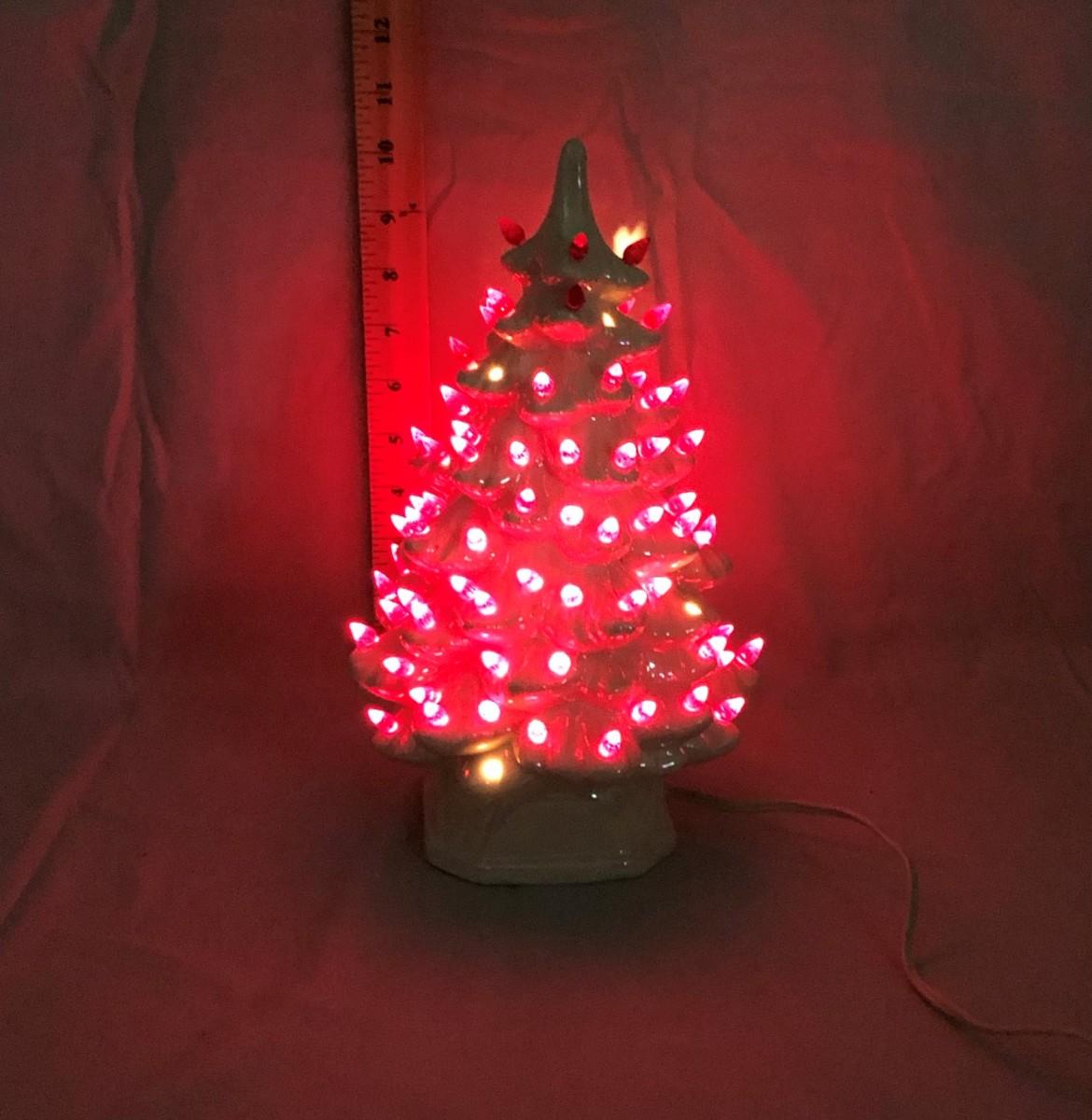 The only issue that I found with this is that there are a few red "ornaments" missing, but the light works and there aren't any chips or cracks that I could see. Stands about 10.5" tall.