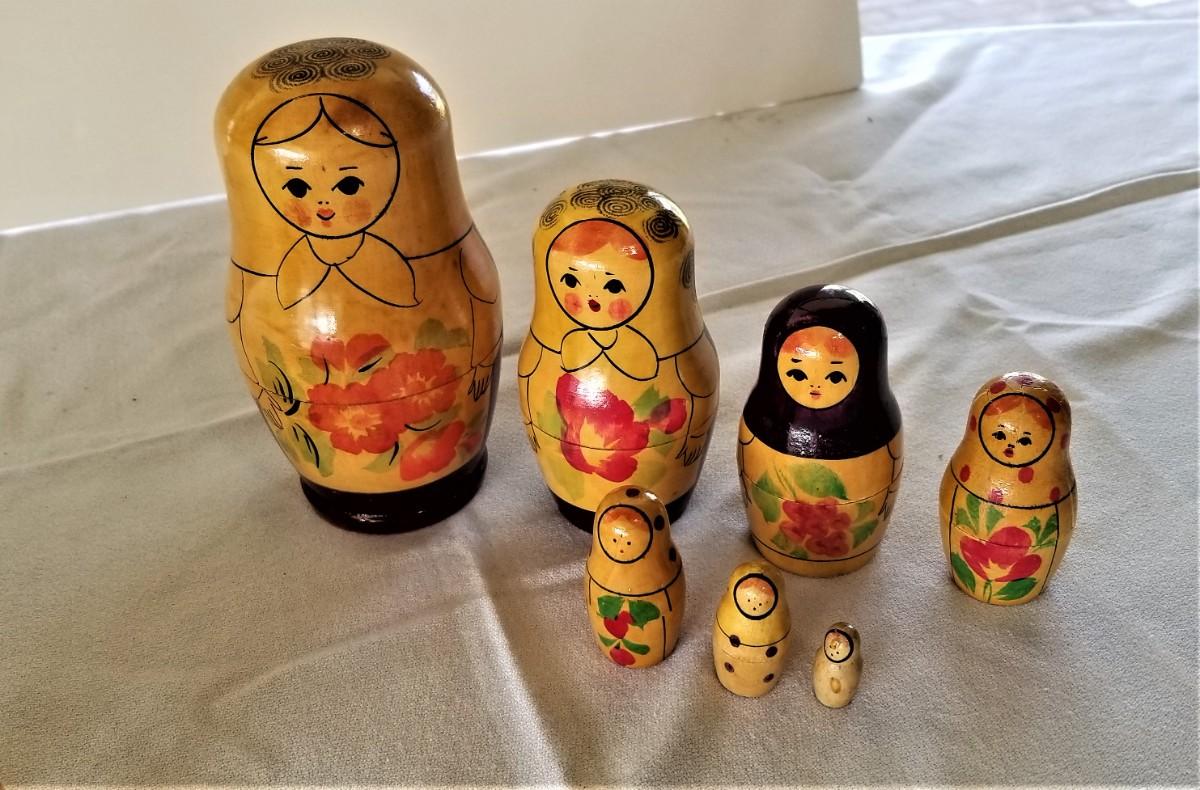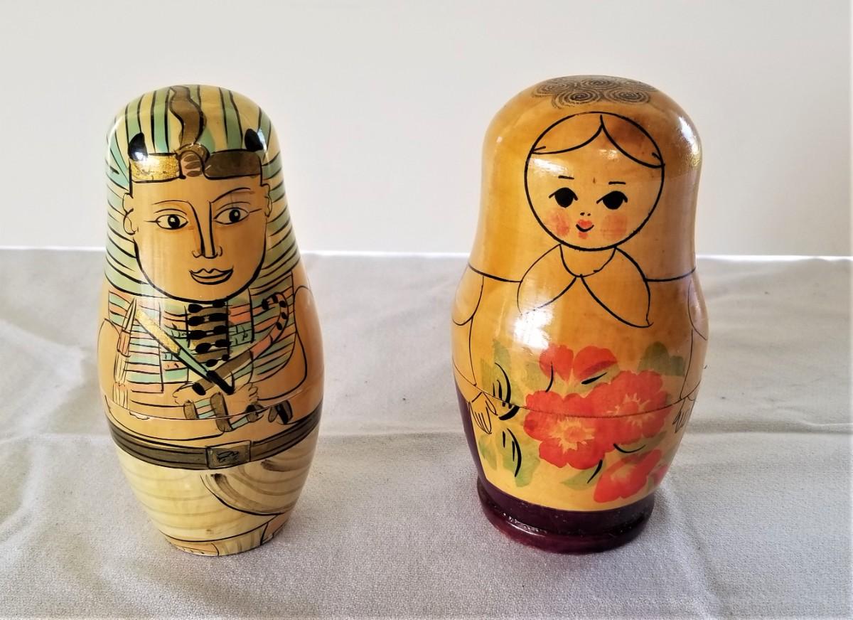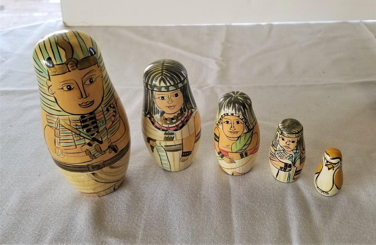 You get all you see here - two sets of Russian style nesting dolls - one set has an Egyptian theme (tallest figure 5.5" tall), the other is in the classic style (5" tall). Both sets complete and in good condition.