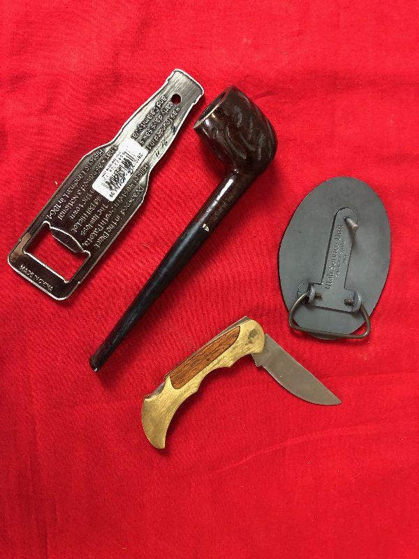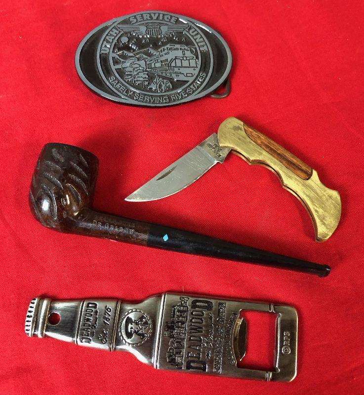 Lot 36 Union Pacific Belt Buckle, knife, pipe.