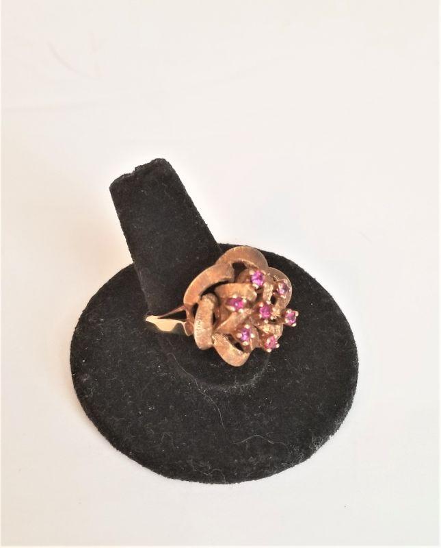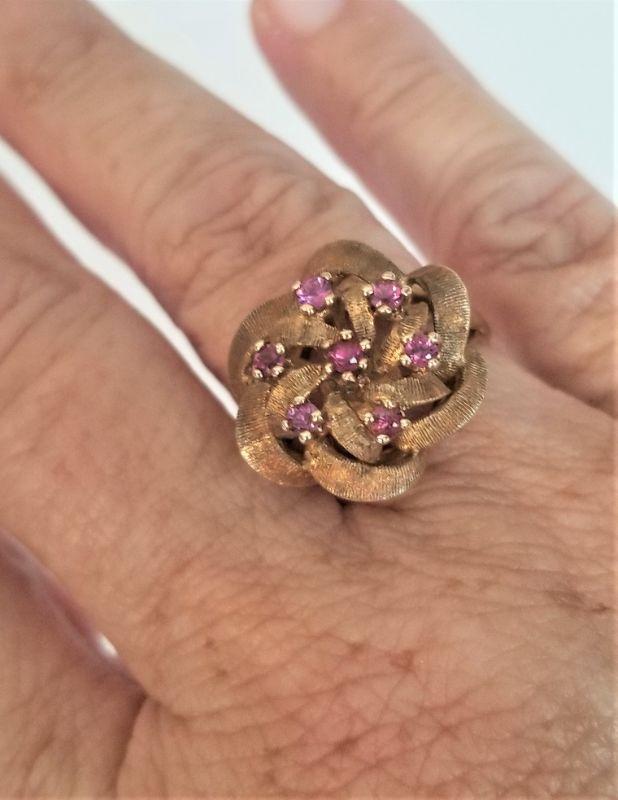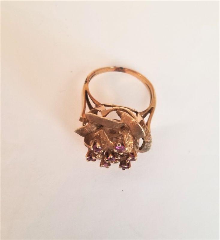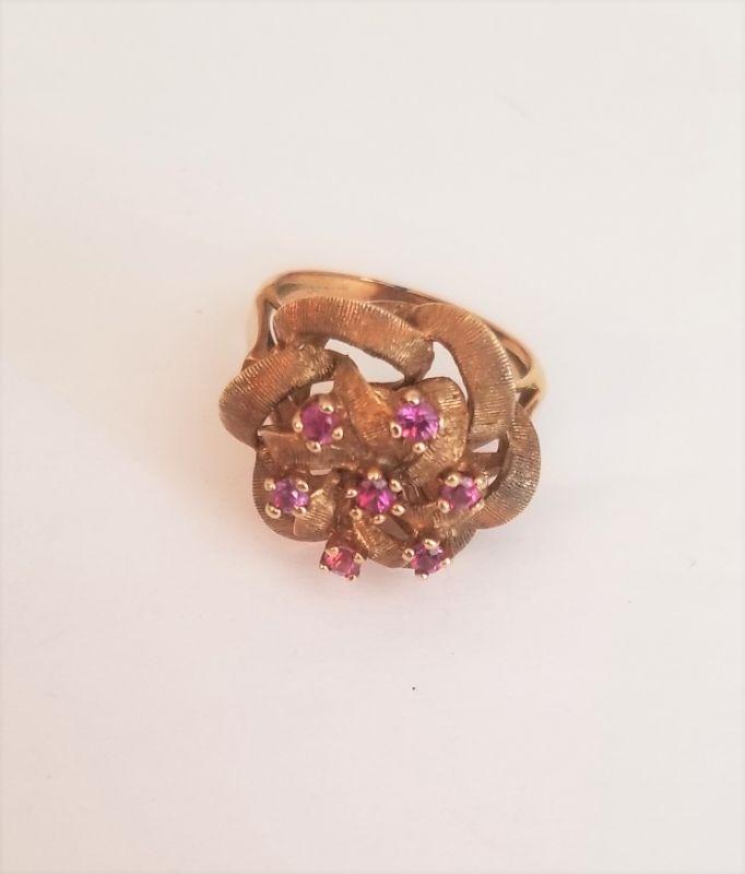 Vintage Cocktail ring, size 6.5 - 14kt yellow gold set with 7 small rubies in a ribbon-like "bow." Weighs .24 ounces.