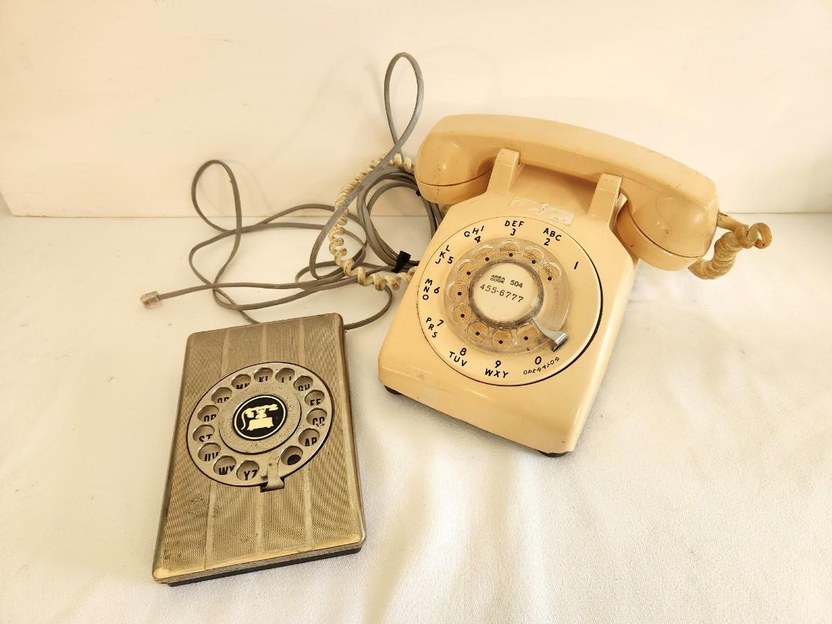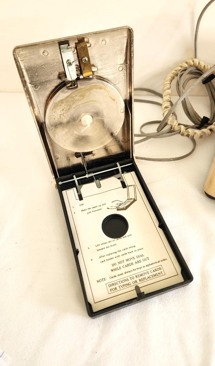 1970's old style dial peach telephone and vintage telephone number rolodex (no pages left in rolodex - but it's cool looking).