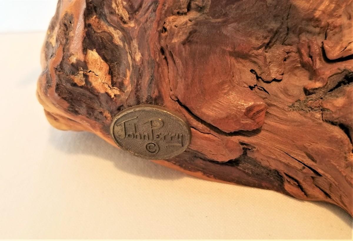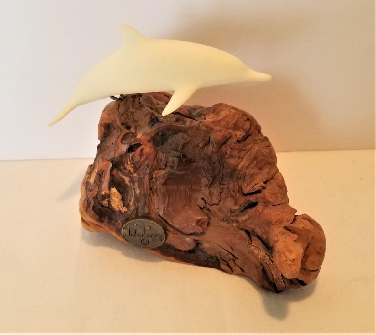 Vintage (signed) John Perry sculpture - Dolphin on driftwood. Excellent condition. 5" long, 4.5" tall.