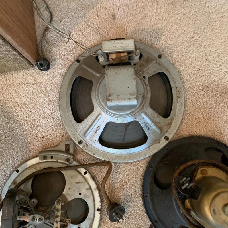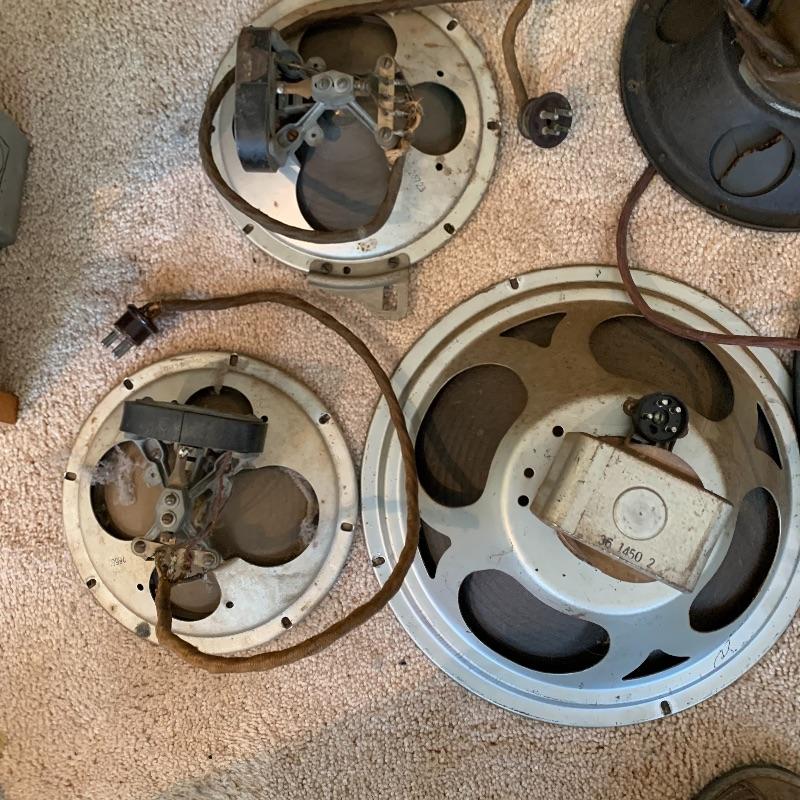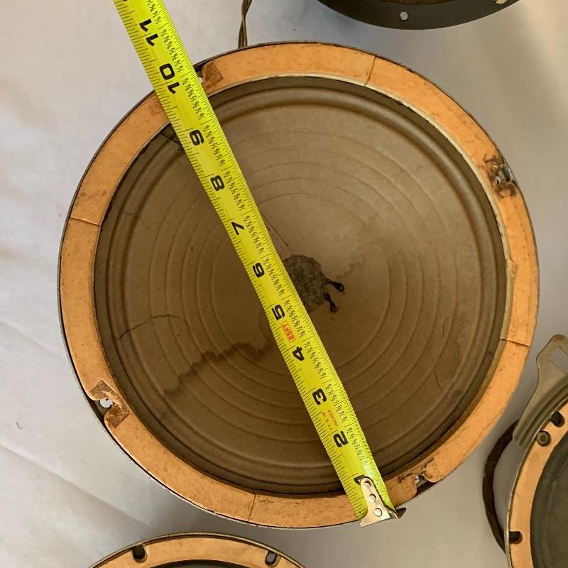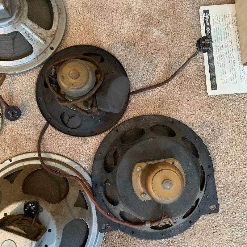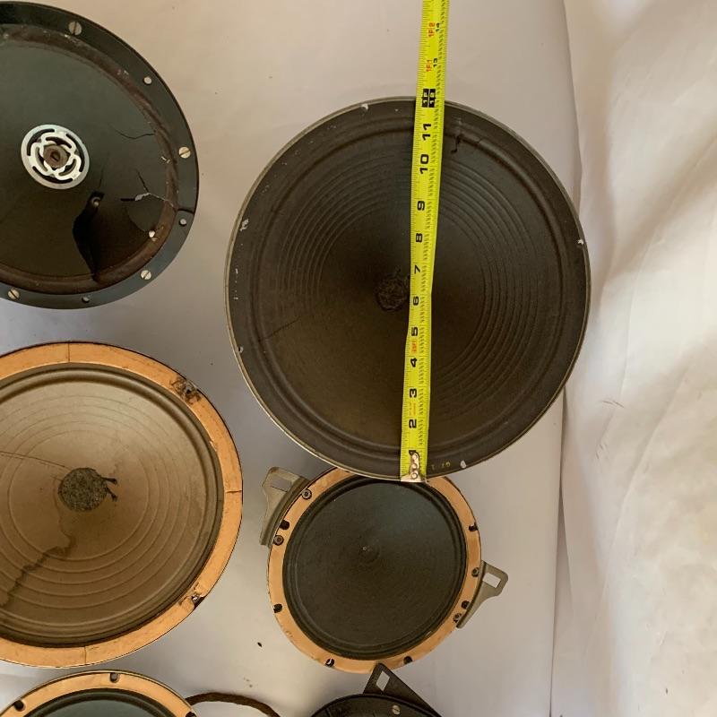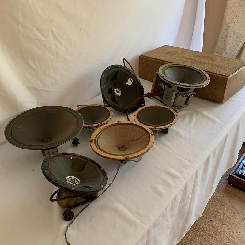 Vintage assorted radio speakers. The sizes are all different with the largest being 12”. There is also a single house speaker included in this lot.