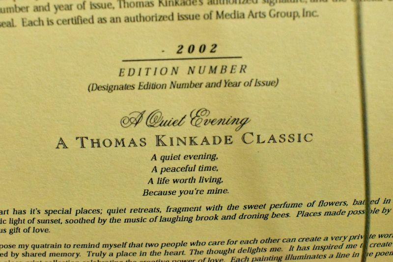 Lot 63: Thomas Kinkades " A quiet evening " framed Art w/ coa