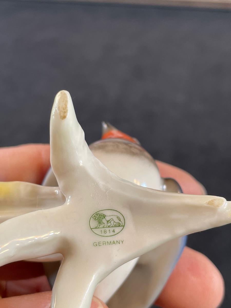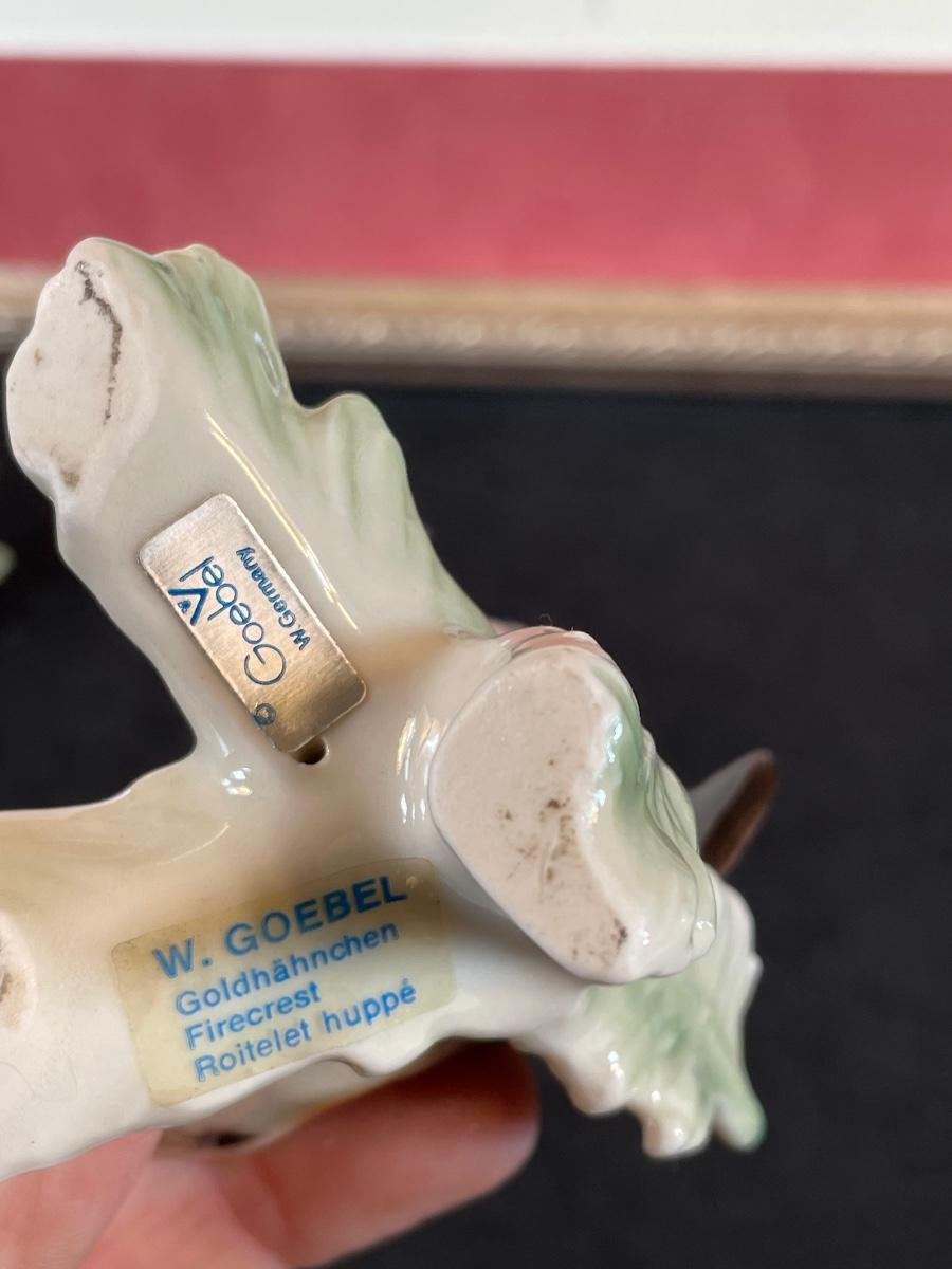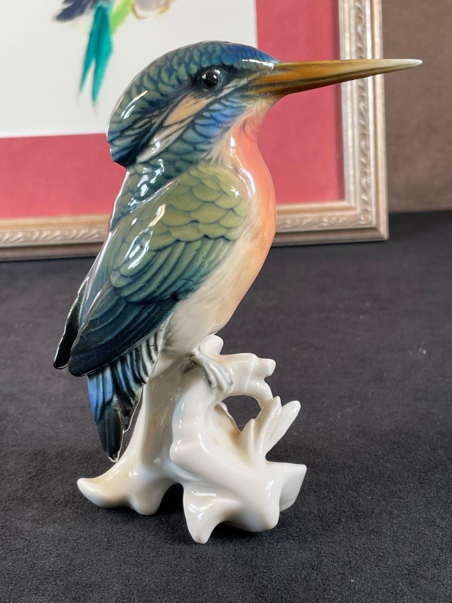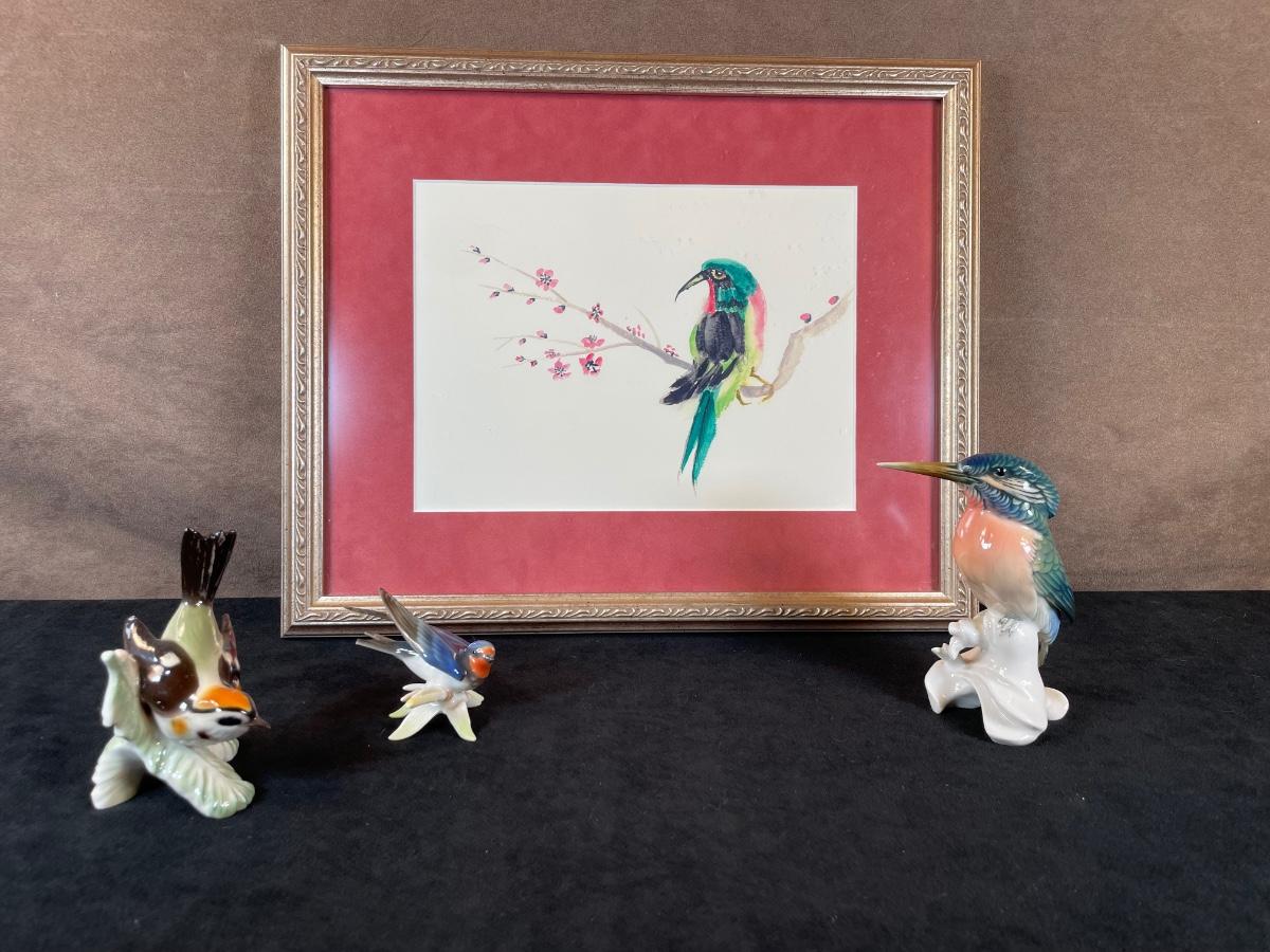 11" x 14" Framed Original watercolor painting of a bird and porcelain bird figurines: one Goebel and two marked "Germany"