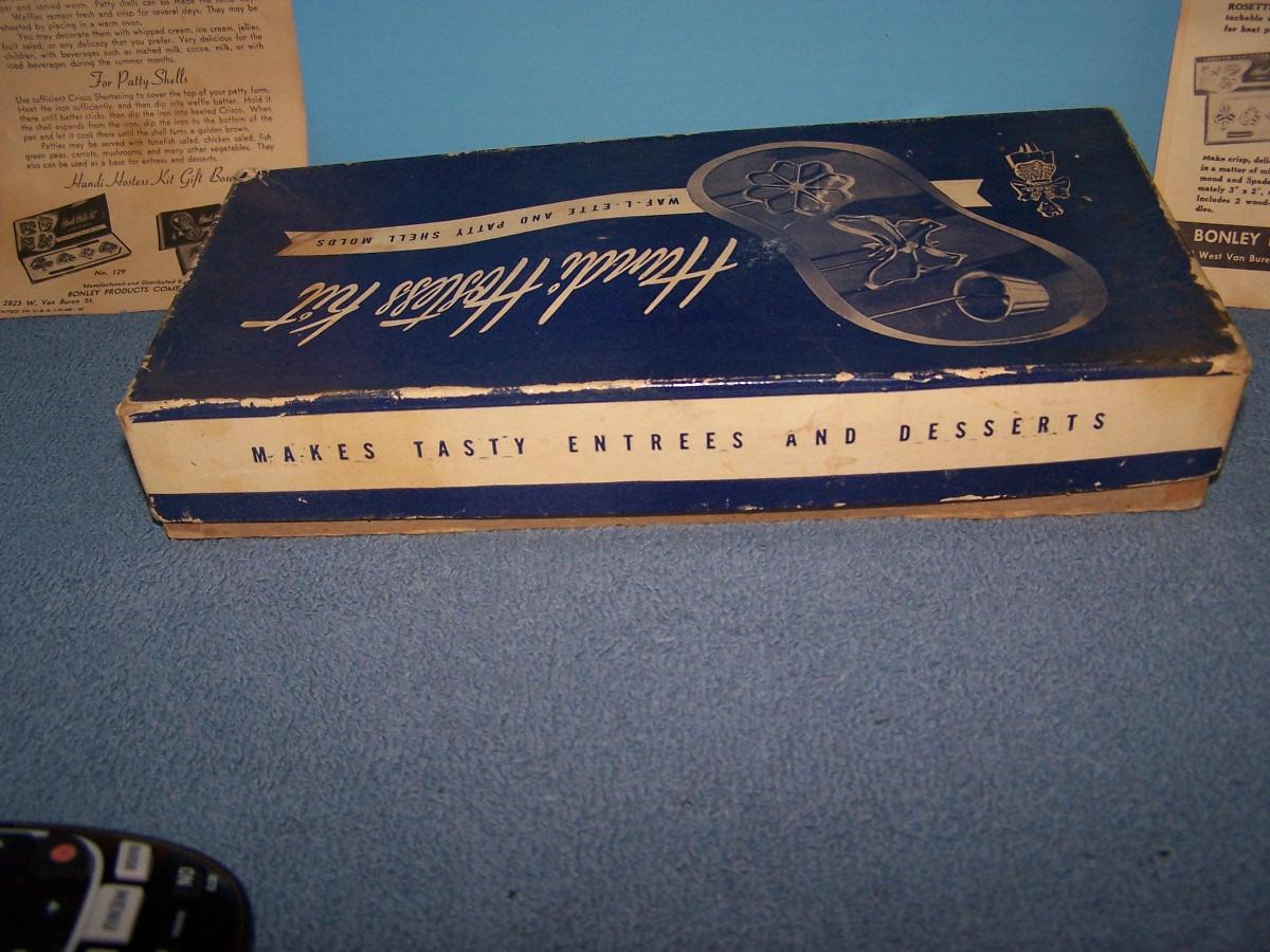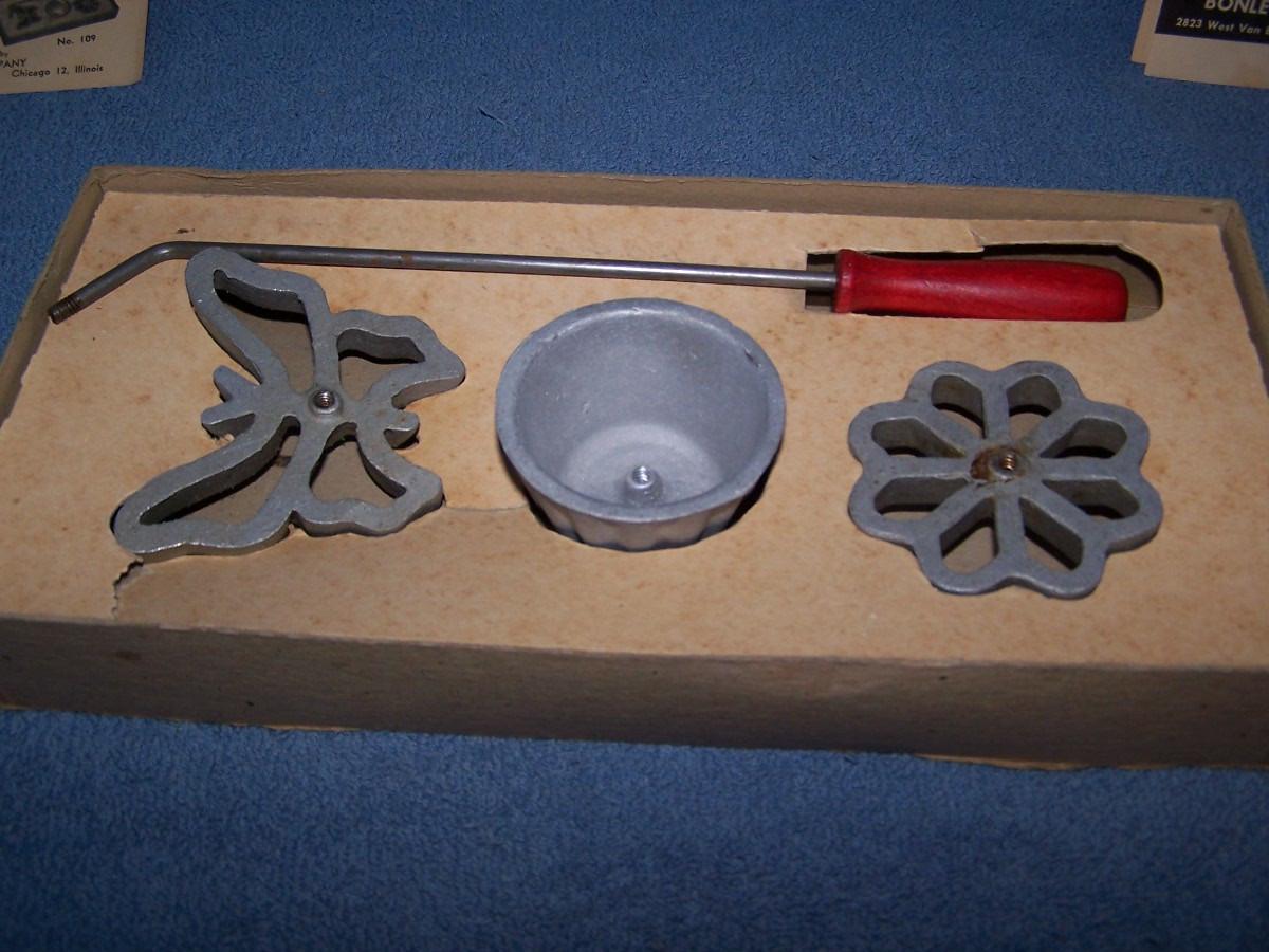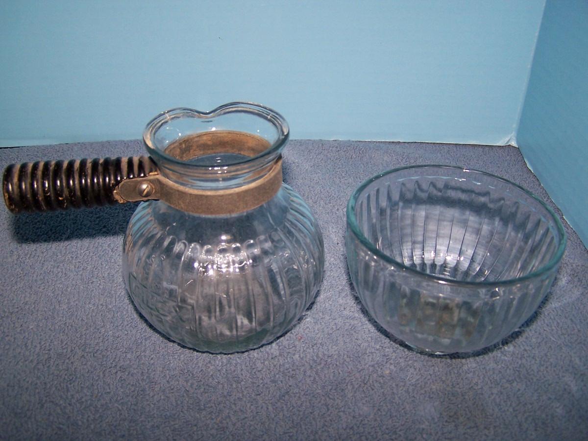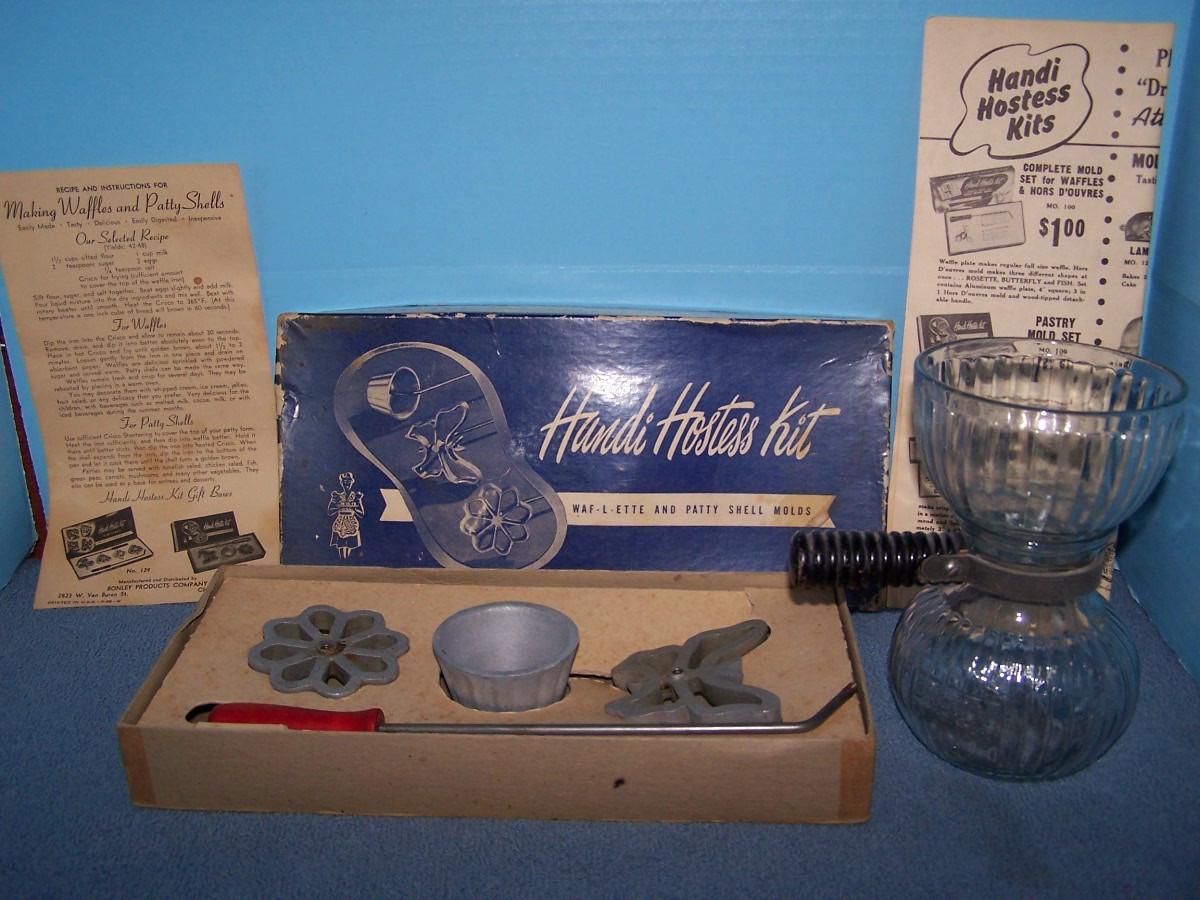 THIS A WONDERFUL LOT OF VINTAGE KITCHEN PIECES!!! SILEX POT IS 6 1/2'' TALL, AND A 1 1/2 CUP, SLIGHT WEAR.. ROSETTE MAKER BOX HAS WEAR..