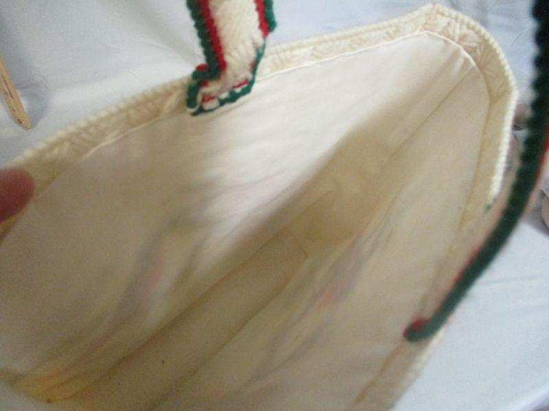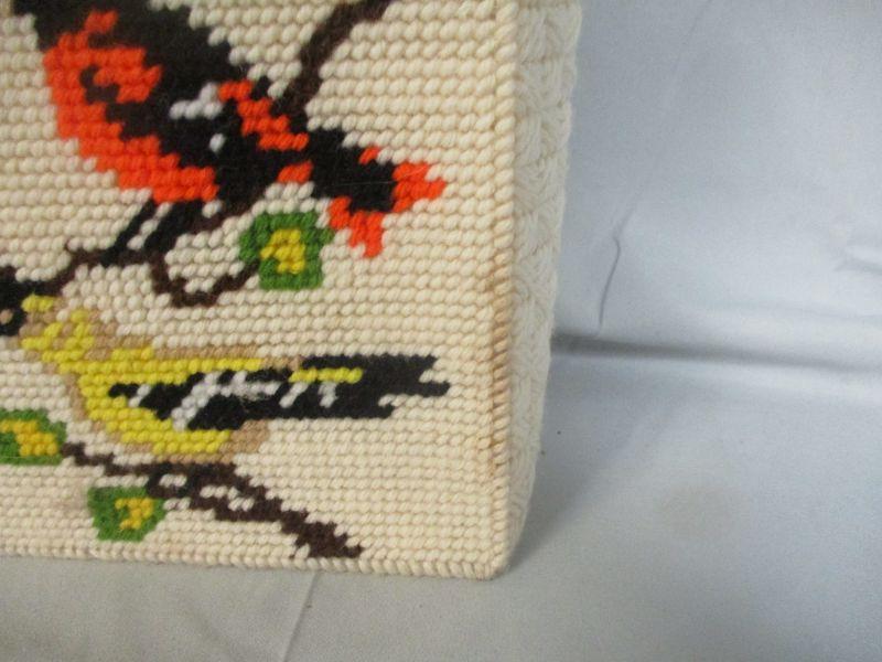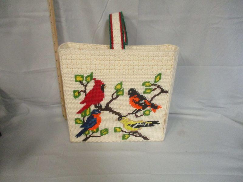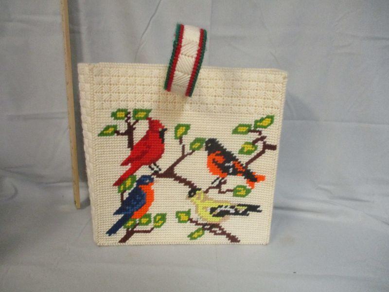 This is a purse made of yard on a plastic grid that created four different wild birds. It 10.5" x 10.5" x 3" and the only issues is that the plastic handle on one end has detached, but the yarn still has it attached and there is a dirty spot on the outside (doesn't go all the way through).