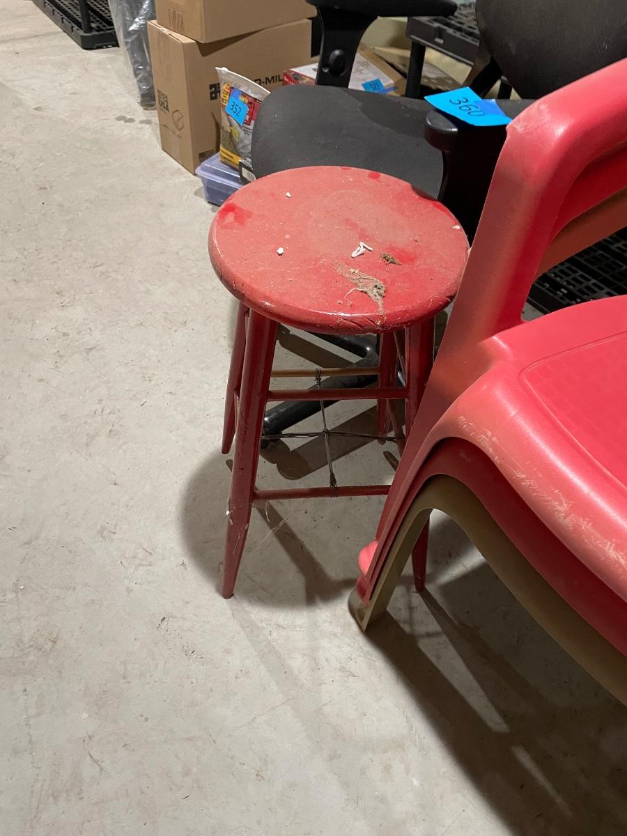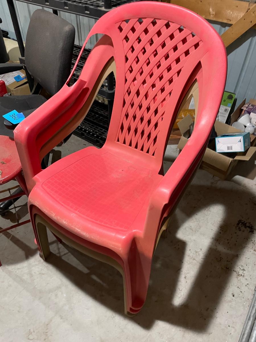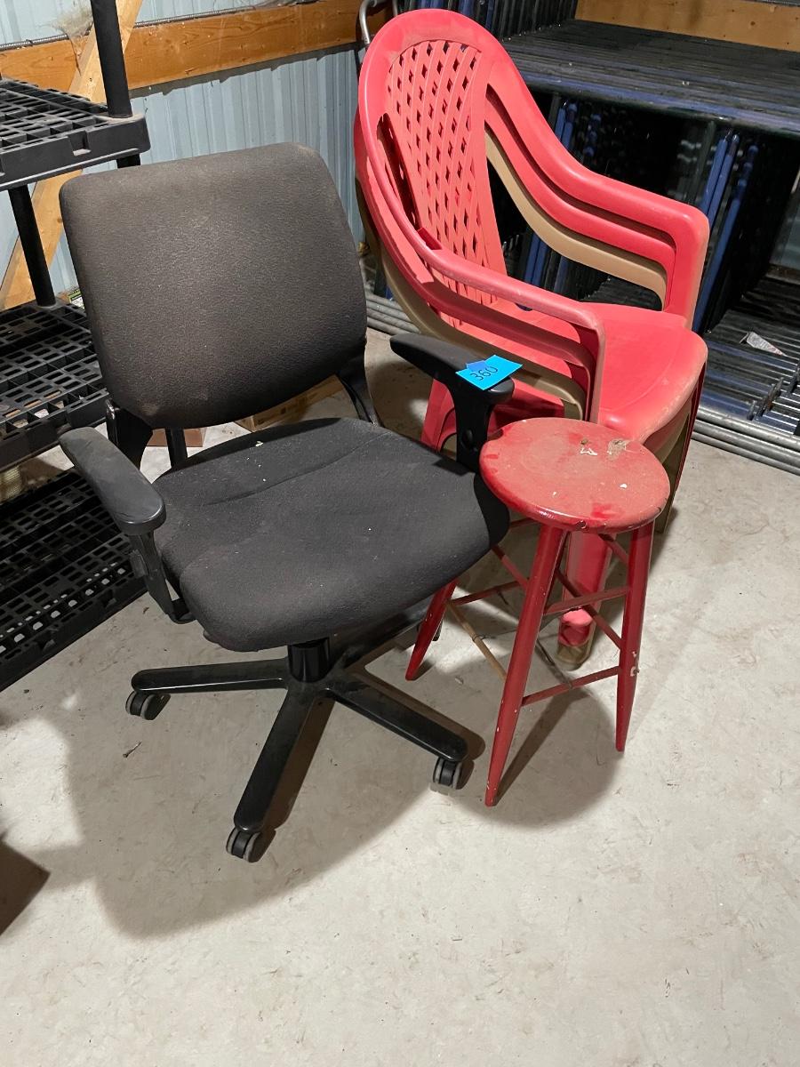 Lot 360 3 plasic lawn chairs,small red stool, office chair