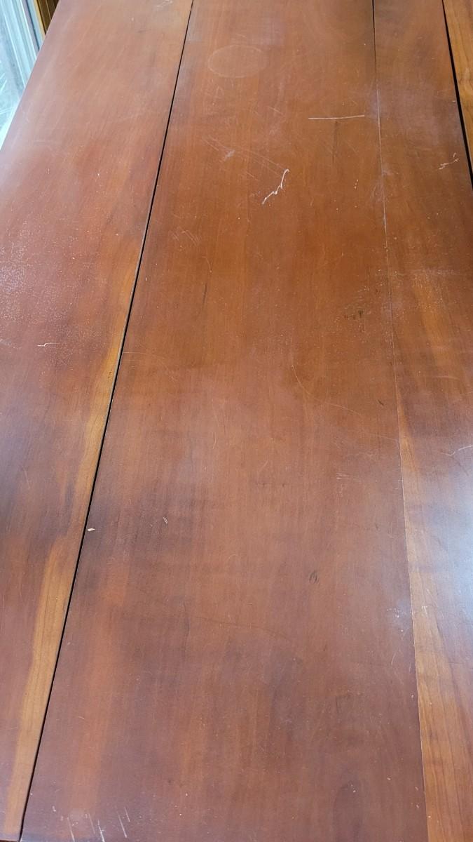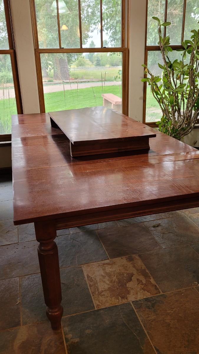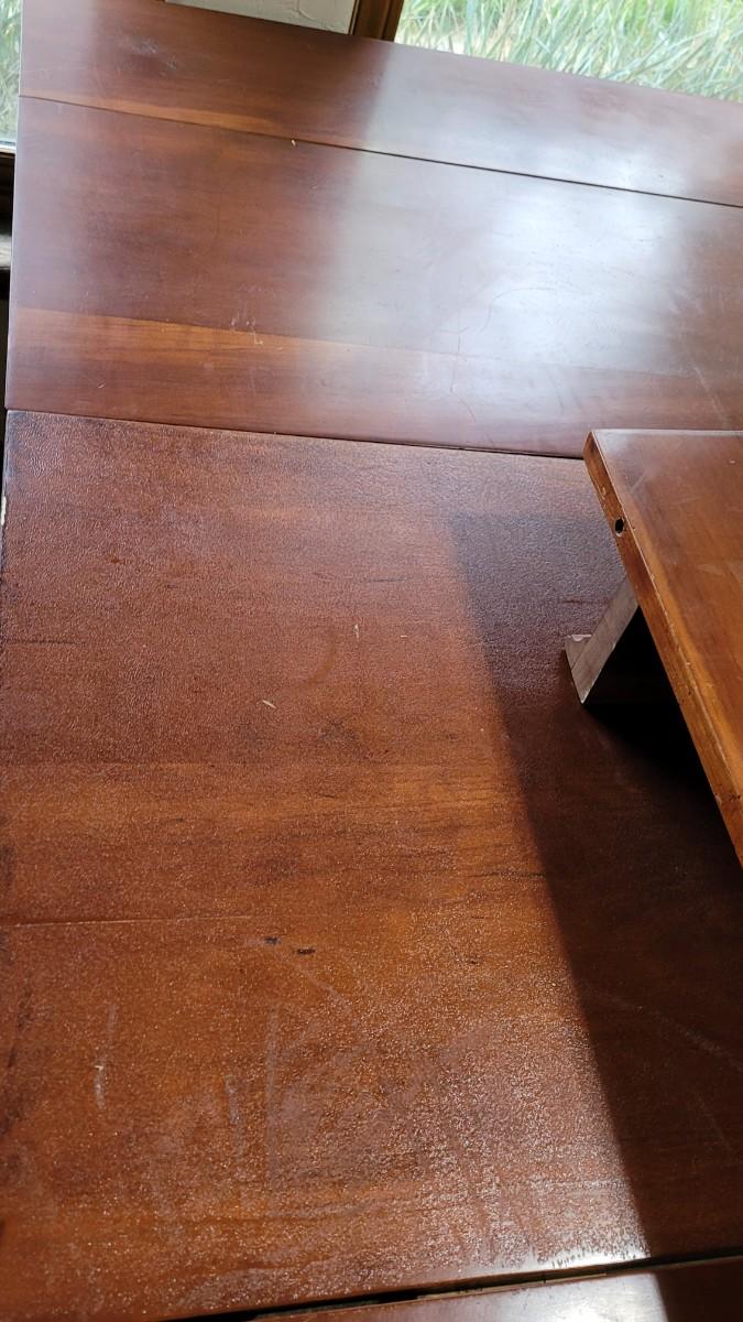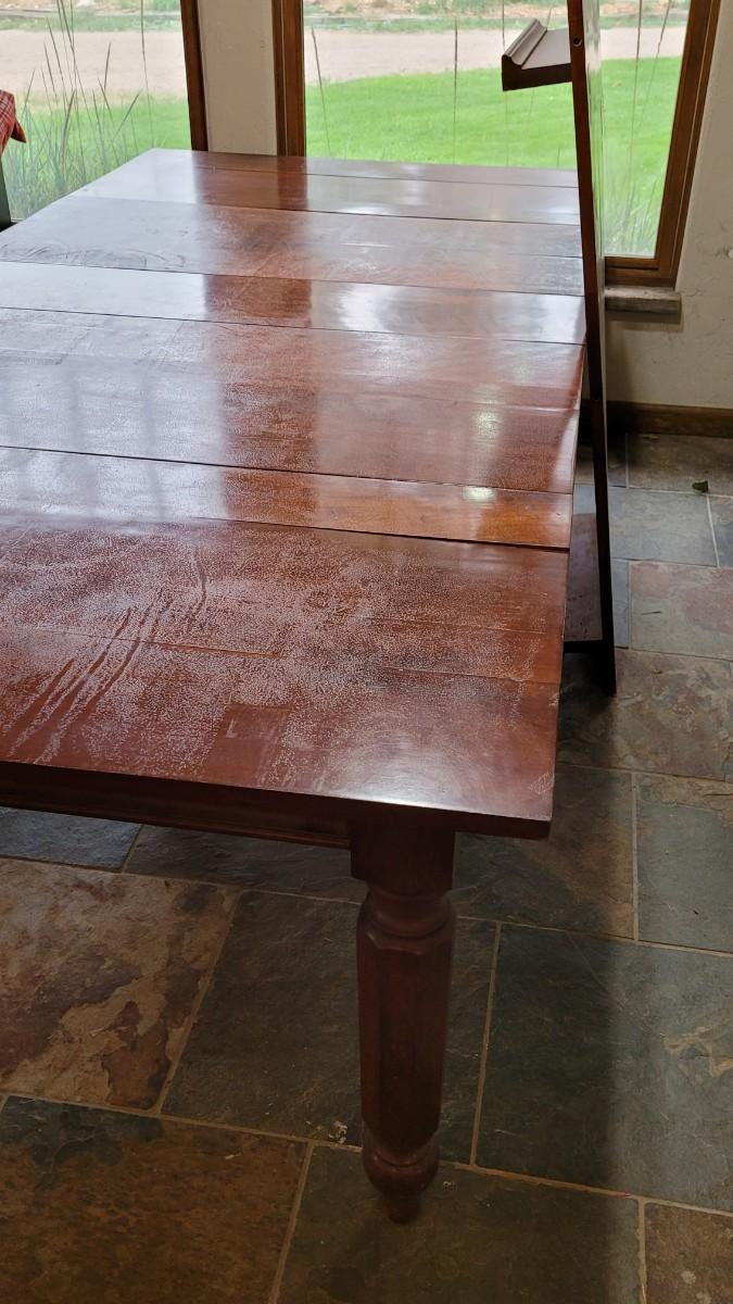 ◇◇2 of the leaves are in the table in the photos. There is a residue on the table top from a plastic Tablecloth. Needs a little refurbishment by someone more qualified than our team.◇◇