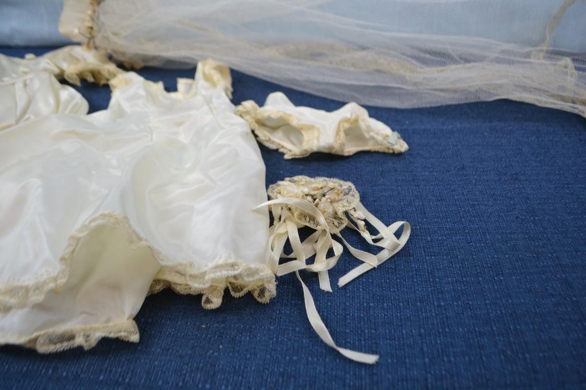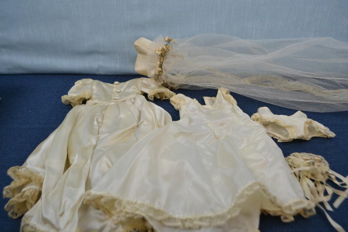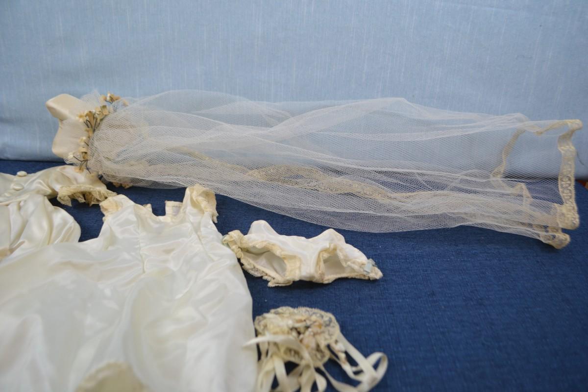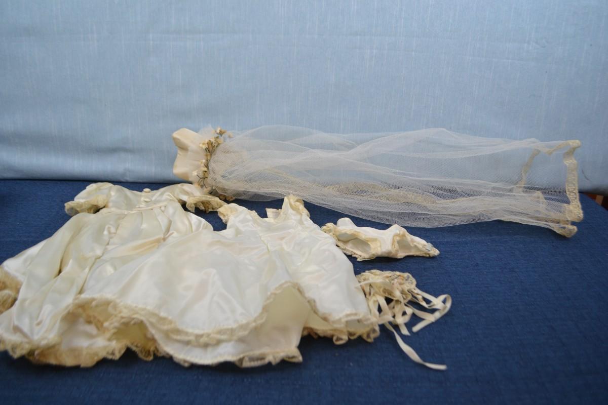 LOT 360. DOLL SIZE WEDDING DRESS AND VEIL