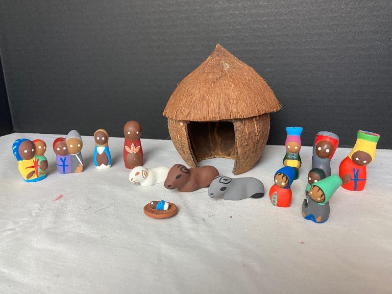Lot #360 Haitian Coconut and Clay Nativity Set