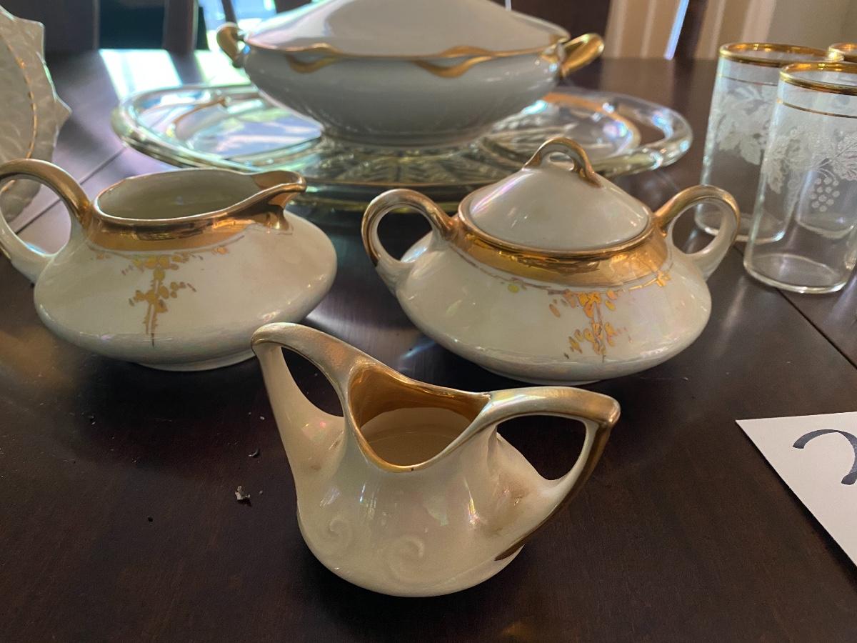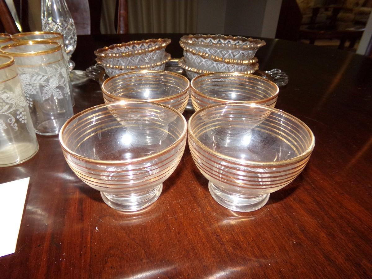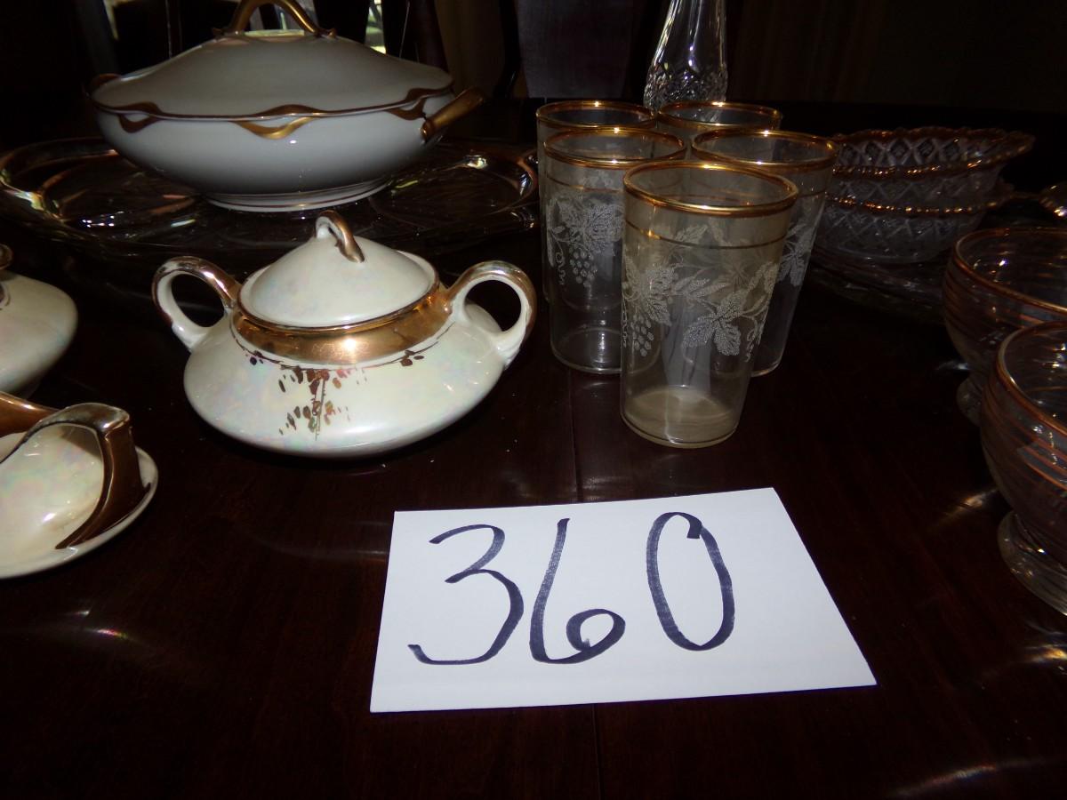 CHARLES HAVILAND & CO LIMOGE PIECES AND A SET OF GOLD-RIMMED ETCHED GLASSES.