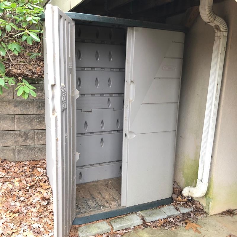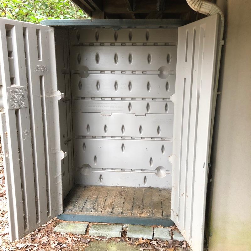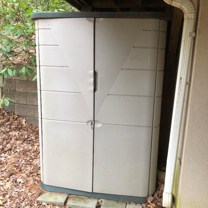 Great storage option here with this sturdy Rubbermaid unit that measures 28” x 48” x 73”. It appears to dismantle easily with a few pieces that slot together.