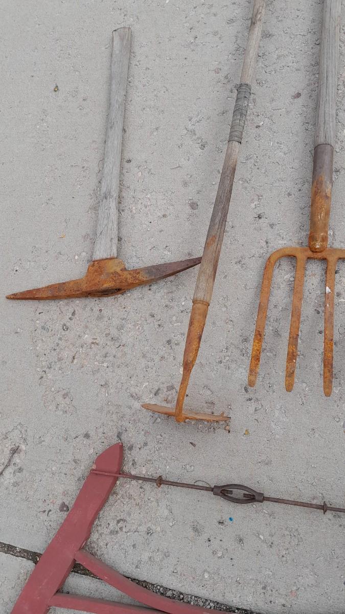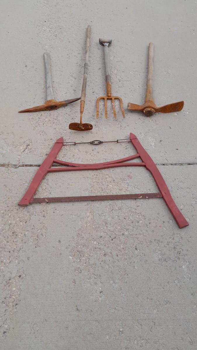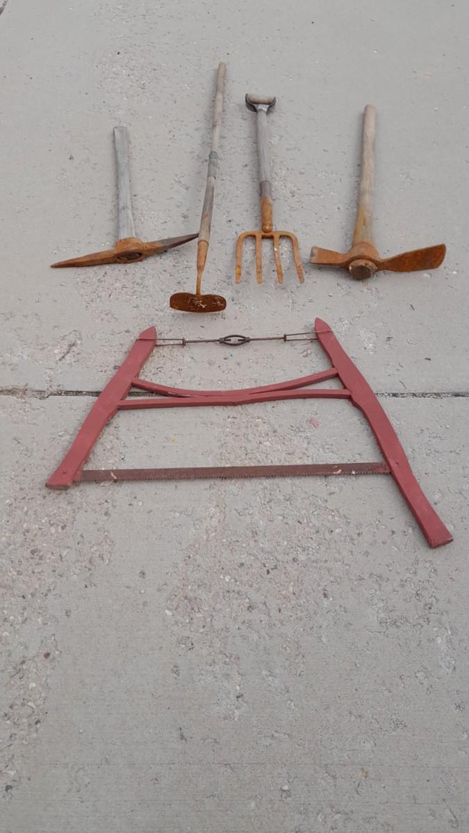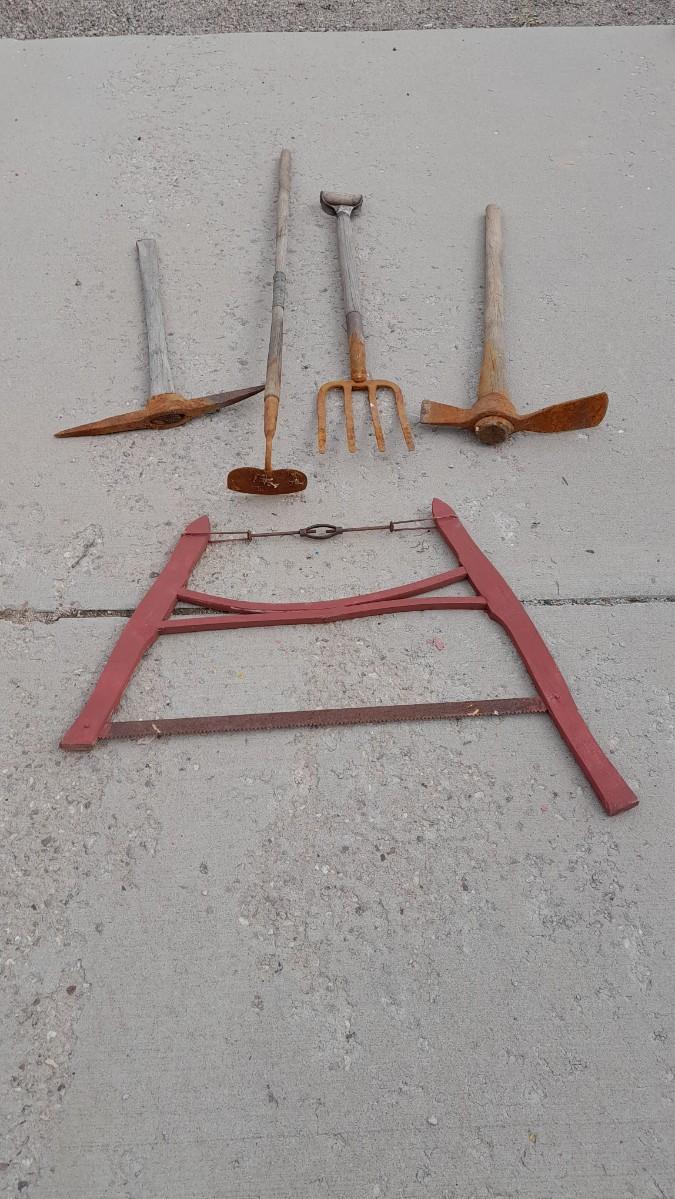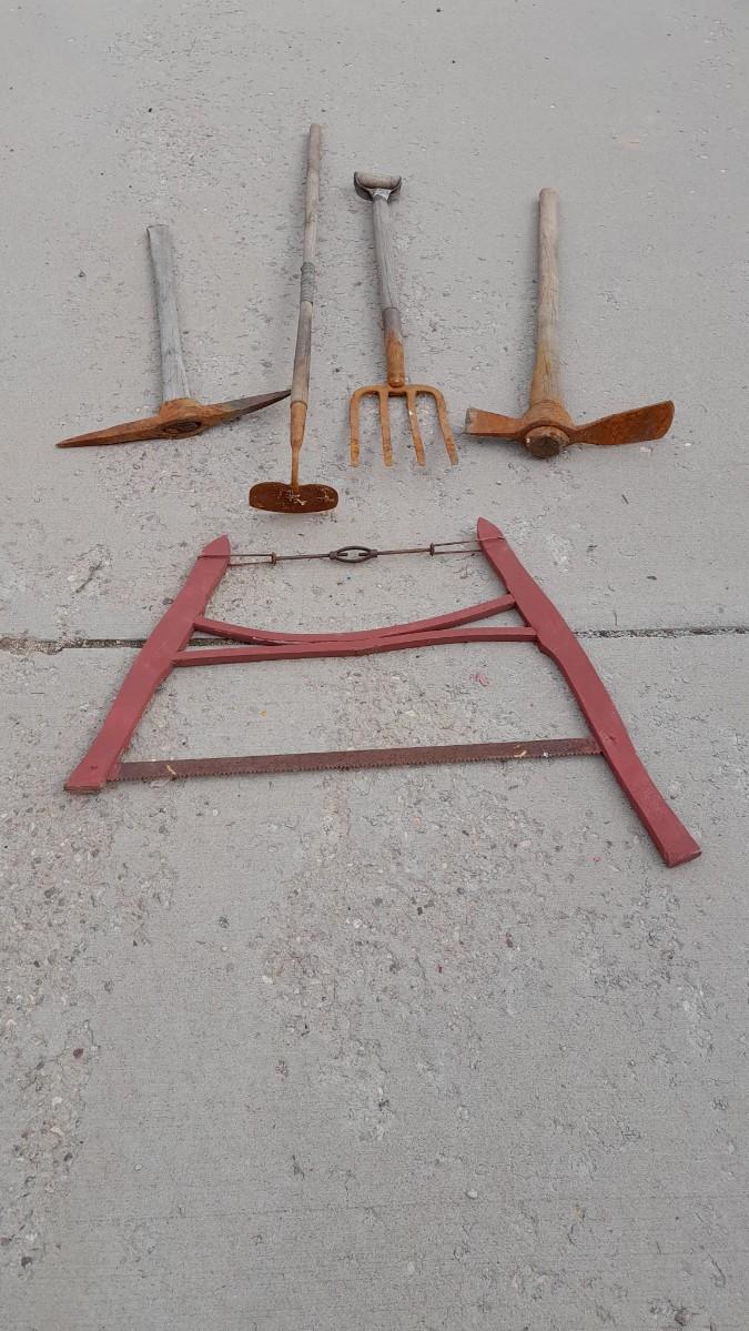 RUSTY FARM TOOLS, HOE, PITCH FLORK, PICKS AND VINTAGE BUCK SAW