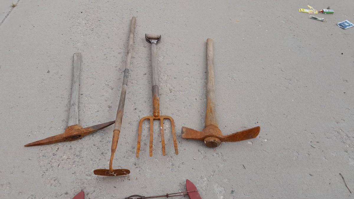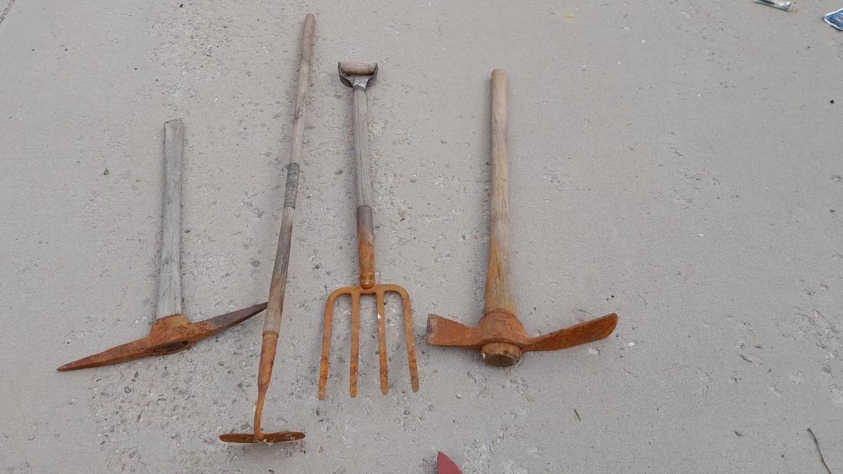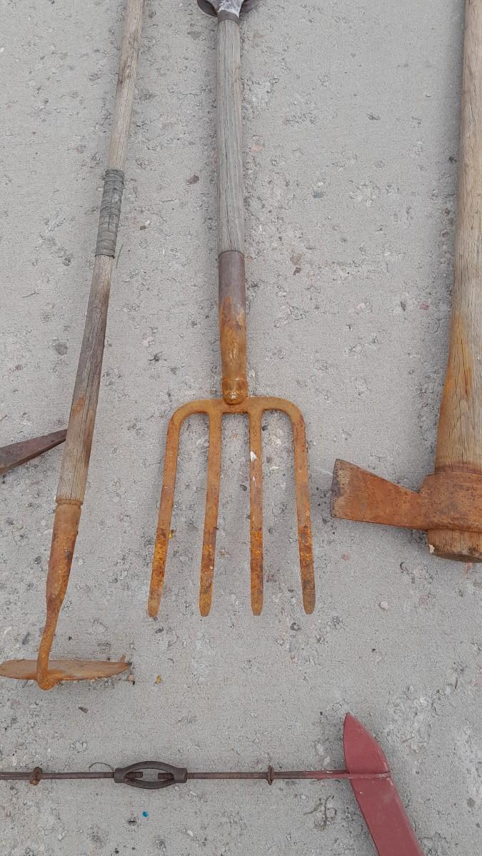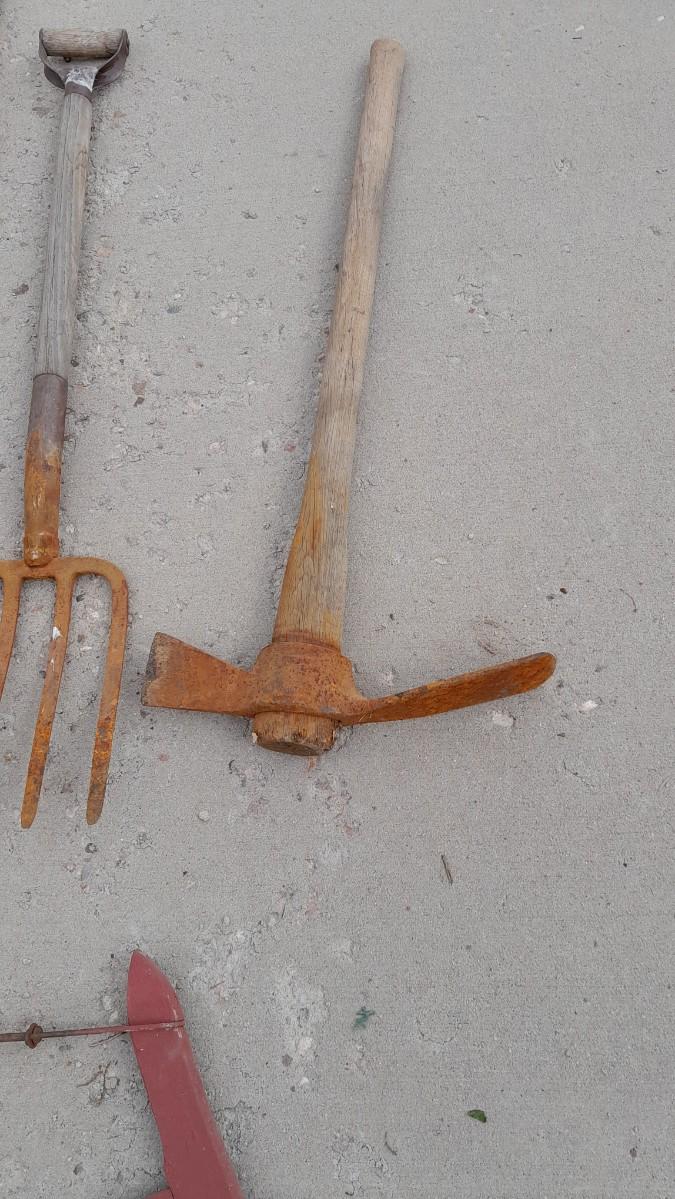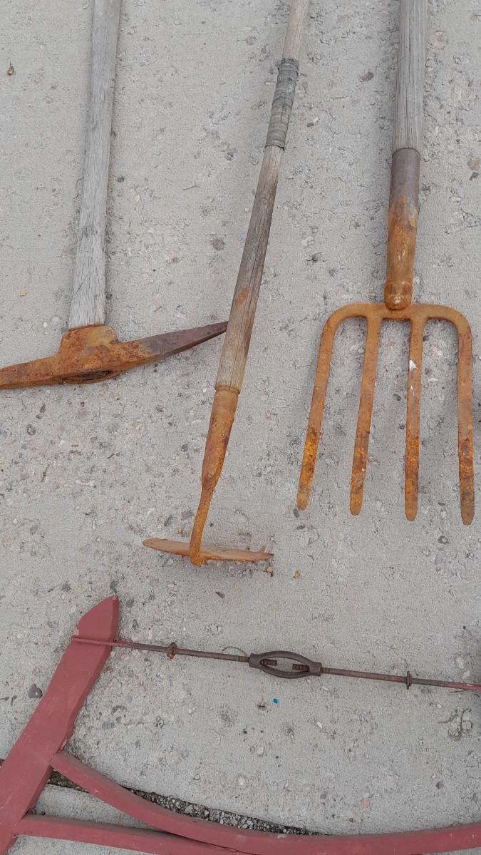 RUSTY FARM TOOLS, HOE, PITCH FLORK, PICKS AND VINTAGE BUCK SAW