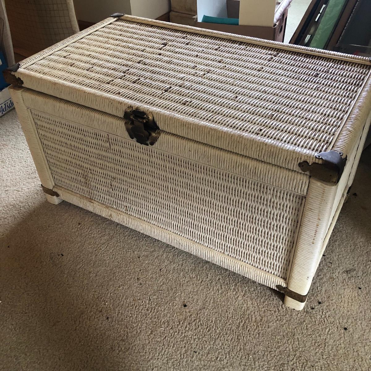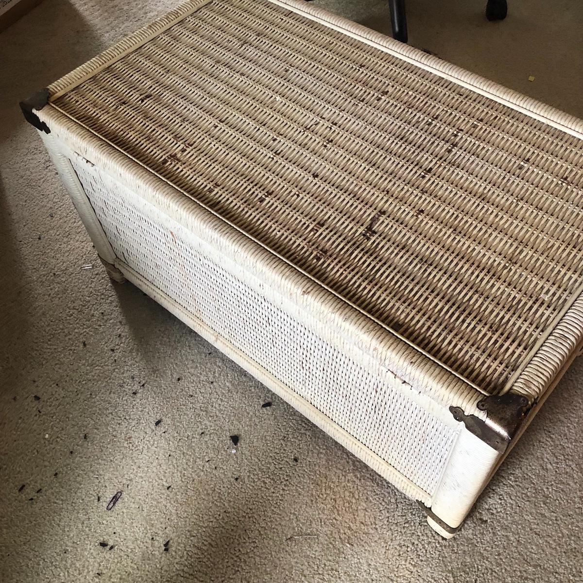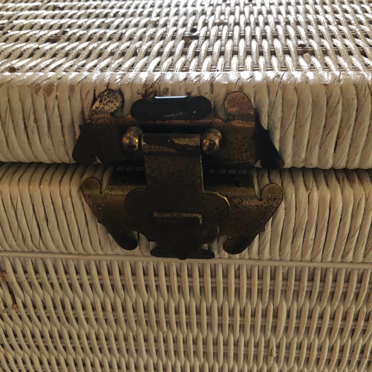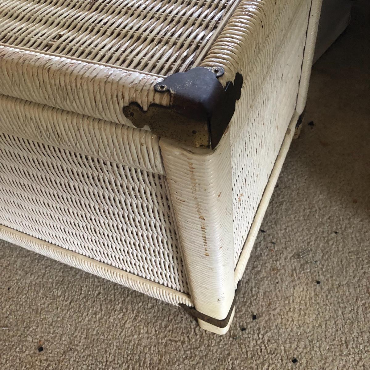 Store everything in this well made white wicker chest! It measures 32” x 18” x 17”. Note the metal corners and lock. There is no key. There is also some broken wicker and the back is loose. A clamp and some glue should help it become the sturdy chest it once was. Local pick up only.