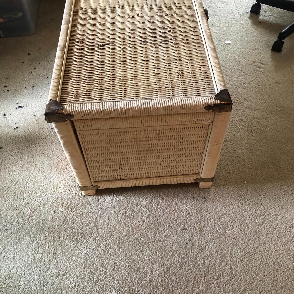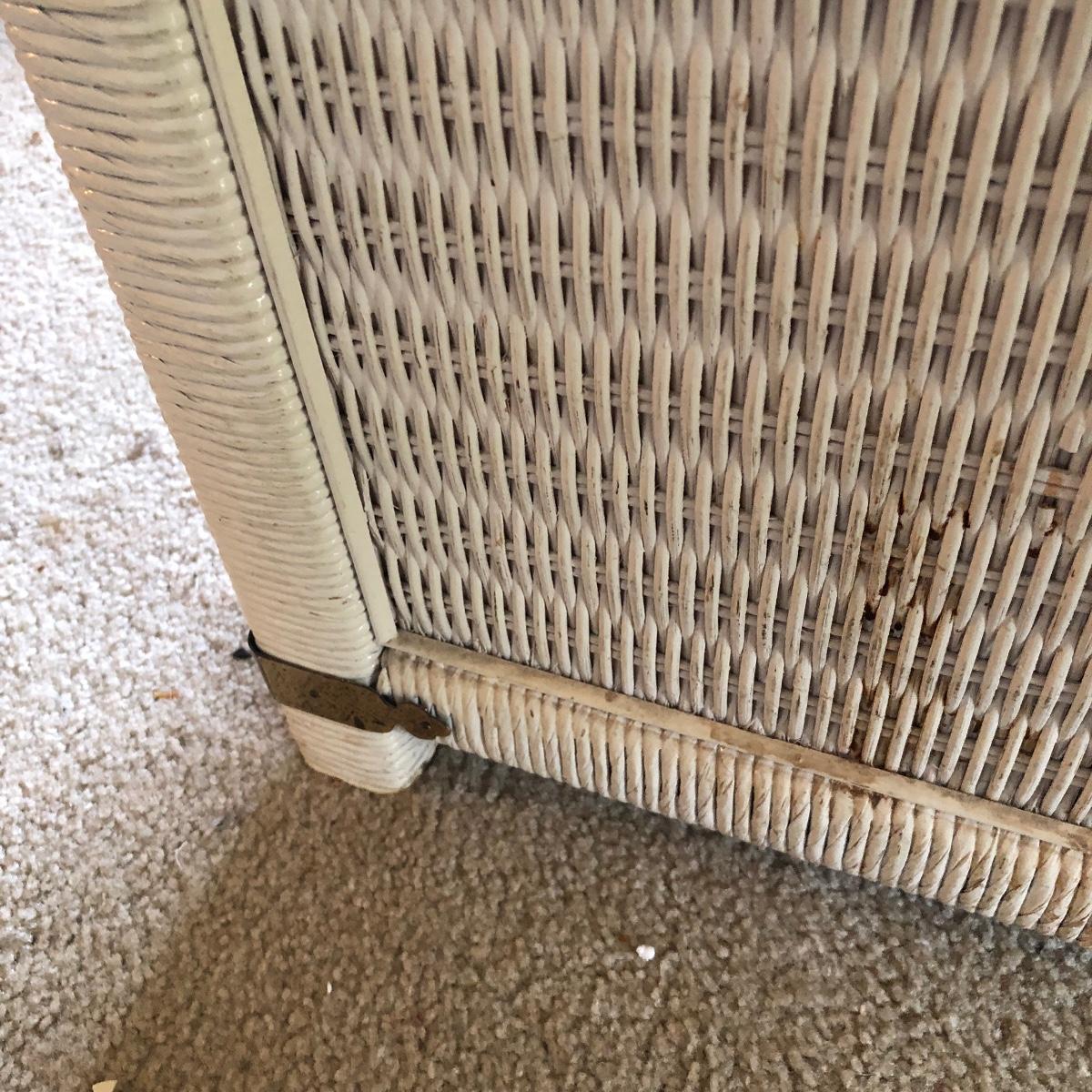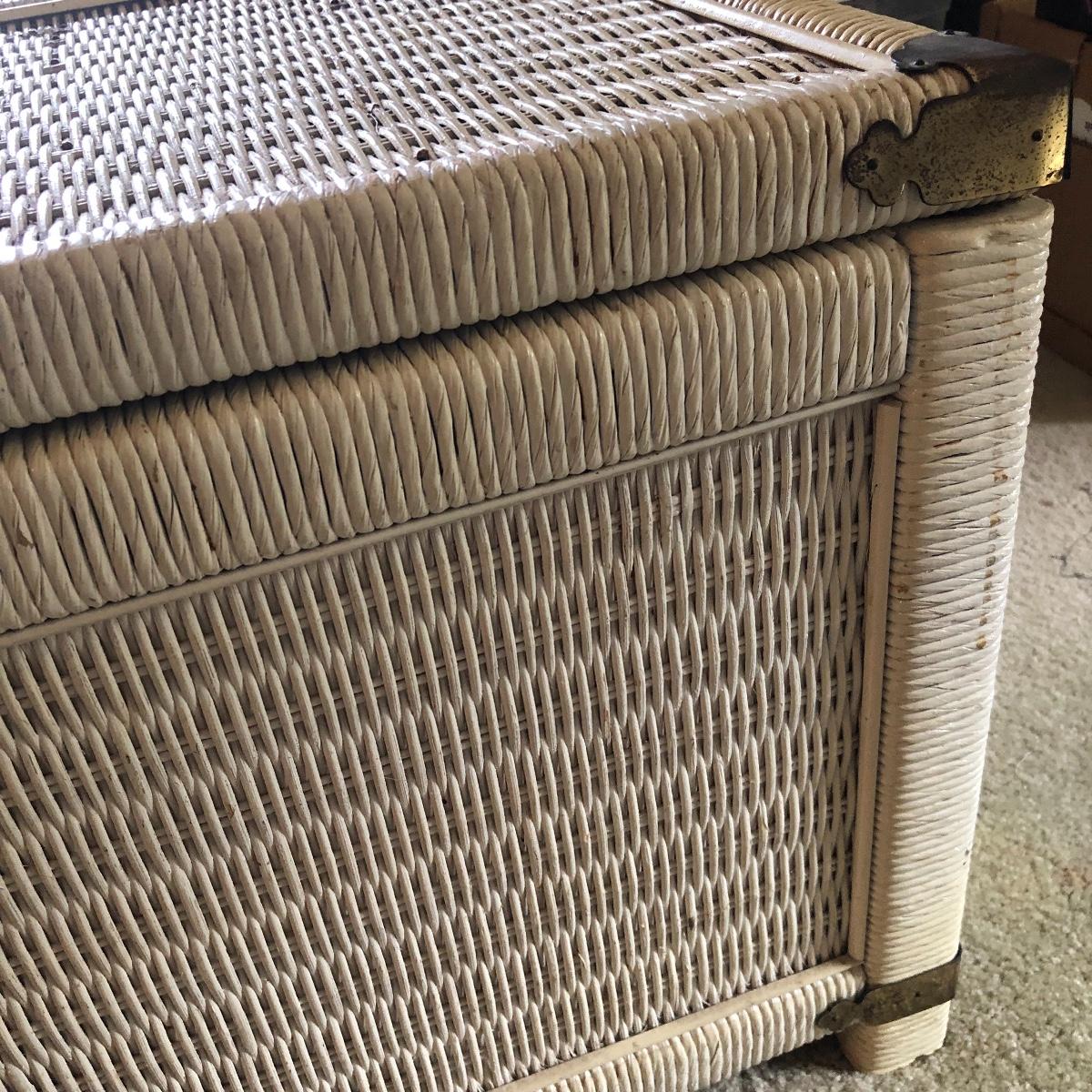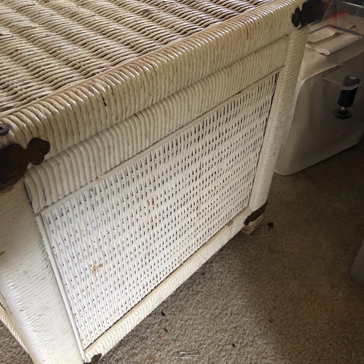 Store everything in this well made white wicker chest! It measures 32” x 18” x 17”. Note the metal corners and lock. There is no key. There is also some broken wicker and the back is loose. A clamp and some glue should help it become the sturdy chest it once was. Local pick up only.