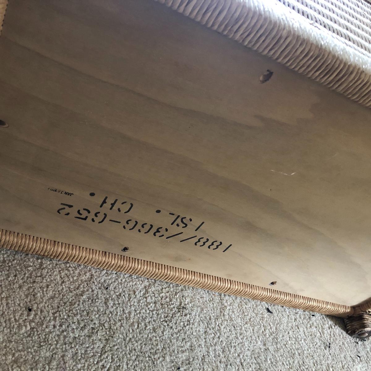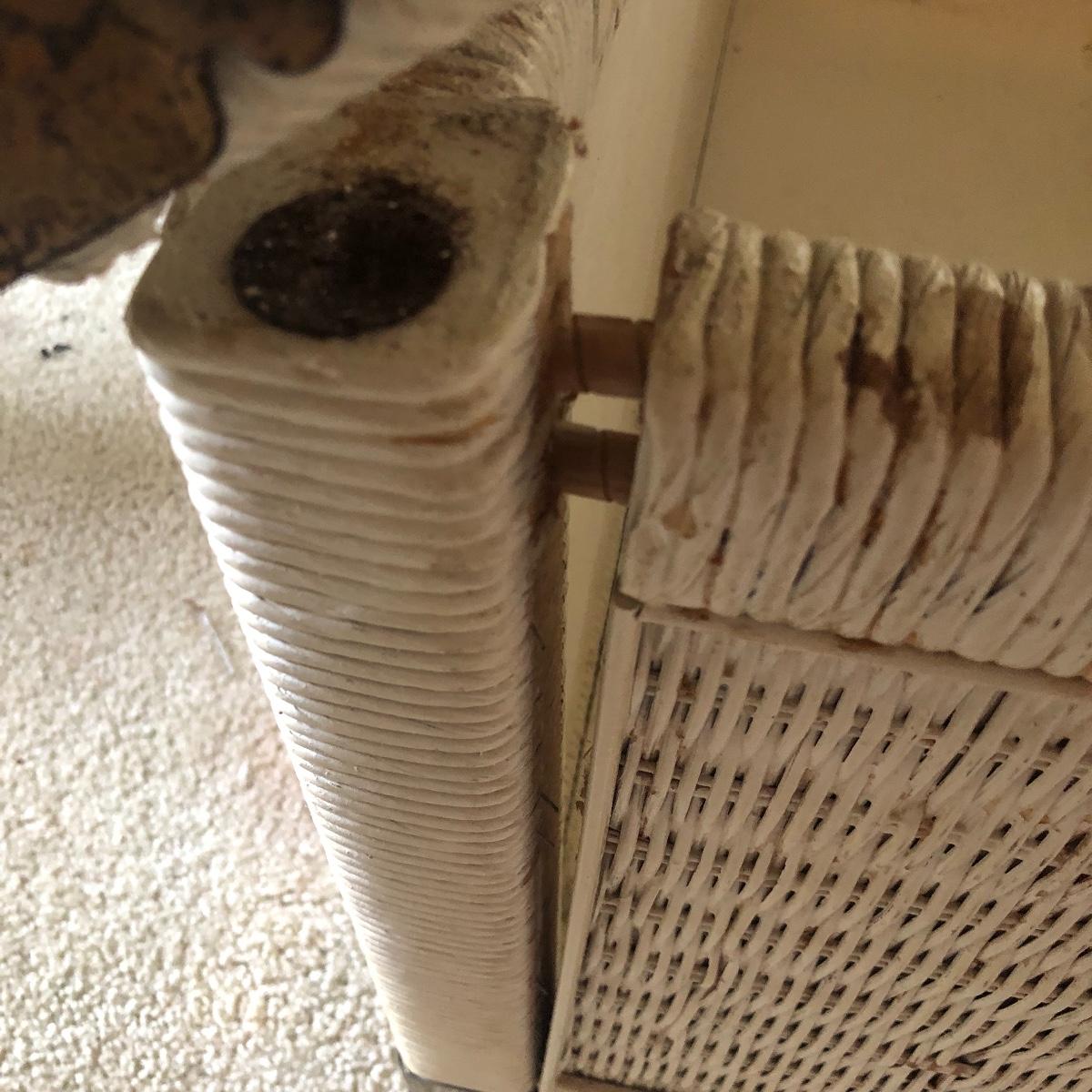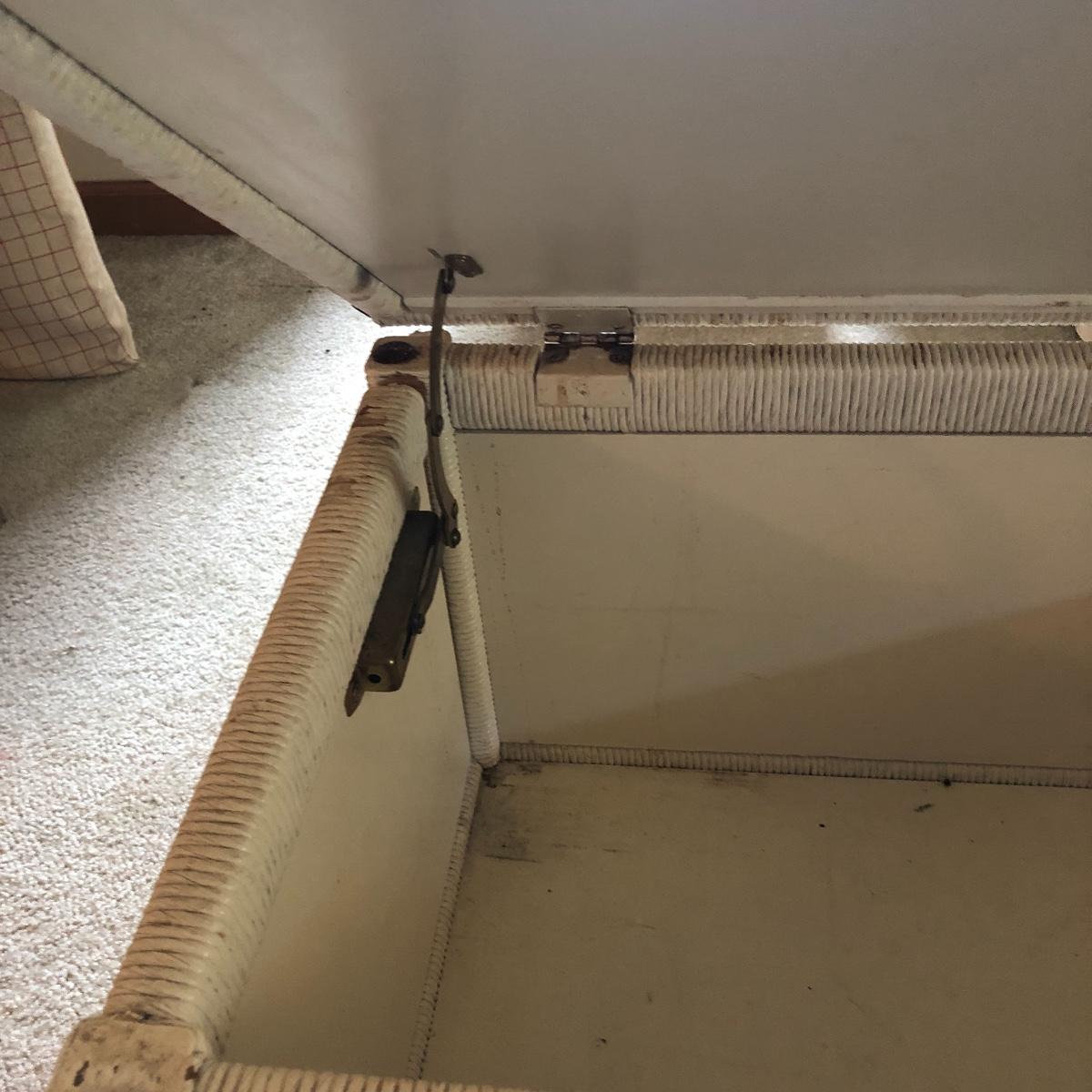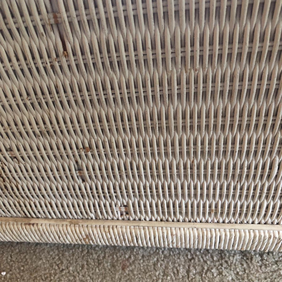Store everything in this well made white wicker chest! It measures 32” x 18” x 17”. Note the metal corners and lock. There is no key. There is also some broken wicker and the back is loose. A clamp and some glue should help it become the sturdy chest it once was. Local pick up only.