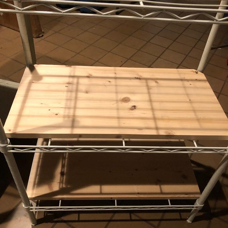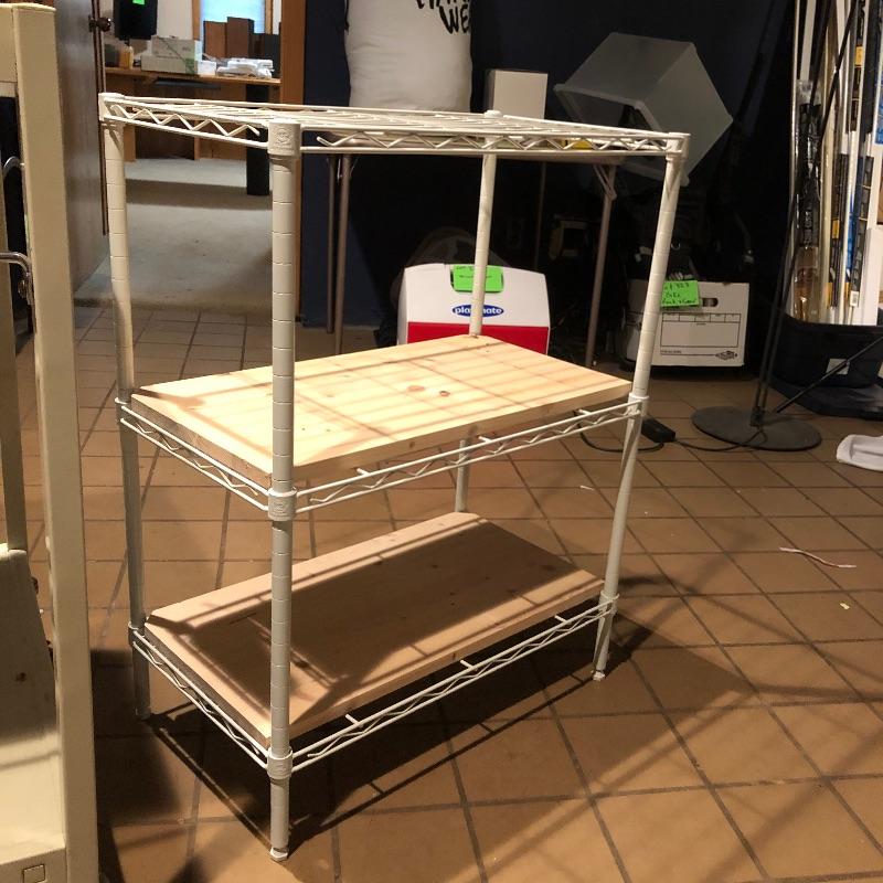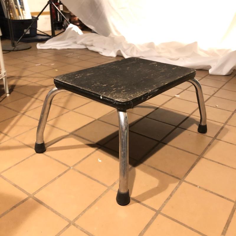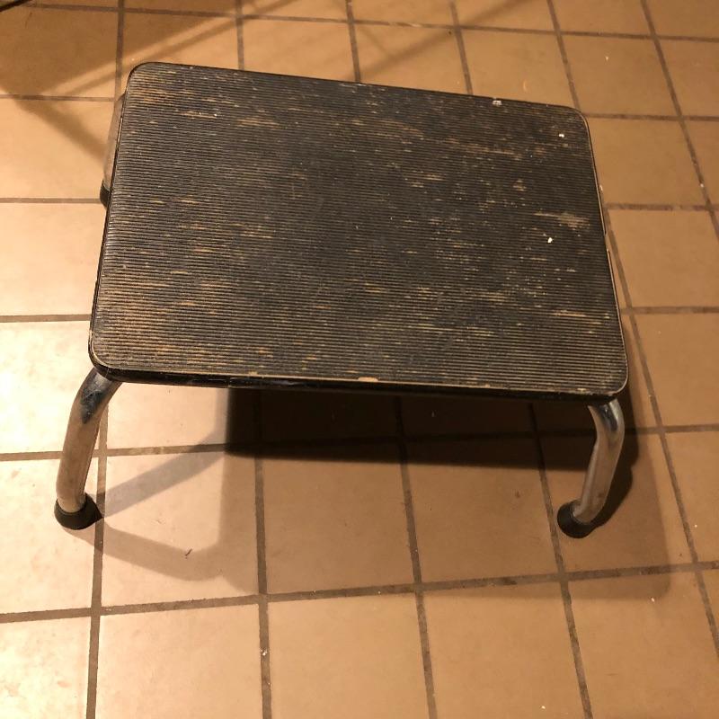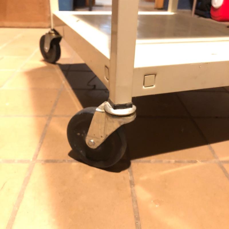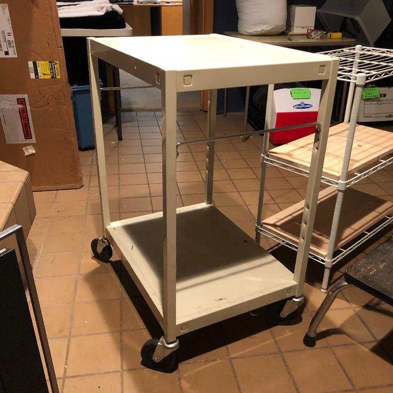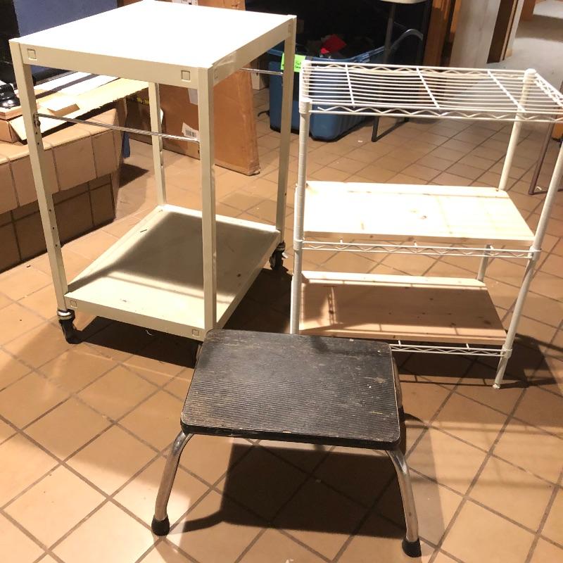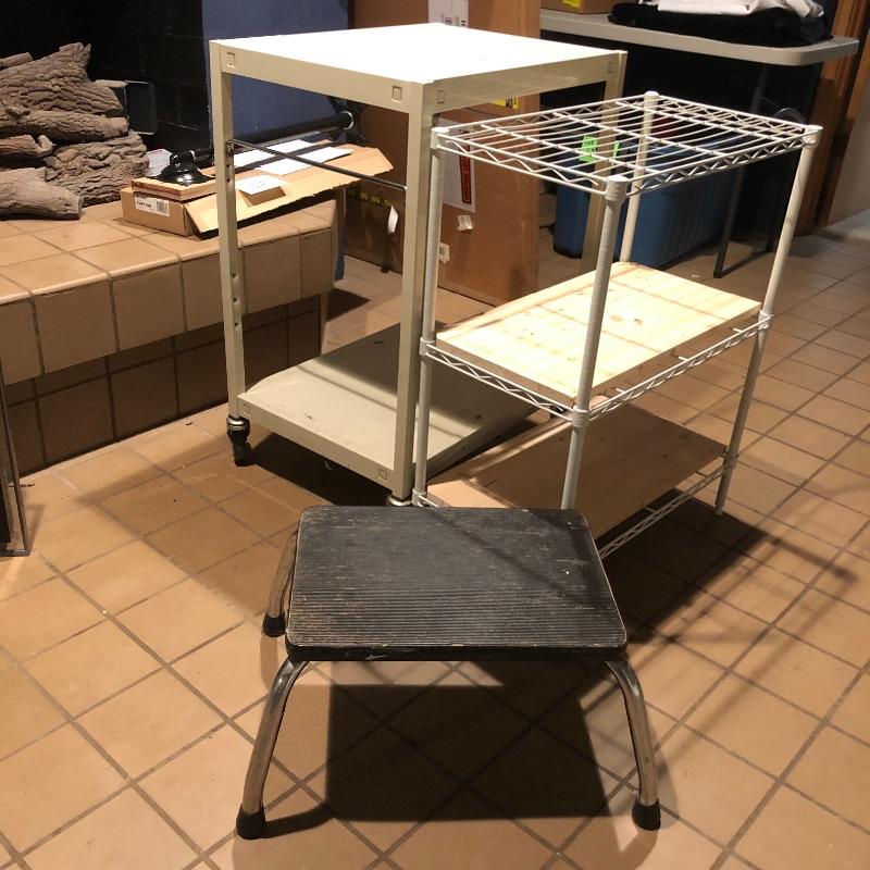 This rolling utility cart measures 18” x 24” x 34” has two shelves and lockable wheels that makes for a very useful unit. The bookcase has three shelves, two shelves have wood inserts and it measures 13” x 23” x 31”. Also included is a handy small step stool.