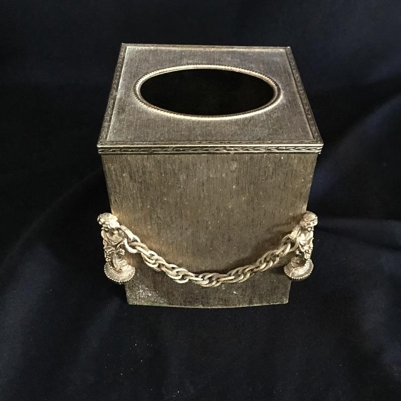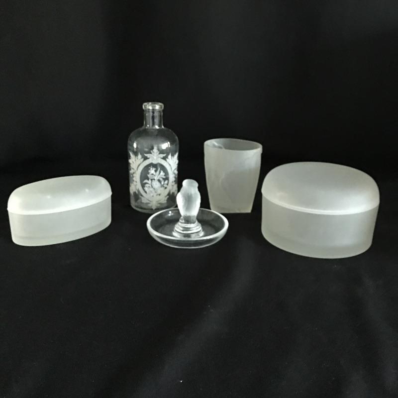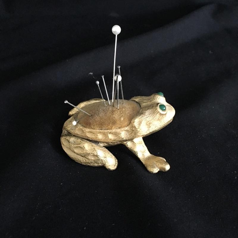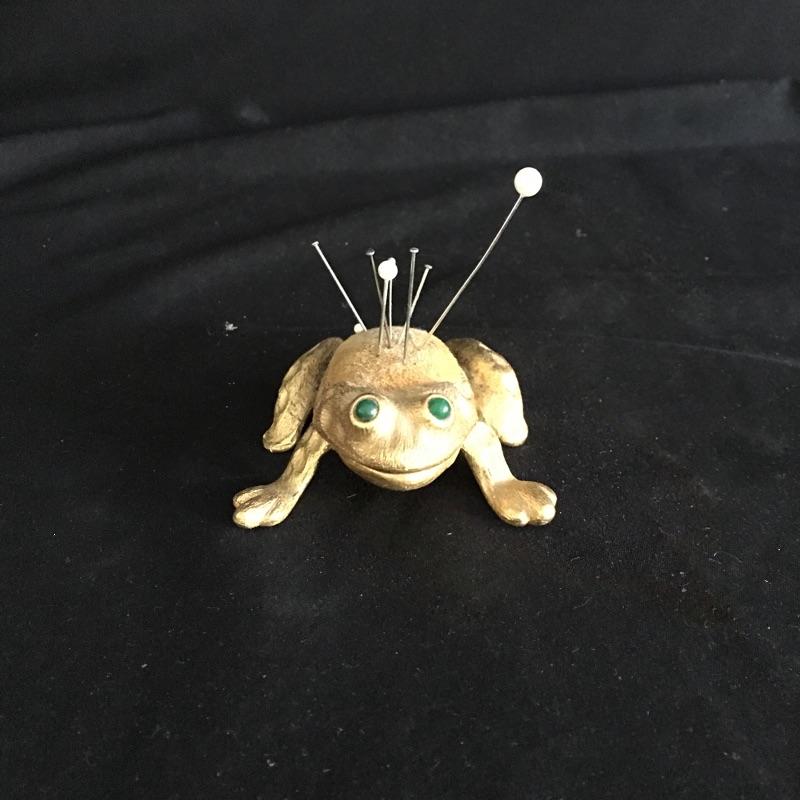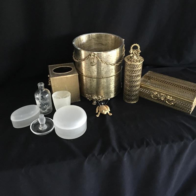 Selection of items for your vanity including a gold colored wastebasket, two tissue holders, frosted glass containers and a charming Rosenfeld by Lorenzo Frog pin cushion. Wastebasket measures 10.25” tall and 9.25” D.