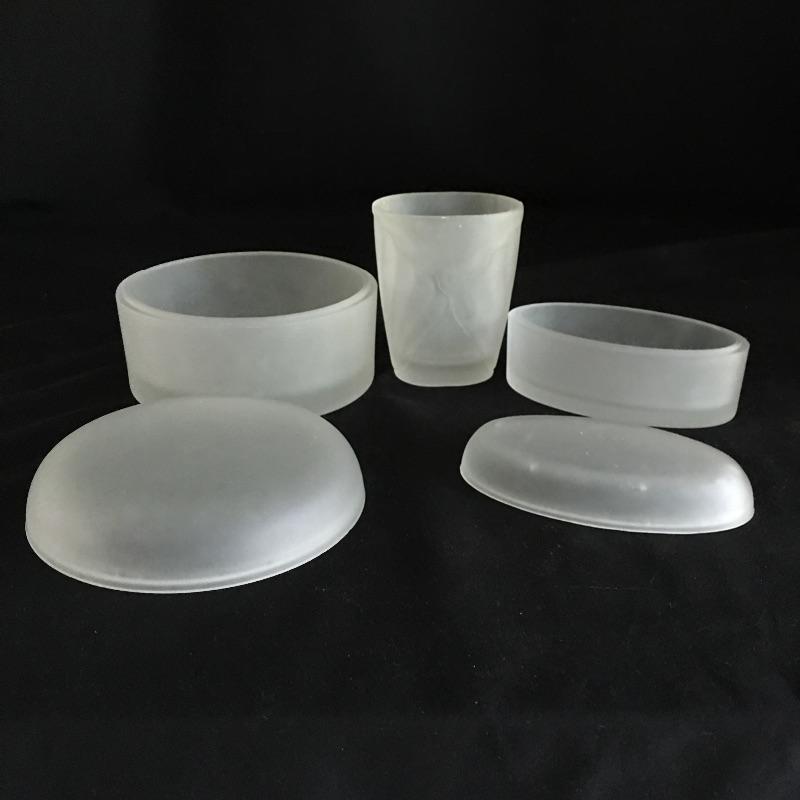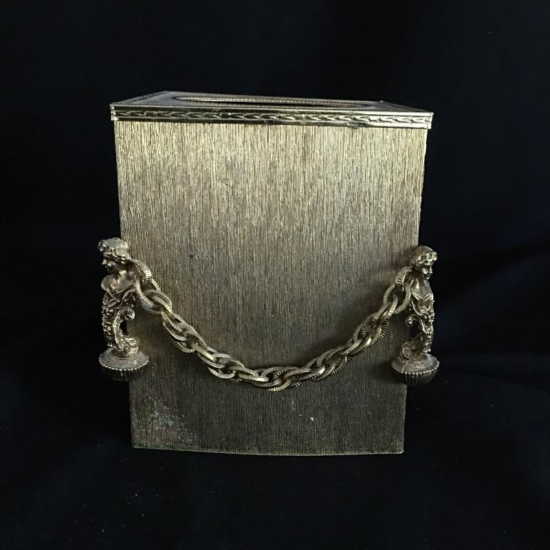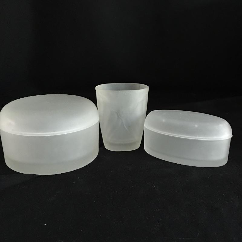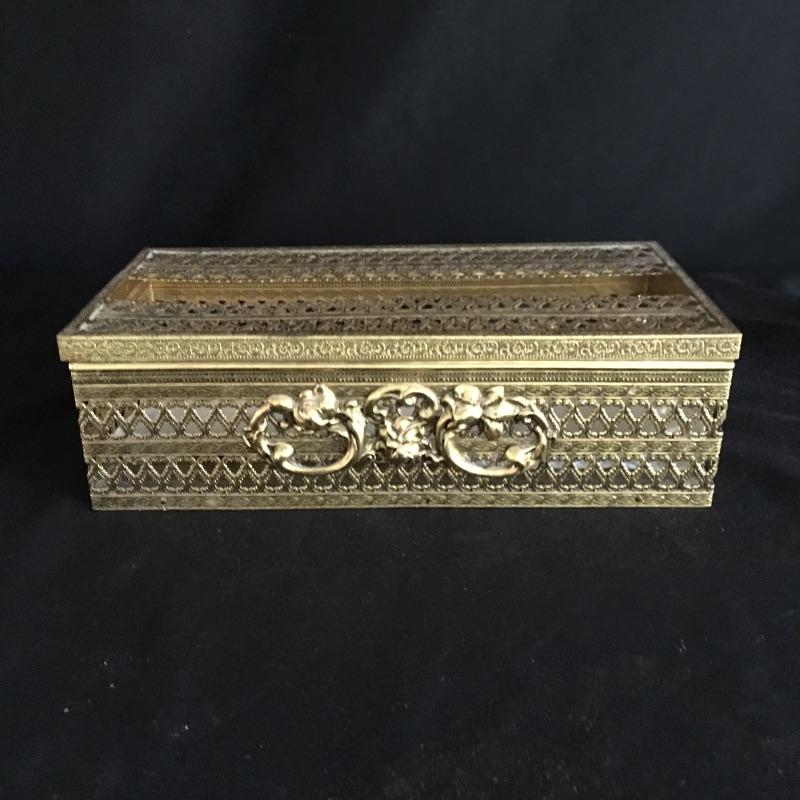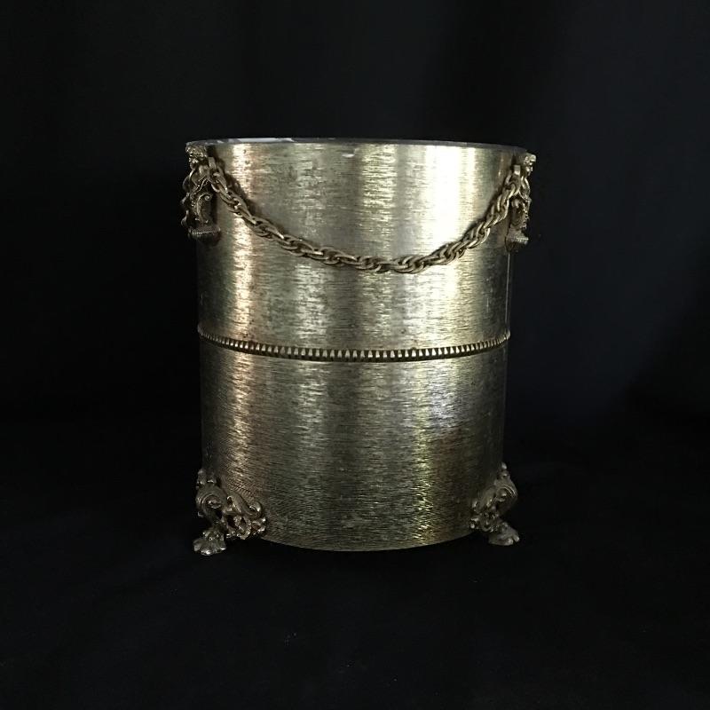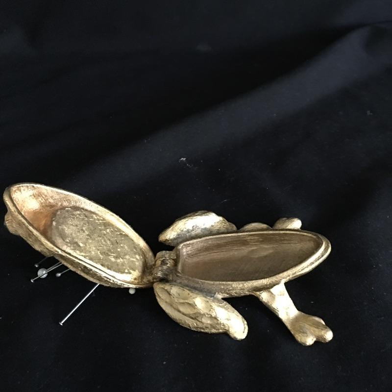Selection of items for your vanity including a gold colored wastebasket, two tissue holders, frosted glass containers and a charming Rosenfeld by Lorenzo Frog pin cushion. Wastebasket measures 10.25” tall and 9.25” D.