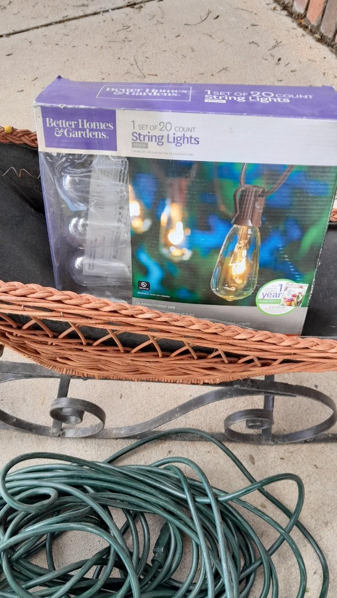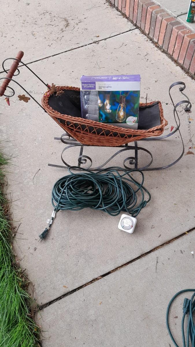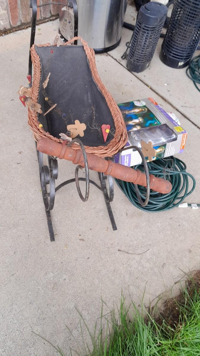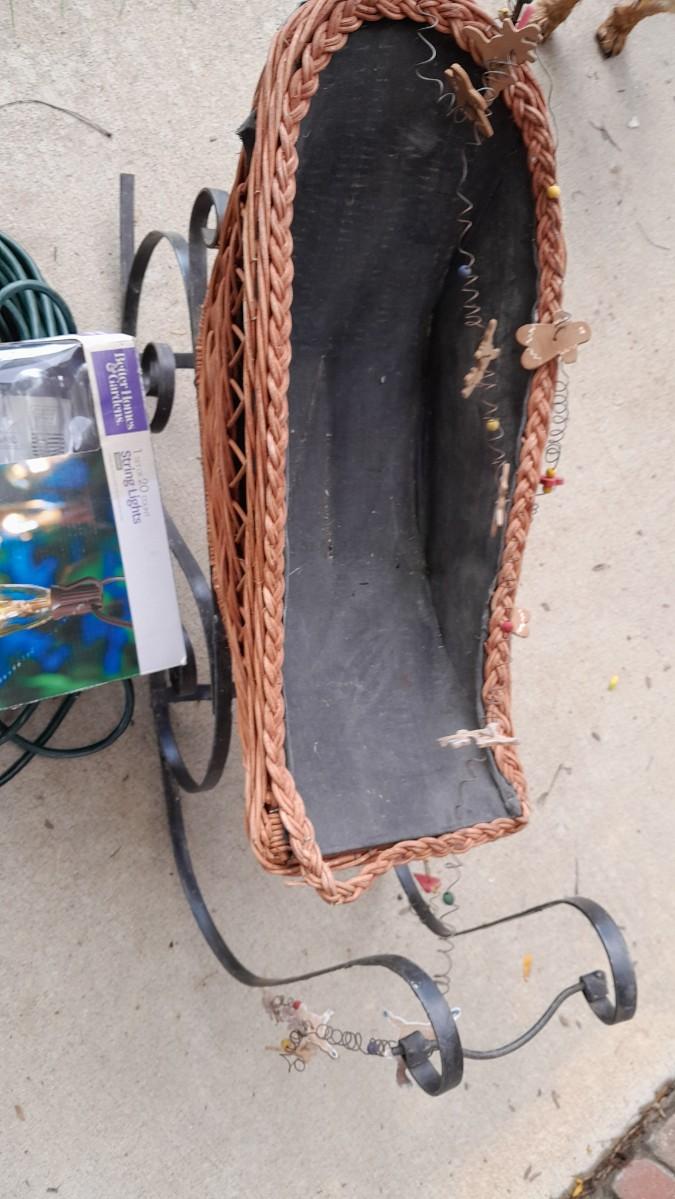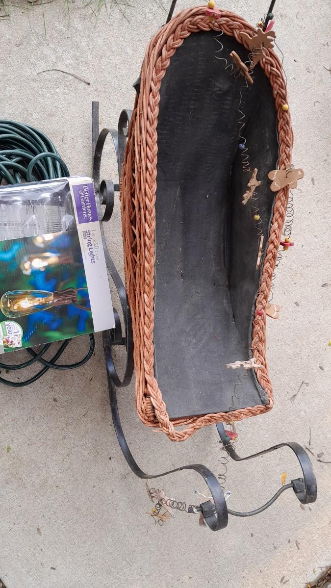 WICKER AND METAL CARRIAGE 25" X 30" X 10", GREEN EXTENSION CORD, STRING LIGHTS, AND SMALL STORE-BOUGHT QUILT THROW. 56" X 44"