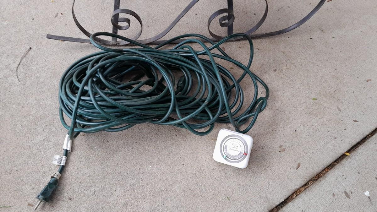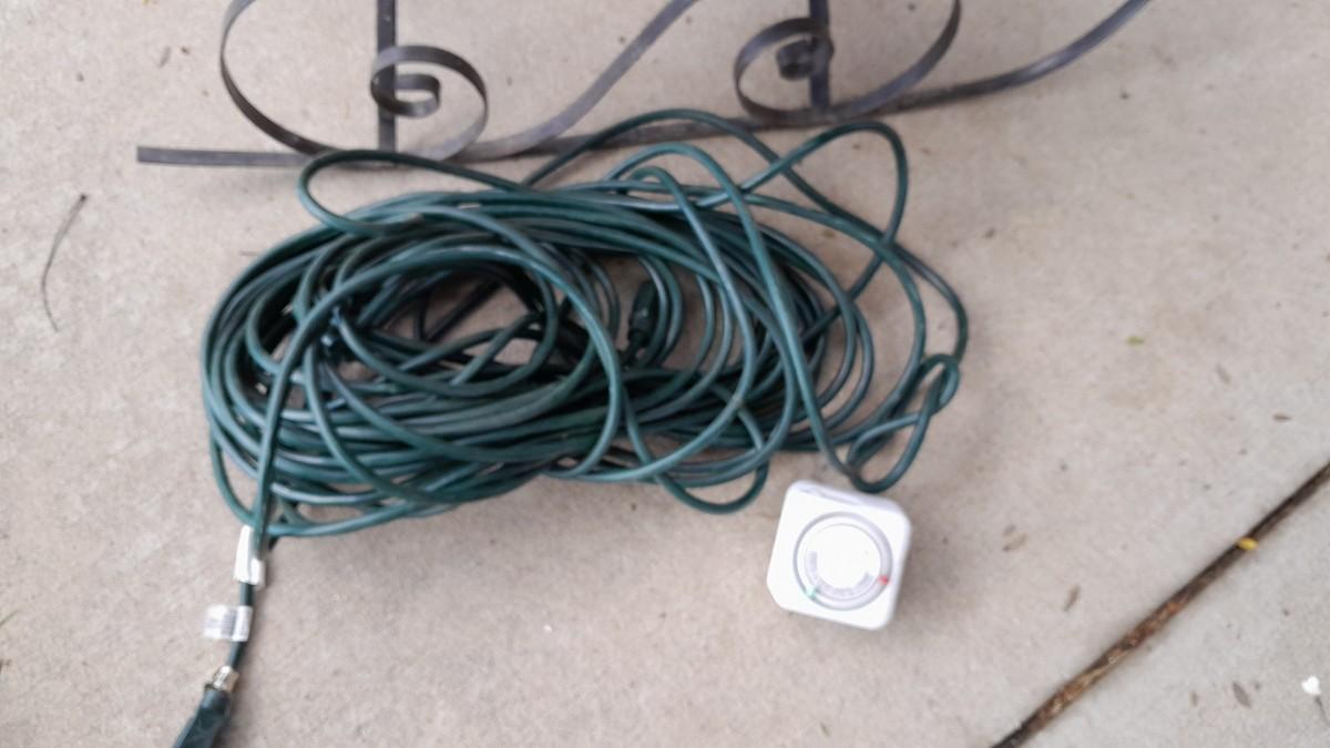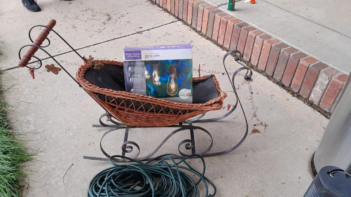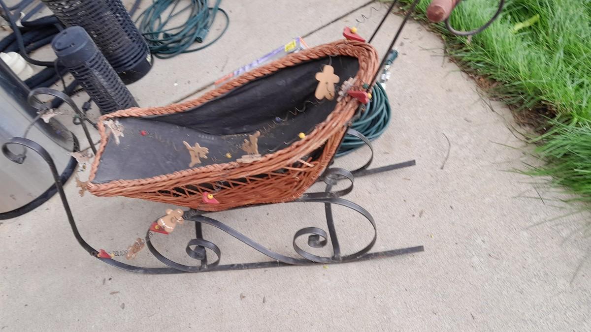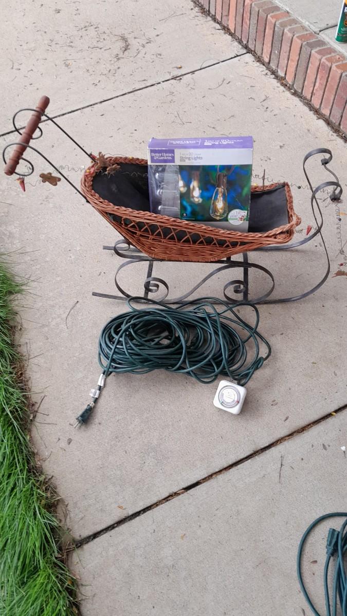 WICKER AND METAL CARRIAGE 25" X 30" X 10", GREEN EXTENSION CORD, STRING LIGHTS, AND SMALL STORE-BOUGHT QUILT THROW. 56" X 44"