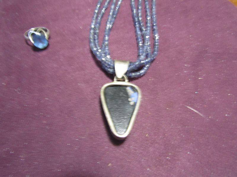 PURPLE MULTI STRAND SEED BEADS WITH IRIDESCENT PURPLE STONE SET IN STERLING SILVER