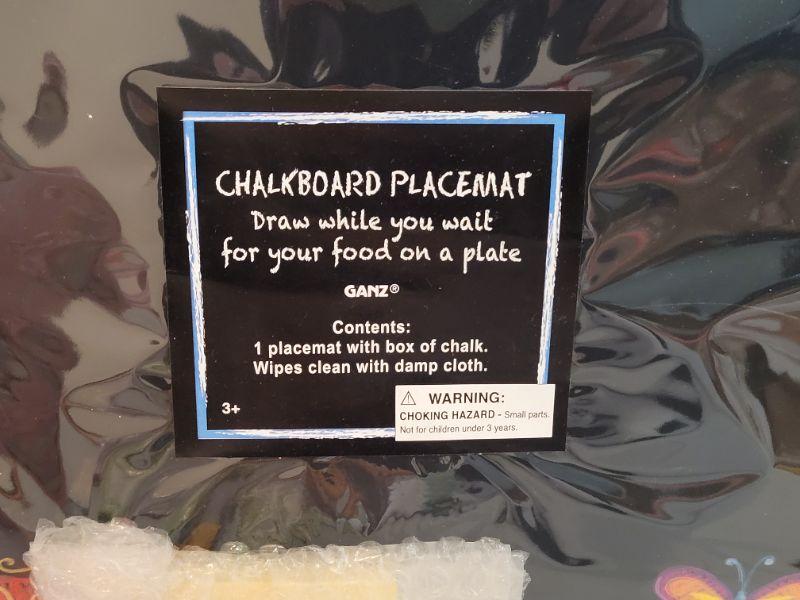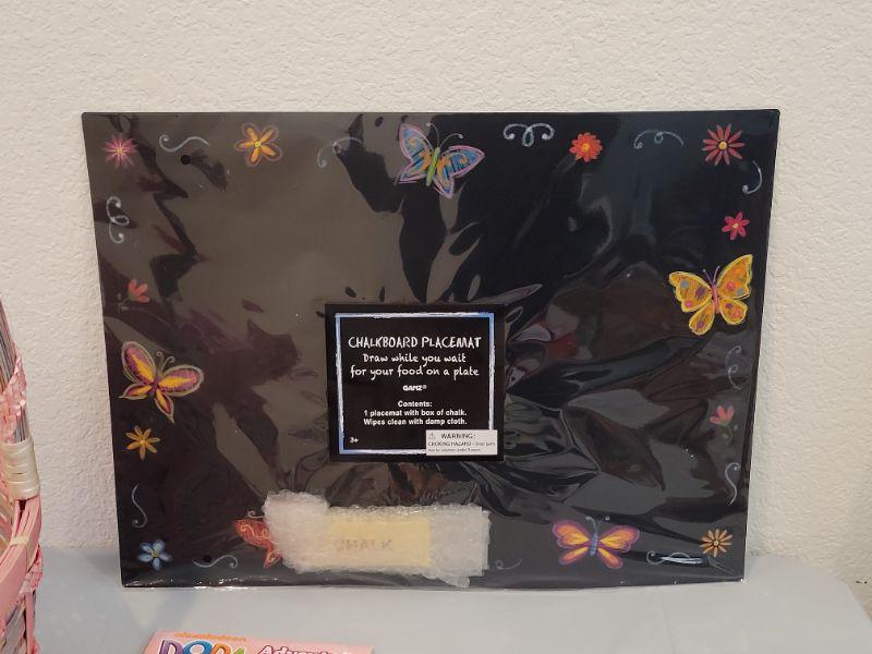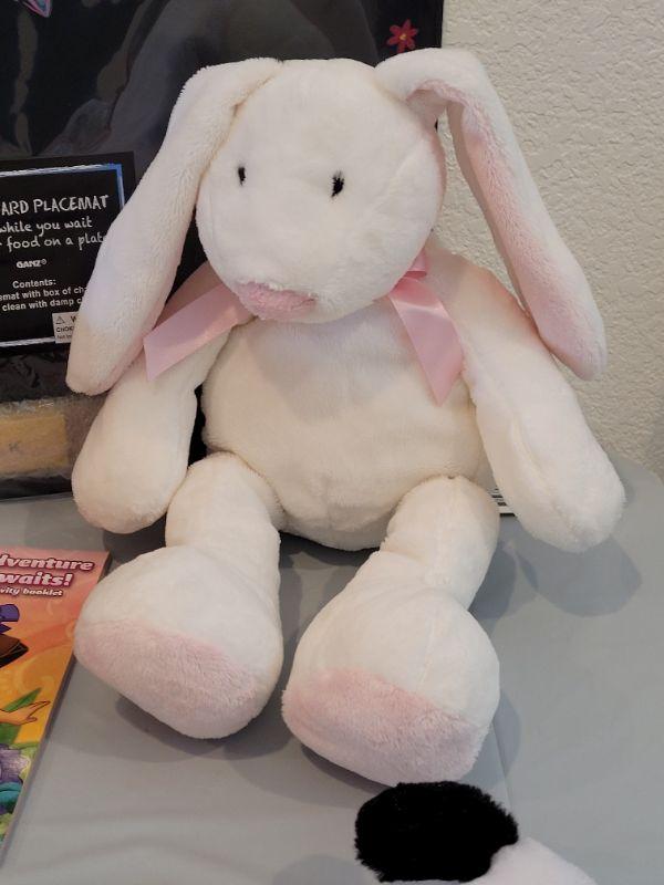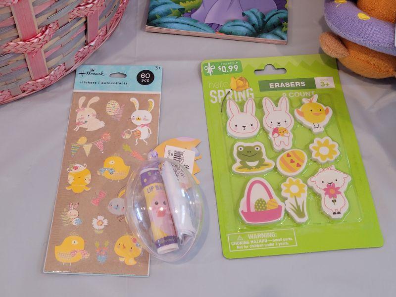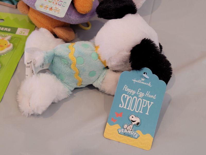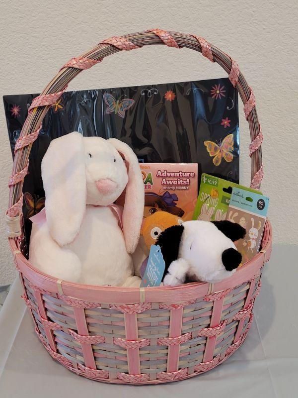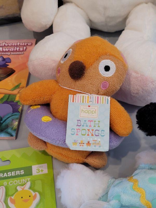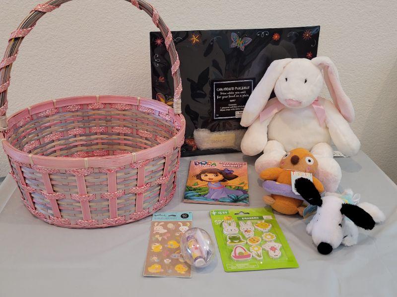 Lot 363: New Easter Basket with Chalkboard Placemat, Activity Pad, Erasers, Stickers, Lip Balm, Snoopy Bunny, Bath Sponge and White Plush Bunny
