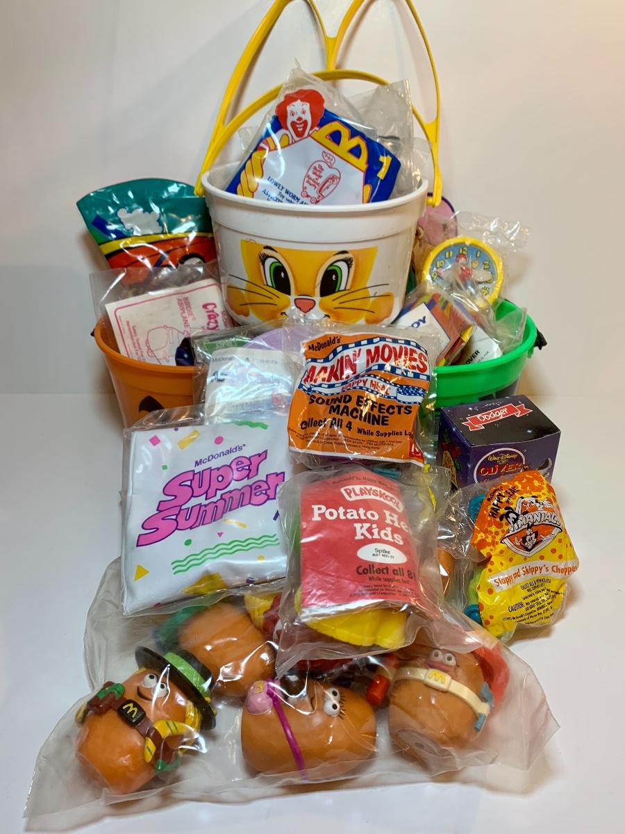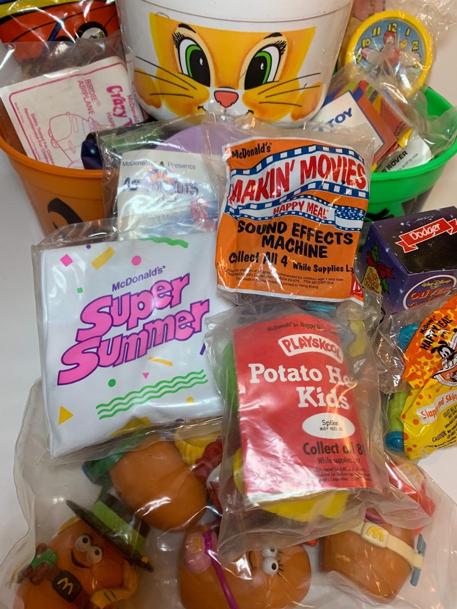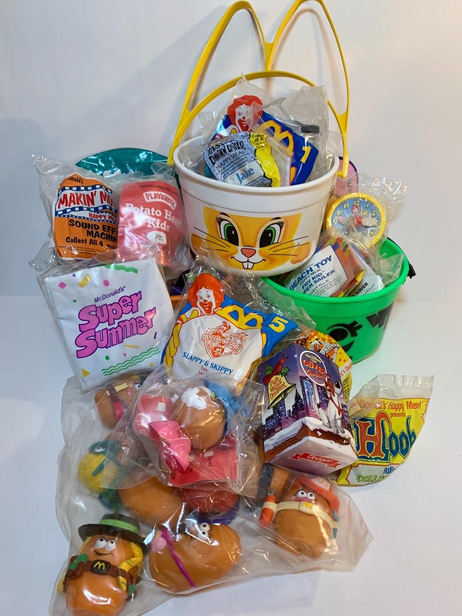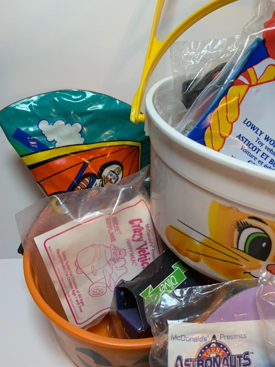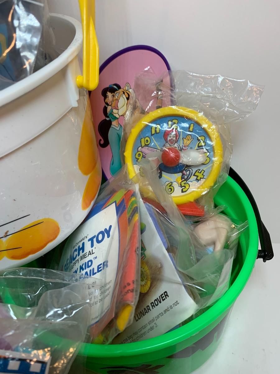 This lot includes vintage opened and unopened Happy Meal Toys along with 3 pails