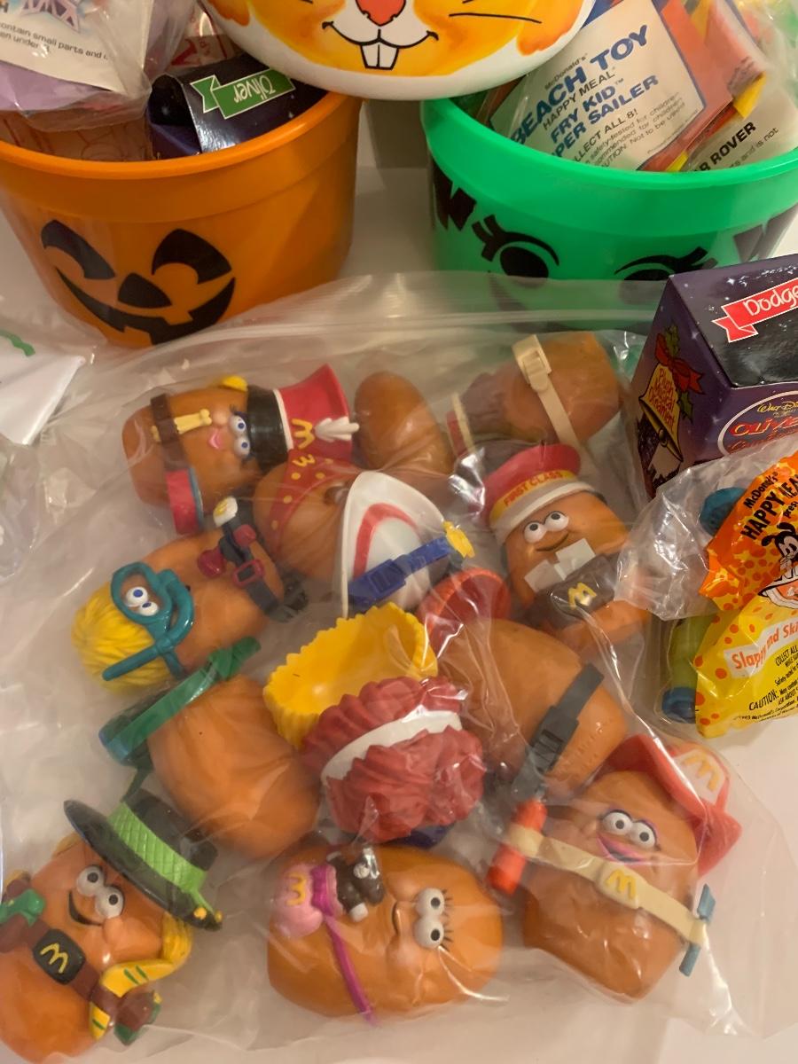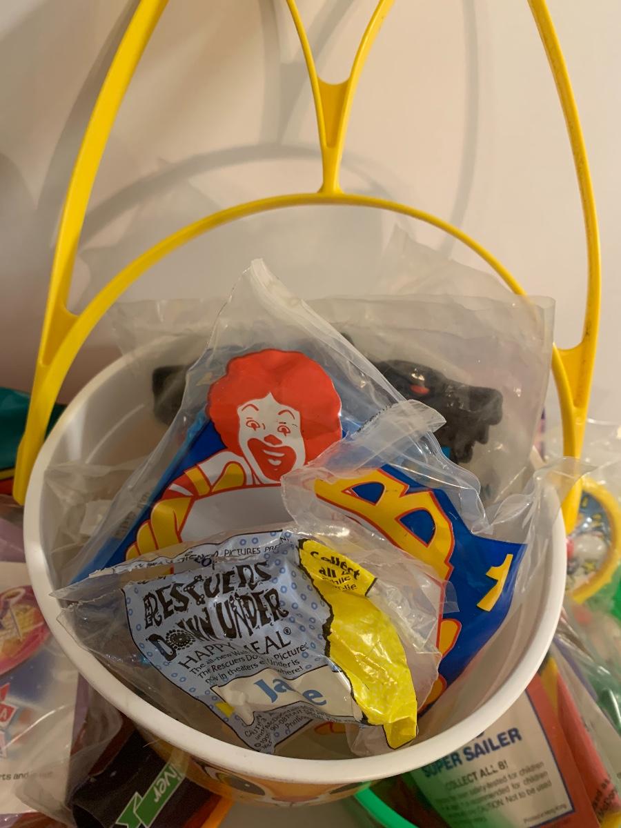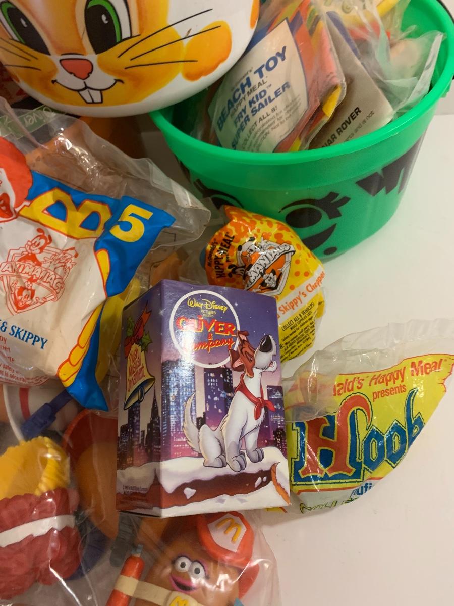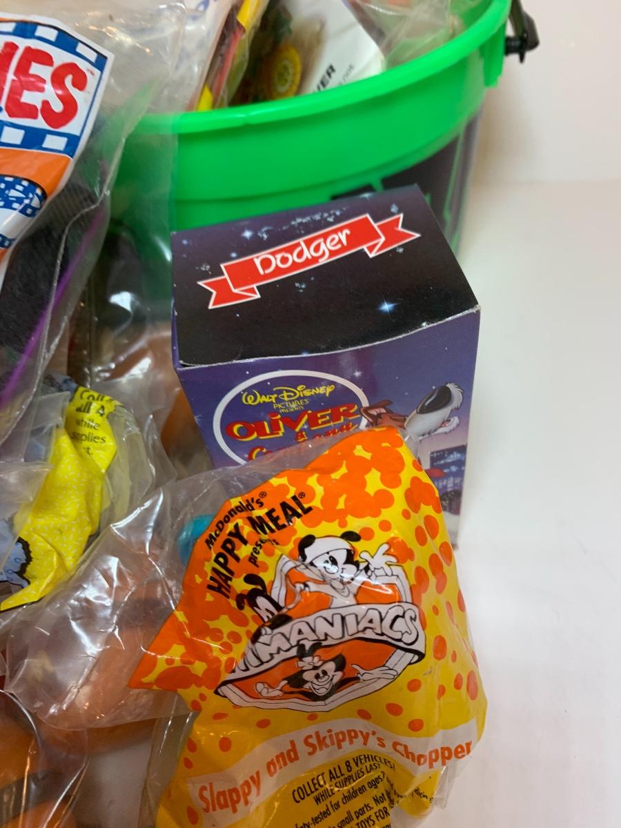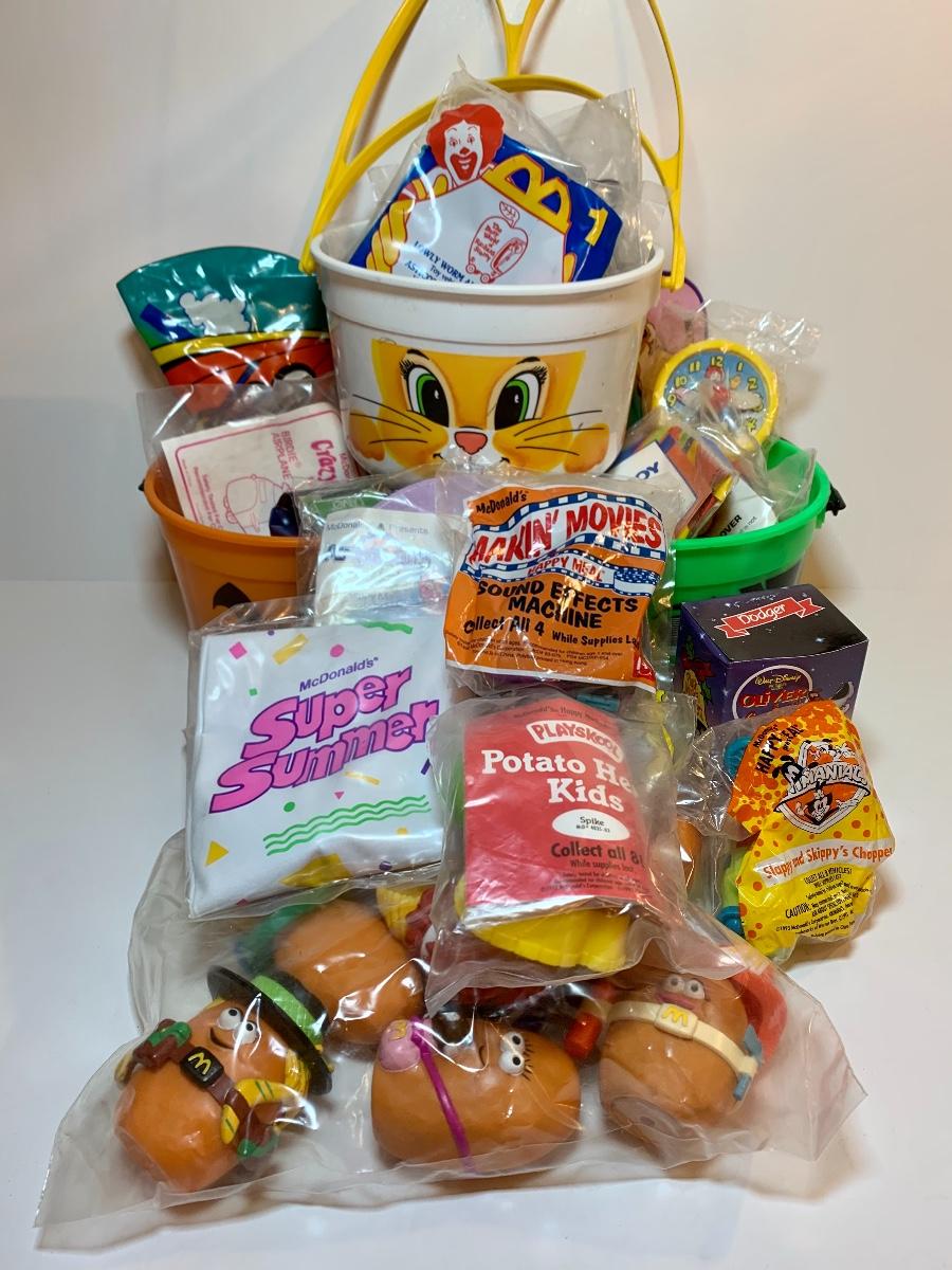 This lot includes vintage opened and unopened Happy Meal Toys along with 3 pails