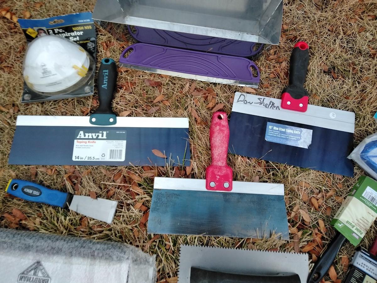NICE LOT OF DRY-WALL, AND PAINTING TOOLS, TAPIN KNIVES, PAN, CAULKING, PAINT BRUSHES, GLOVES, MASKS, AND MORE